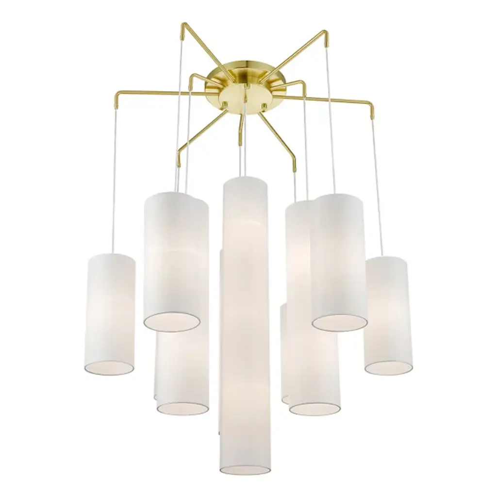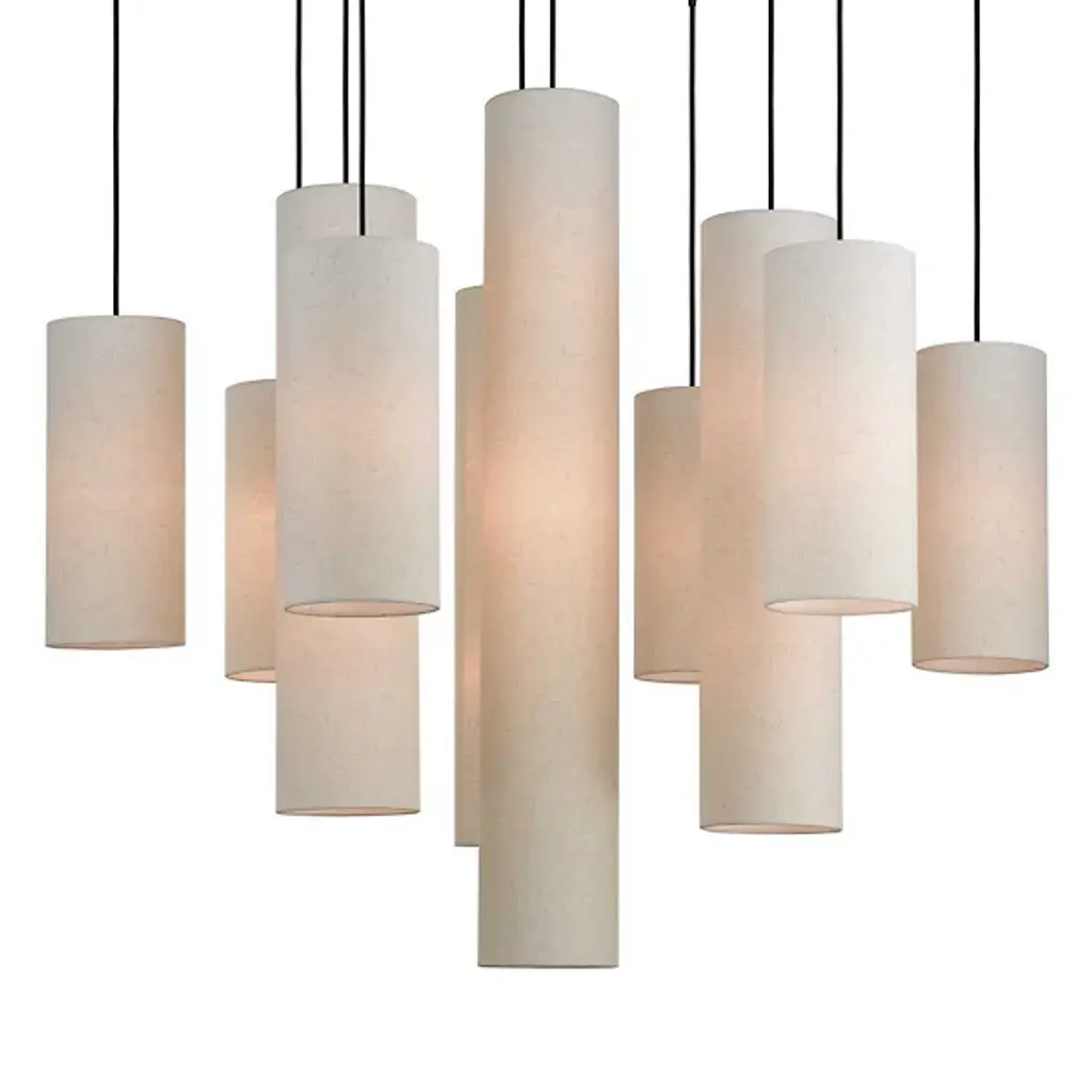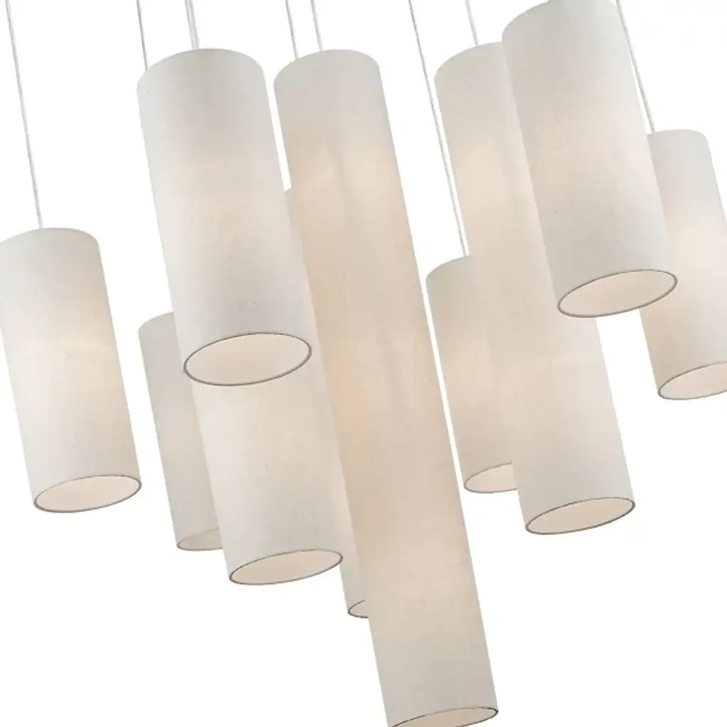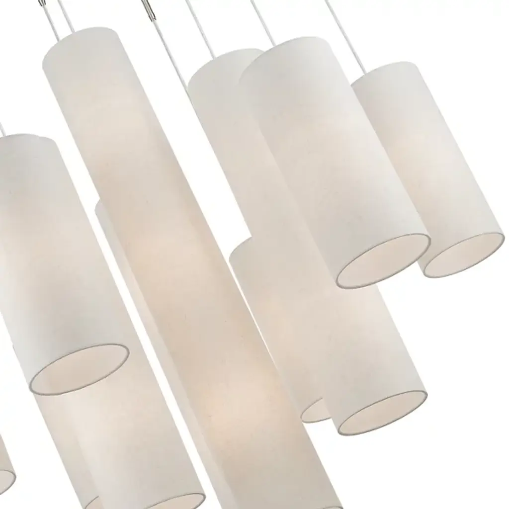 Grouped and radiating like an inspiring chorus. Introduce an elegant and stimulating display into your open spaces with the Dwayne Chandelier from Alder & Ore. The modern, contemporary space can appreciate the precision in the chandelier’s silhouette. It shoots out overhead with a radiating set of slender metal arms. Streaming cords hold up the shades with a feather-light visual. Each hardback fabric shade is crafted by hand into smooth cylinders with varying scale. The difference in scale of the shades presents a fresh silhouette depending on where you stand. Turn it on and watch as the cylinders transform into vessels of rich warmth. The radiant chorus lifts the room with a spacious glow.