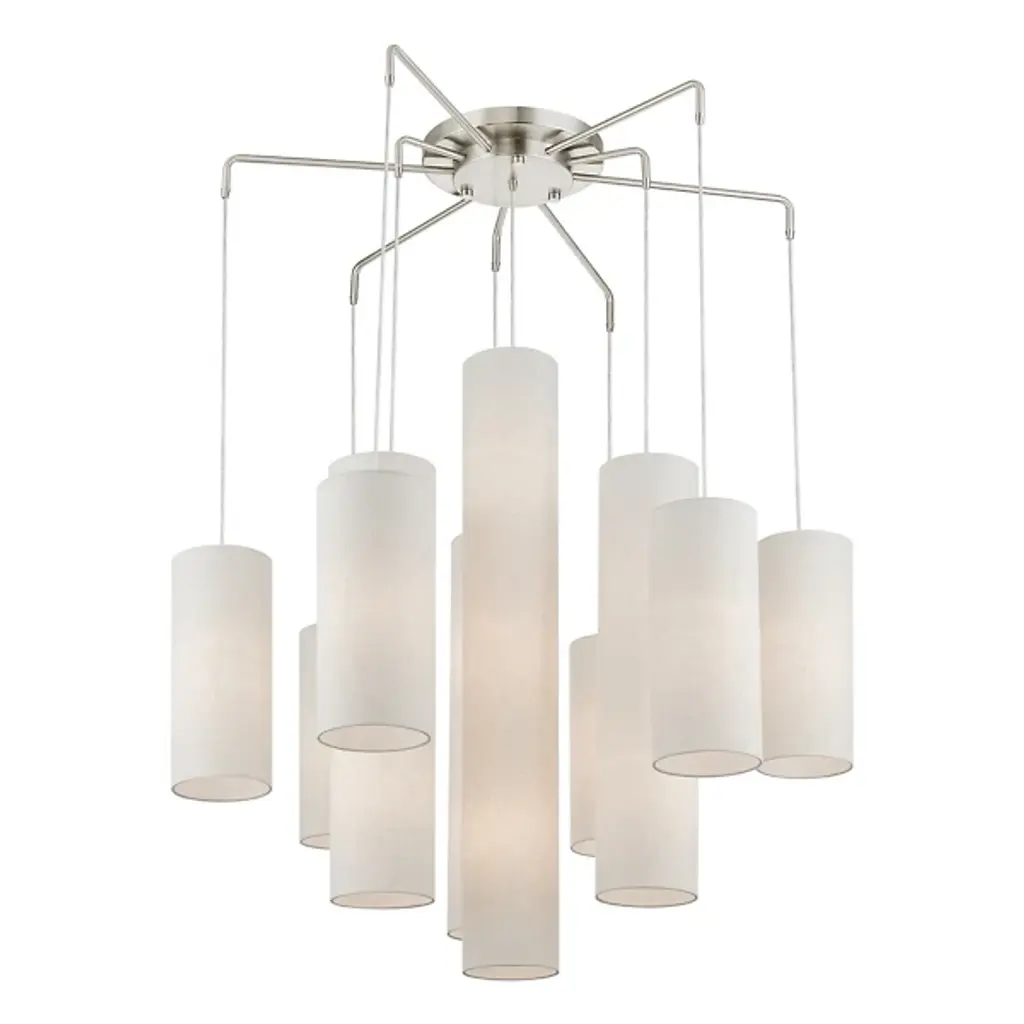 Grouped and radiating like an inspiring chorus. Introduce an elegant and stimulating display into your open spaces with the Dwayne Chandelier from Alder & Ore. The modern, contemporary space can appreciate the precision in the chandelier’s silhouette. It shoots out overhead with a radiating set of slender metal arms. Streaming cords hold up the shades with a feather-light visual. Each hardback fabric shade is crafted by hand into smooth cylinders with varying scale. The difference in scale of the shades presents a fresh silhouette depending on where you stand. Turn it on and watch as the cylinders transform into vessels of rich warmth. The radiant chorus lifts the room with a spacious glow.