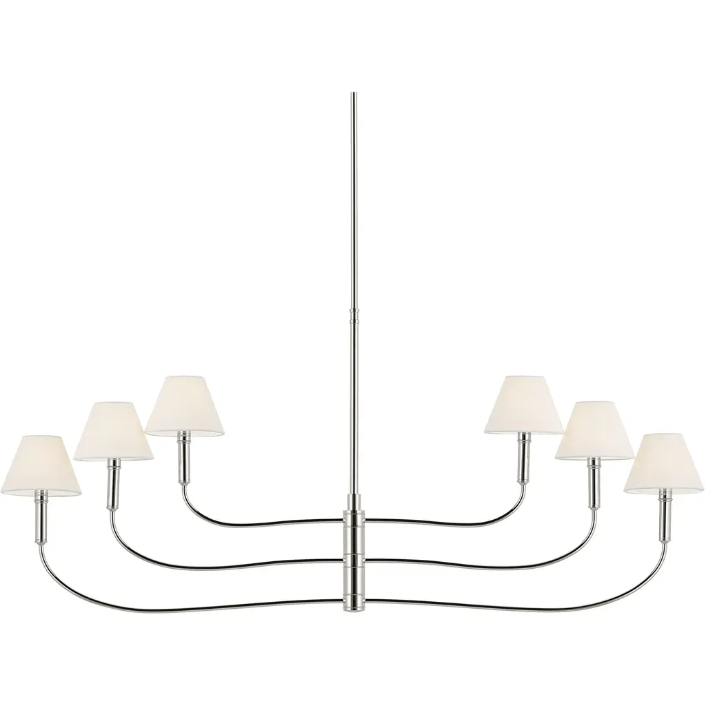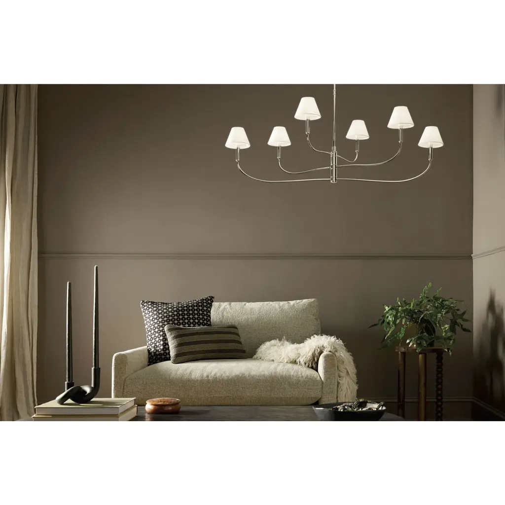 The Eadie chandelier balances old-world charm with modern flexibility. Rotate the top and bottom arms in round and linear formations for the look you desire. Below each white fabric shade is a removable clear glass diffuser. A subtle decorative detail adorns the candle sleeves and at the top of the fixture. This attention to detail makes this piece truly timeless.