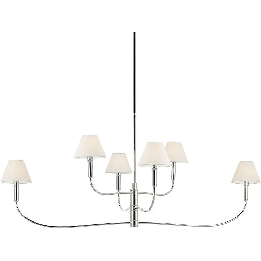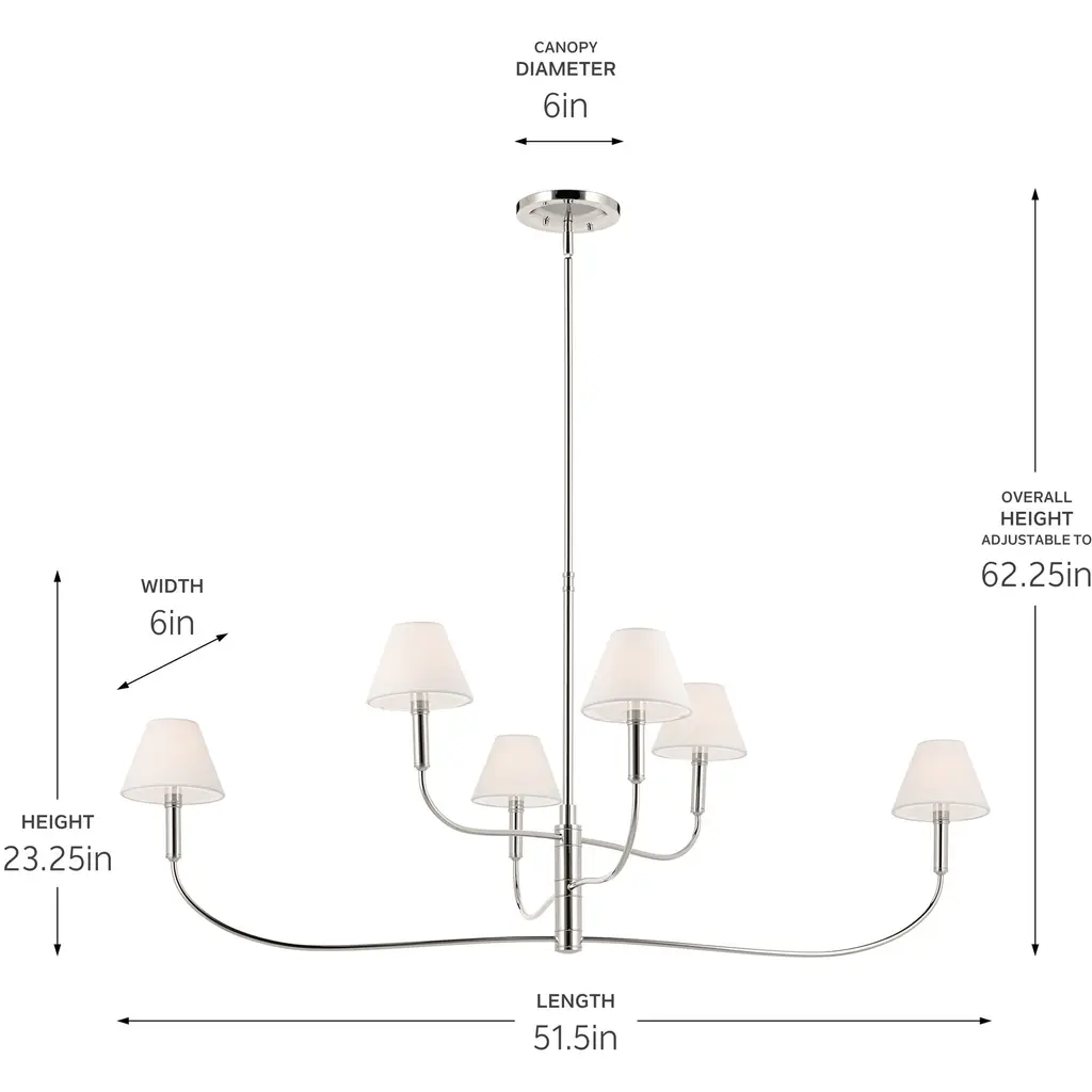 The Eadie chandelier balances old-world charm with modern flexibility. Rotate the top and bottom arms in round and linear formations for the look you desire. Below each white fabric shade is a removable clear glass diffuser. A subtle decorative detail adorns the candle sleeves and at the top of the fixture. This attention to detail makes this piece truly timeless.