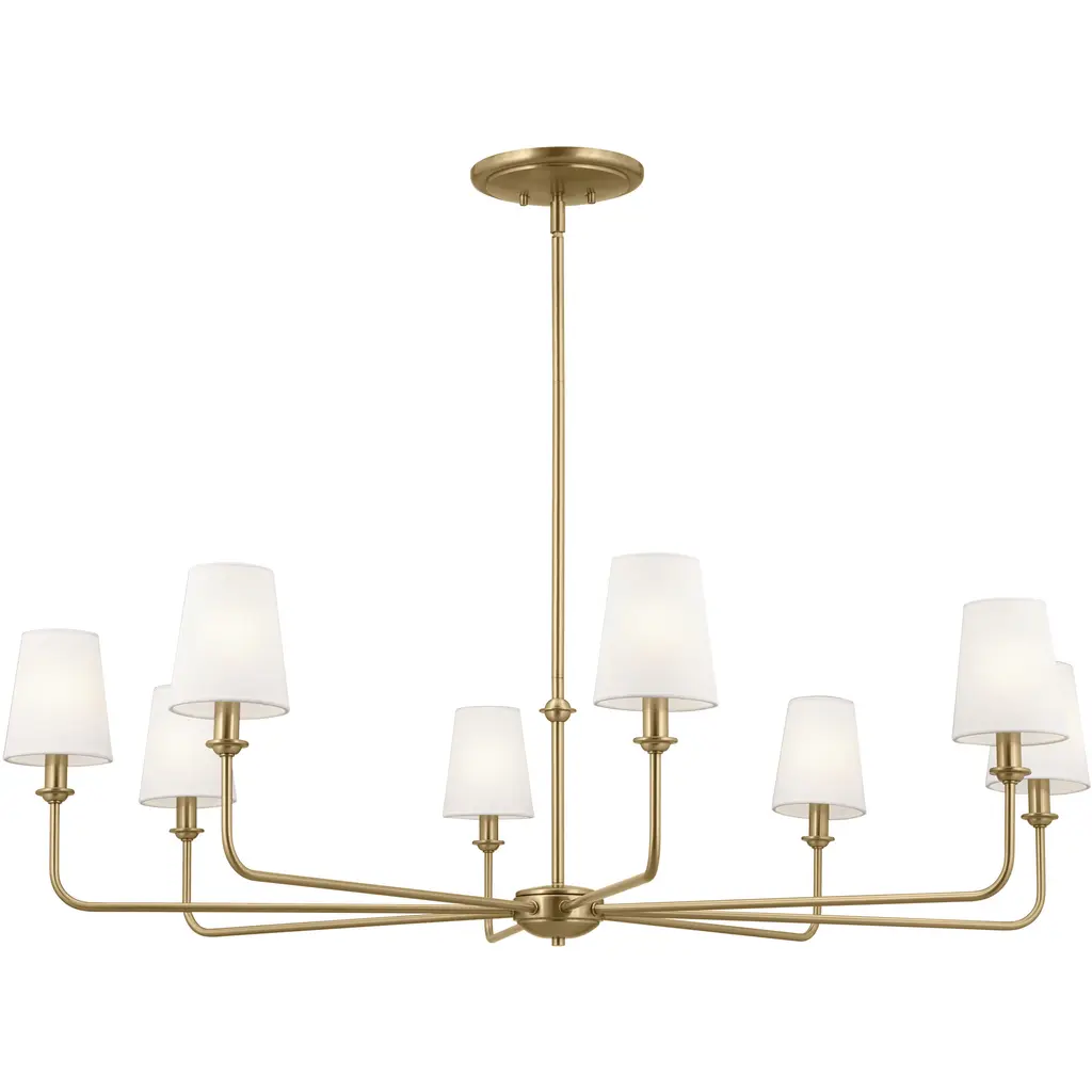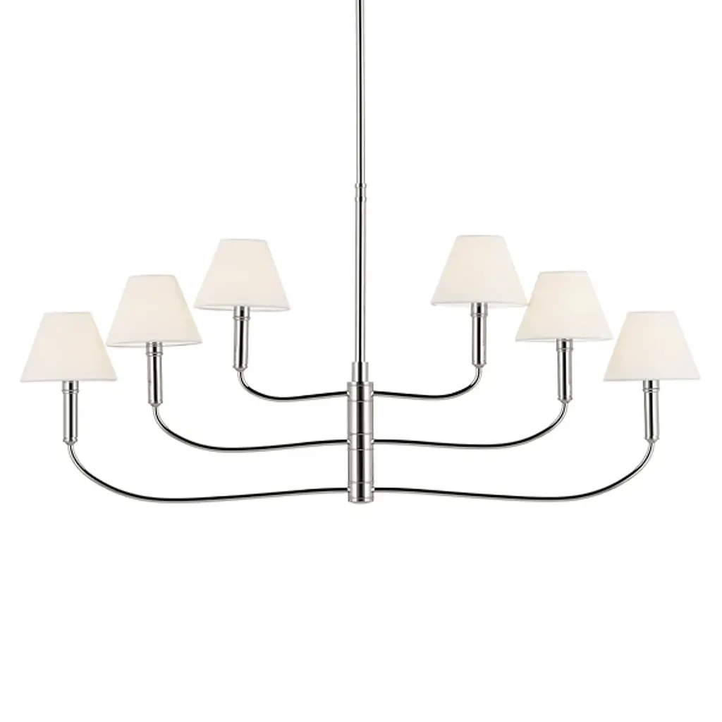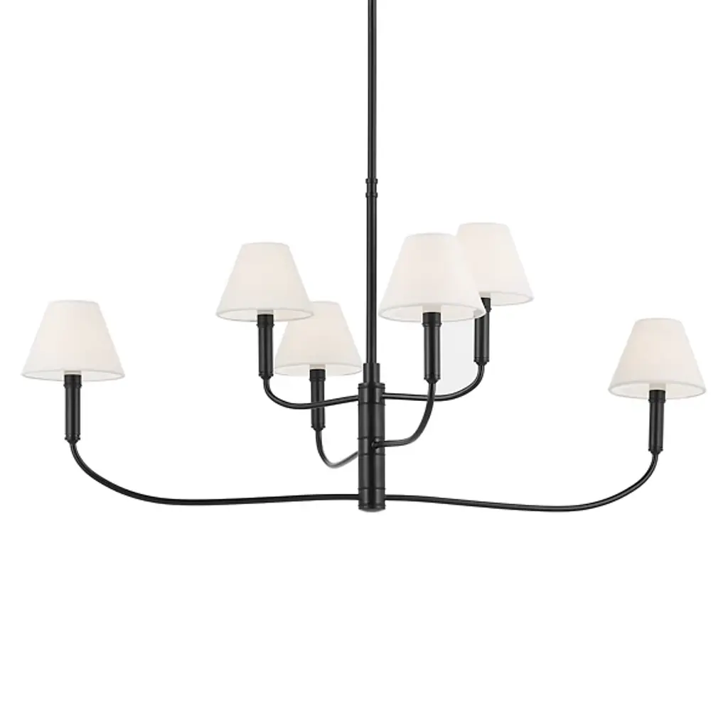 The Eadie Multi Tier Chandelier from Kichler uses arcing steel arms to update a traditional chandelier design with more straightforward modern elements. Suspending from above via a slim central stem, it uses a circular hub to extend slender arms outward, each one placing a candelabra socket inside a conical fabric shade. Each shade’s open base is filled by a clear glass disc diffuser, ensuring that even the downlight is mellowed from direct glare into a more restrained glow, while fine details on the candle catch the light and show the design’s incredible attention to detail.
