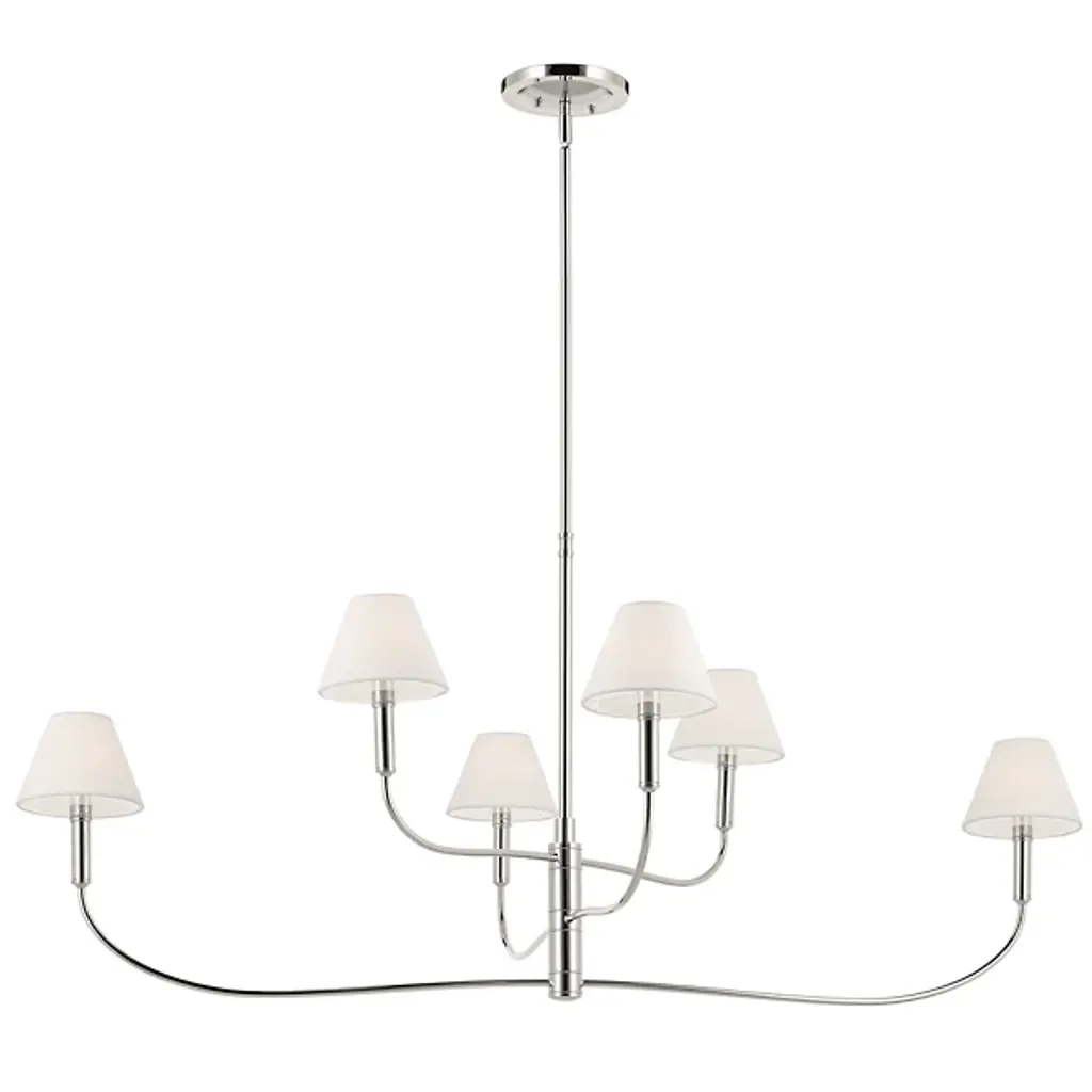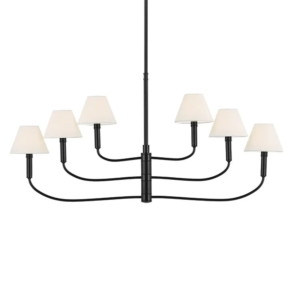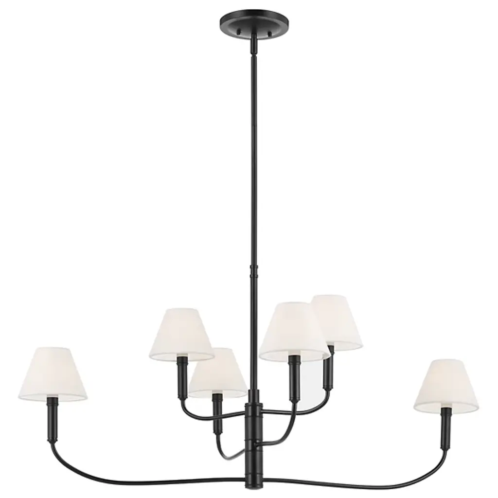 The Eadie Multi Tier Chandelier from Kichler uses arcing steel arms to update a traditional chandelier design with more straightforward modern elements. Suspending from above via a slim central stem, it uses a circular hub to extend slender arms outward, each one placing a candelabra socket inside a conical fabric shade. Each shade’s open base is filled by a clear glass disc diffuser, ensuring that even the downlight is mellowed from direct glare into a more restrained glow, while fine details on the candle catch the light and show the design’s incredible attention to detail.