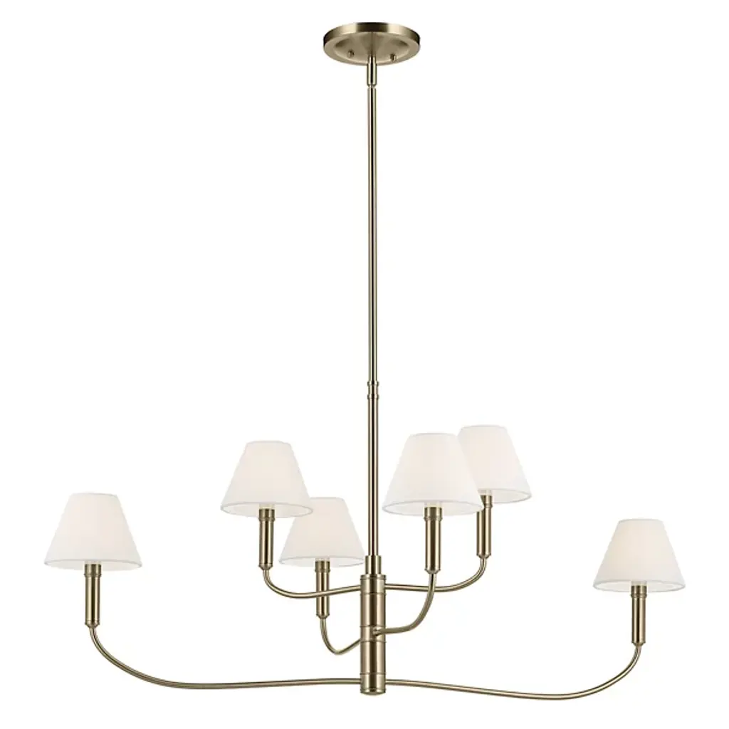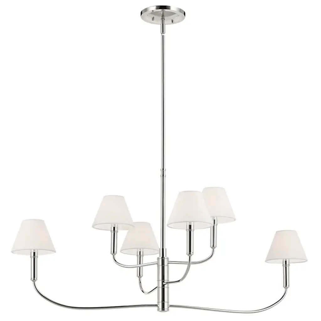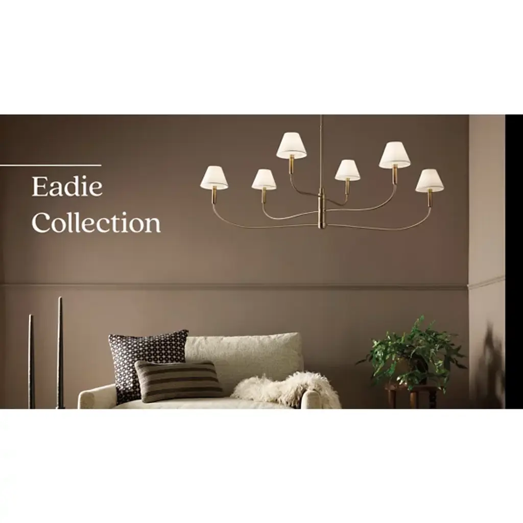 The Eadie Multi Tier Chandelier from Kichler uses arcing steel arms to update a traditional chandelier design with more straightforward modern elements. Suspending from above via a slim central stem, it uses a circular hub to extend slender arms outward, each one placing a candelabra socket inside a conical fabric shade. Each shade’s open base is filled by a clear glass disc diffuser, ensuring that even the downlight is mellowed from direct glare into a more restrained glow, while fine details on the candle catch the light and show the design’s incredible attention to detail.