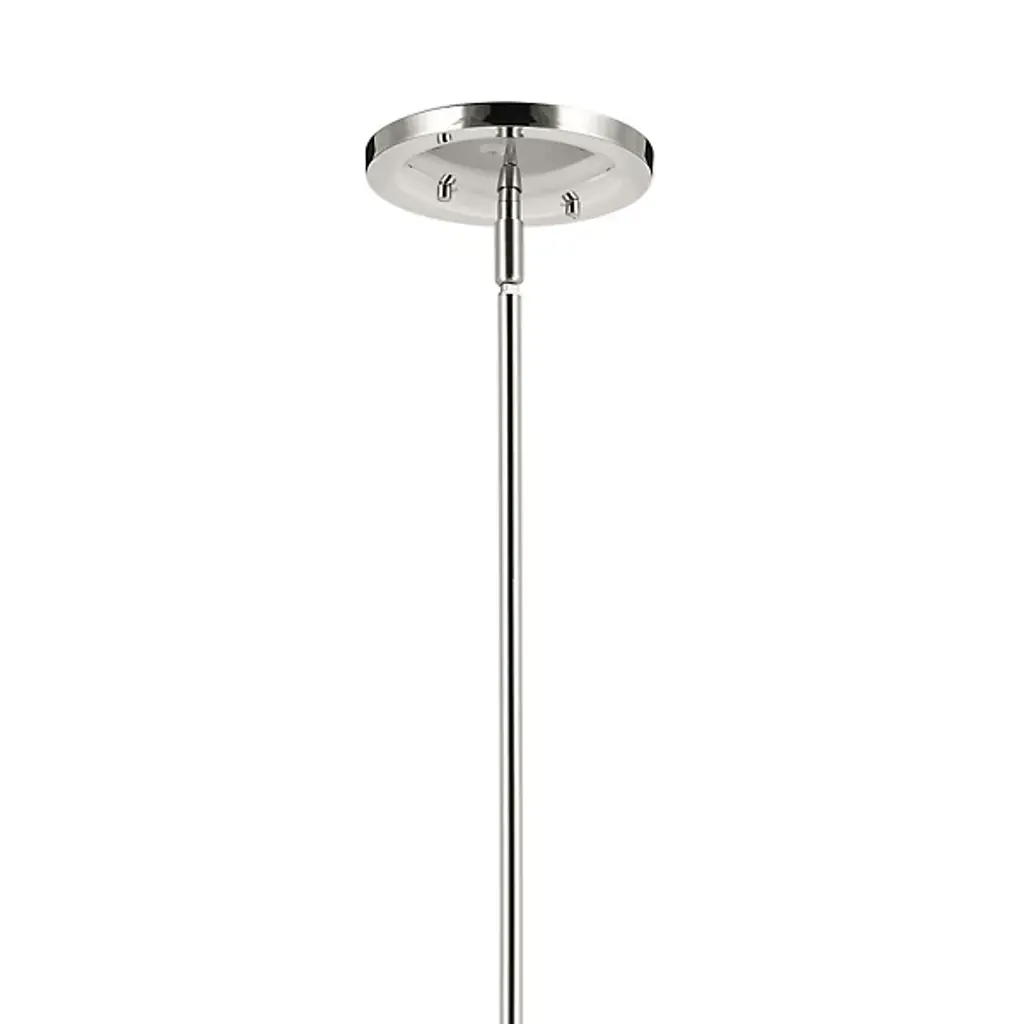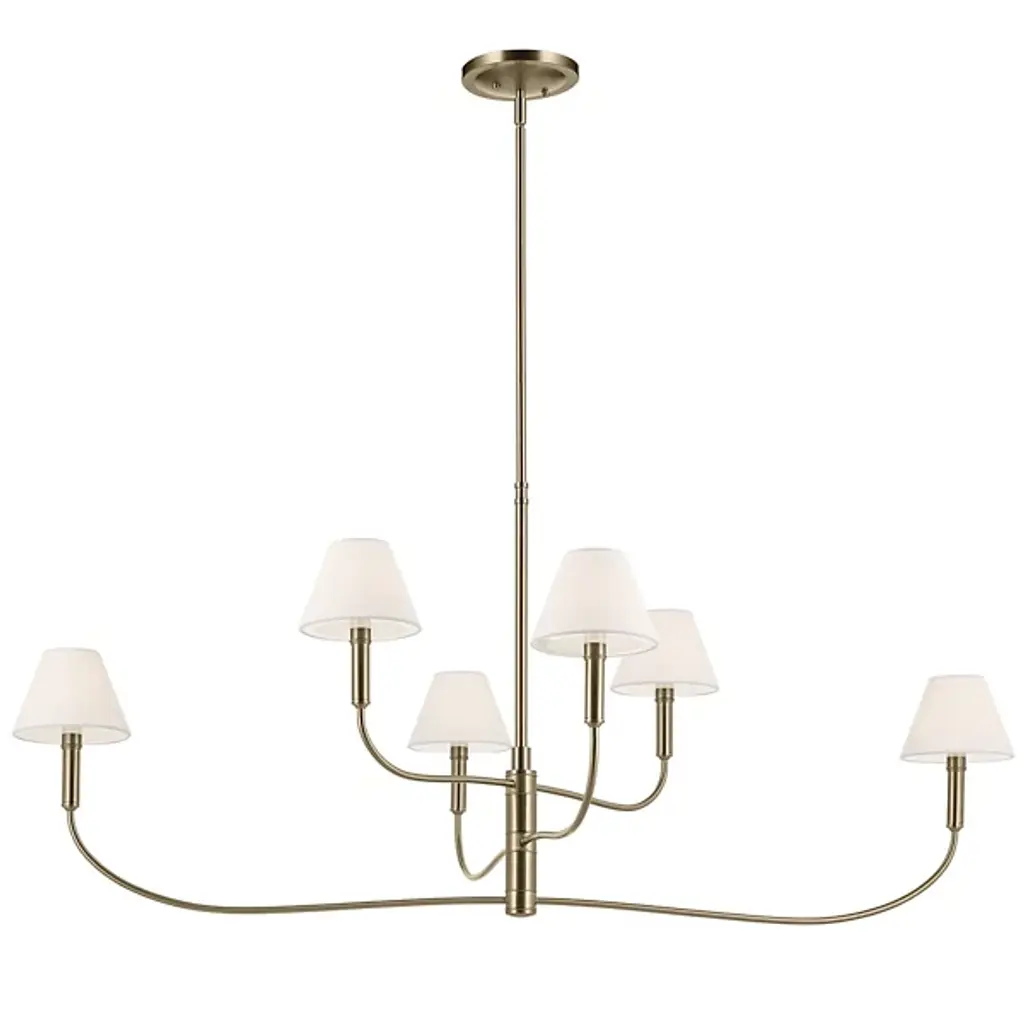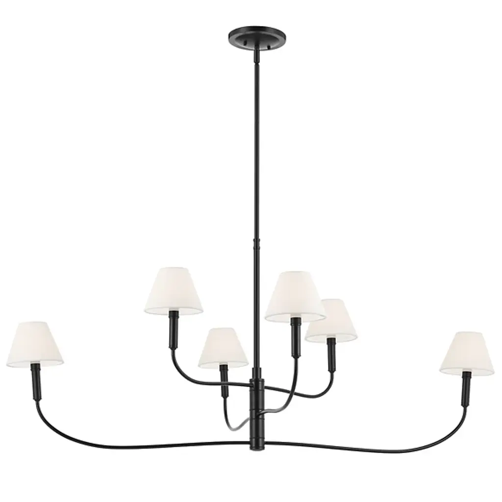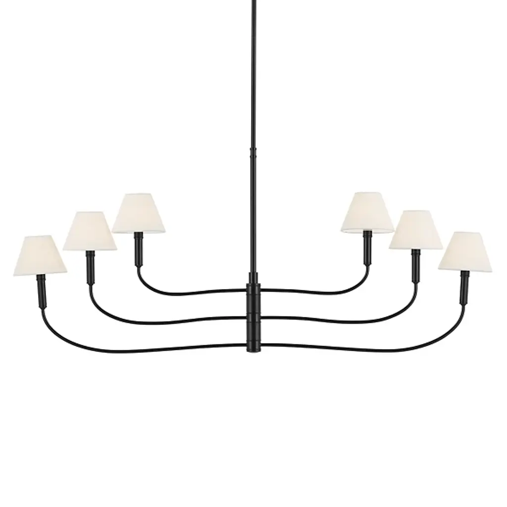 The Eadie Multi Tier Chandelier from Kichler uses arcing steel arms to update a traditional chandelier design with more straightforward modern elements. Suspending from above via a slim central stem, it uses a circular hub to extend slender arms outward, each one placing a candelabra socket inside a conical fabric shade. Each shade’s open base is filled by a clear glass disc diffuser, ensuring that even the downlight is mellowed from direct glare into a more restrained glow, while fine details on the candle catch the light and show the design’s incredible attention to detail.