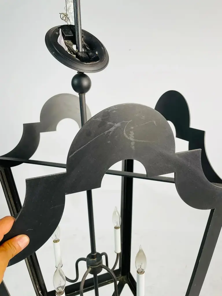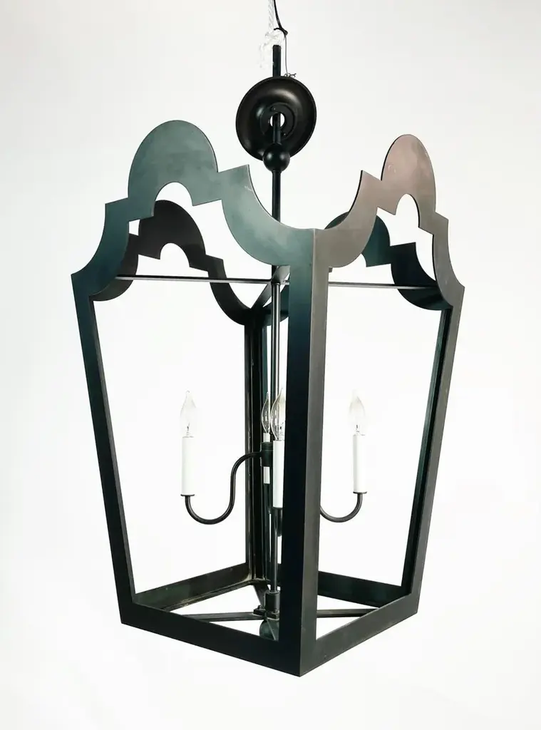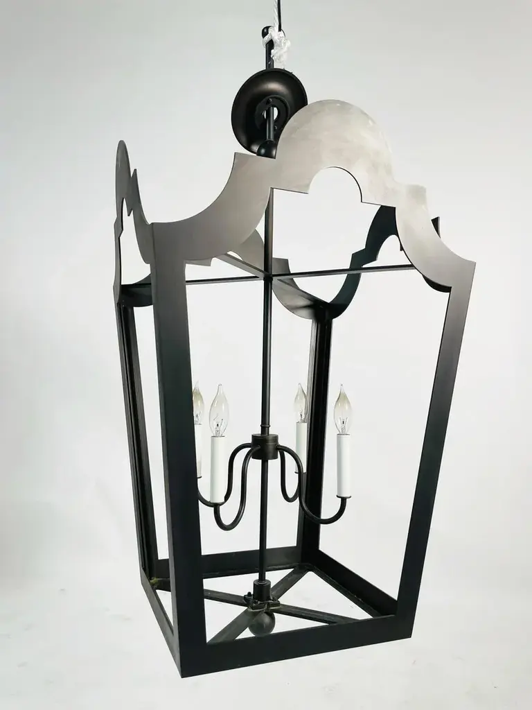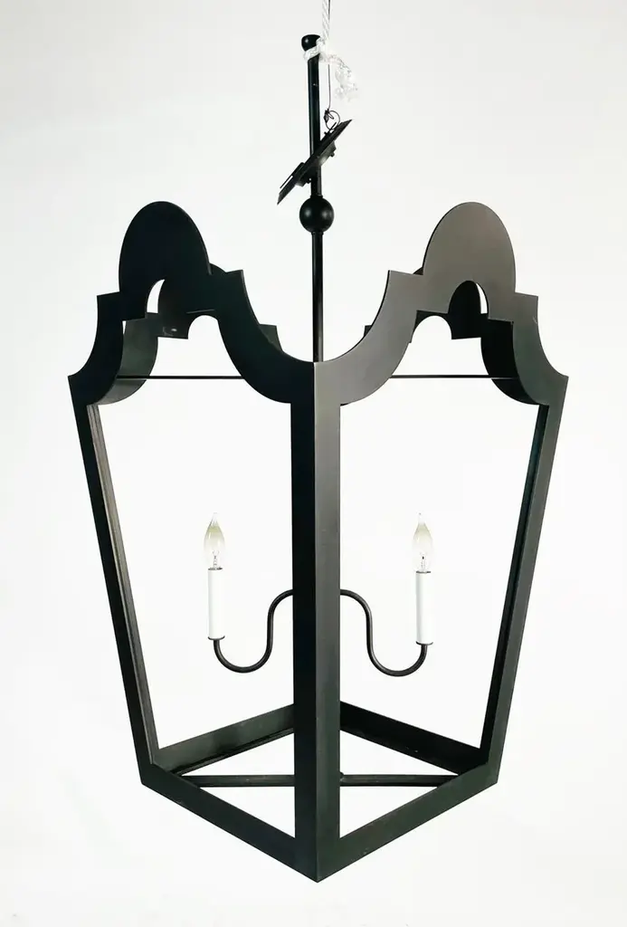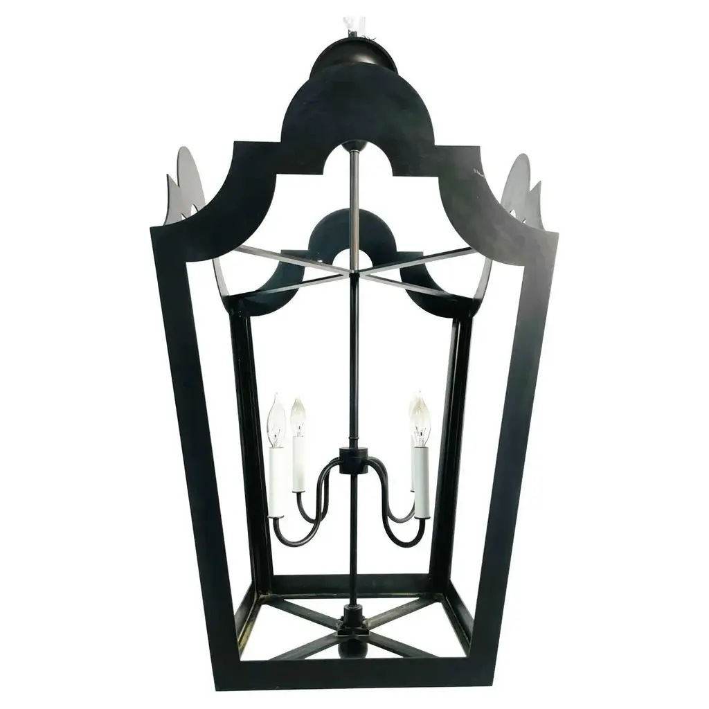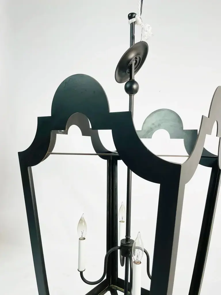 Beautiful chandelier designed by Richard Mishaan and manufactured by The Urban Electric and part of the Venetian collection which is no longer sold. The chandelier is made in solid steel with a black finish. This chandelier is hand-made by craftsmen and artisans in Charleston, South Carolina. Measurements: 44 inches high x 22 inches wide x 22 inches deep x 15 inches square at bottom.