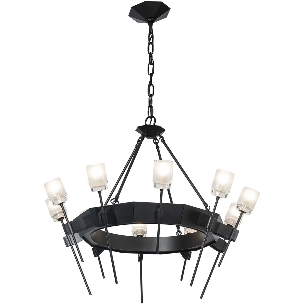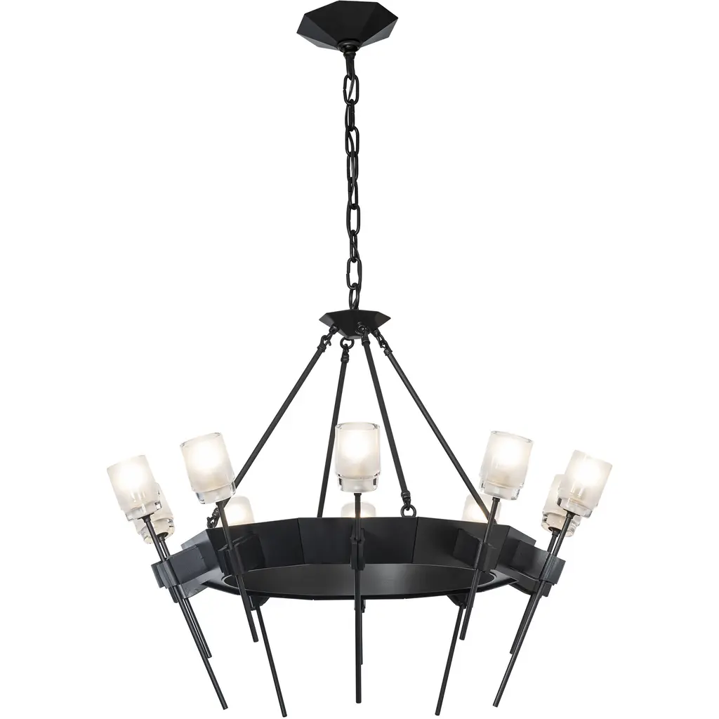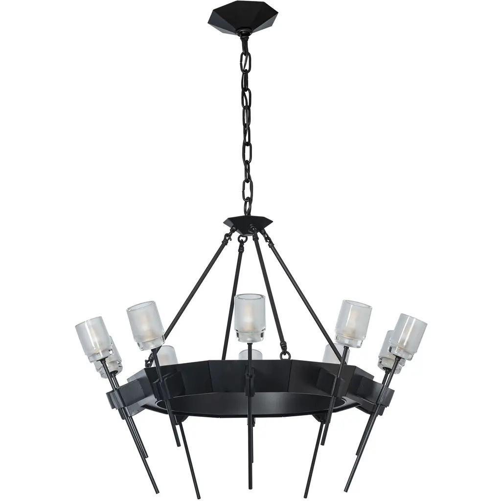 The Echo 10-Light Circular Chandelier combines both faceted and pure geometric forms, blending clean and gothic architectural elements. Rough, forged “hands” gently holding a delicate glass flower served as inspiration for the individual elements of this piece. Thick, frosted glass is perched on each delicate stem.