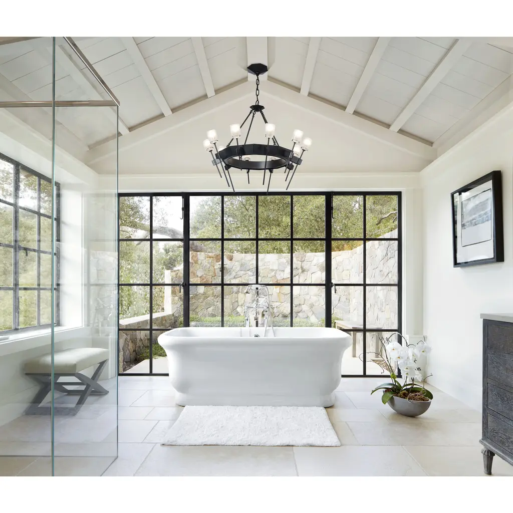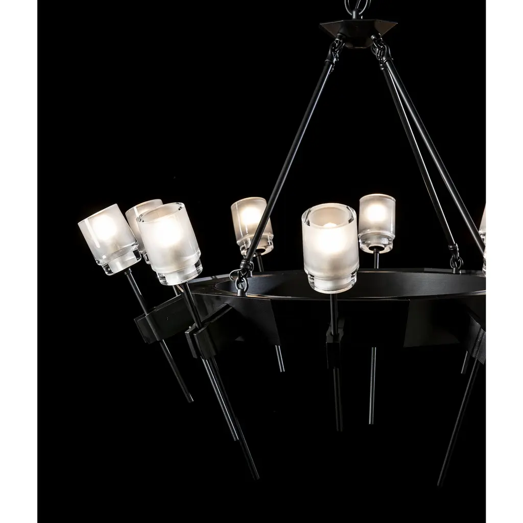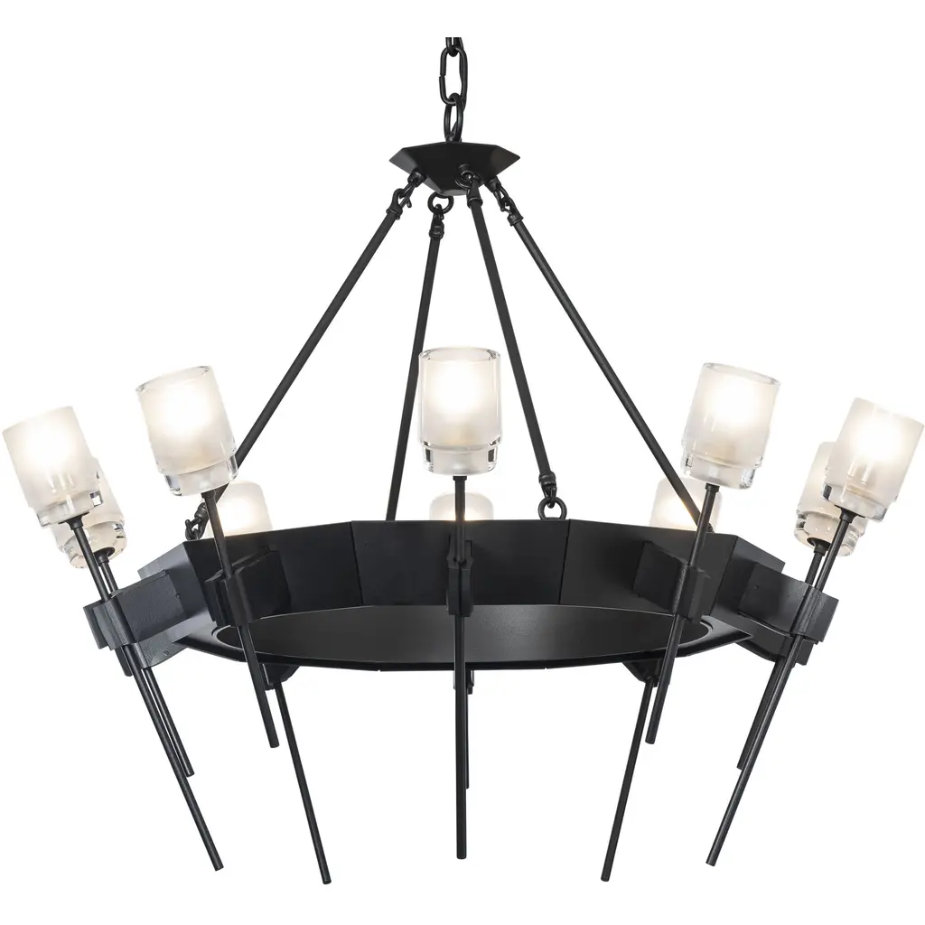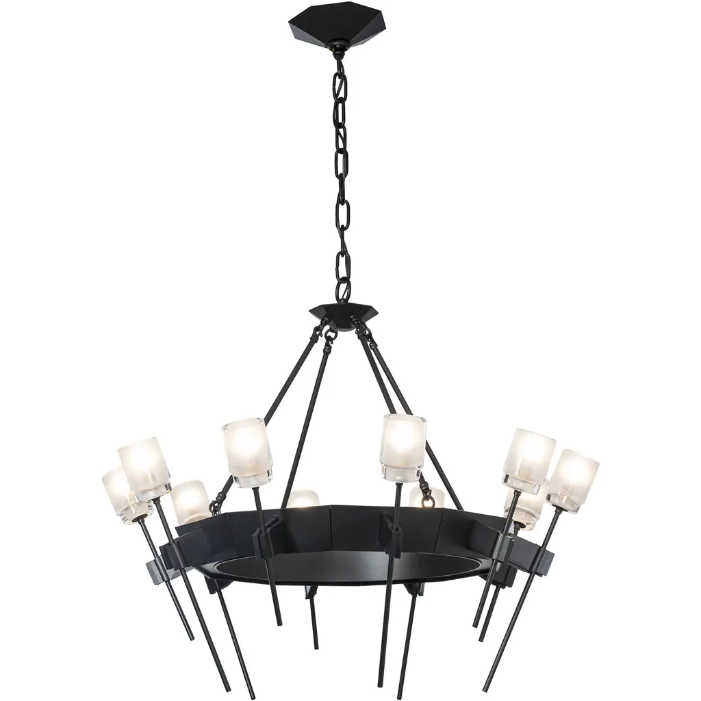The Echo 10-Light Circular Chandelier combines both faceted and pure geometric forms, blending clean and gothic architectural elements. Rough, forged “hands” gently holding a delicate glass flower served as inspiration for the individual elements of this piece. Thick, frosted glass is perched on each delicate stem.