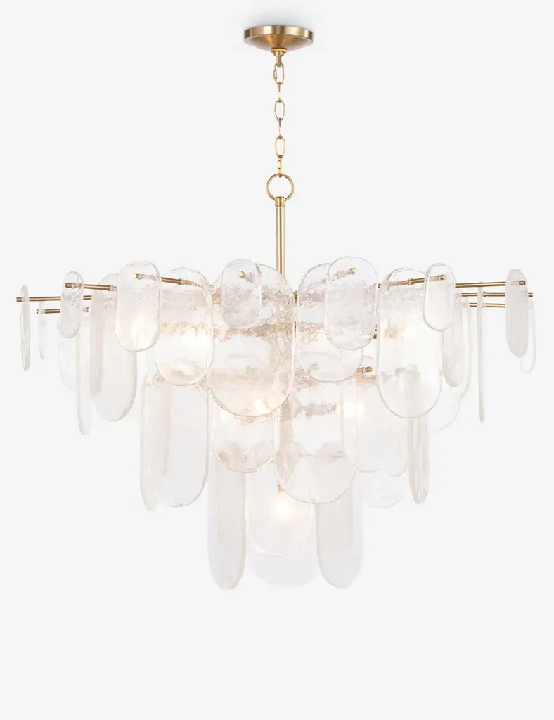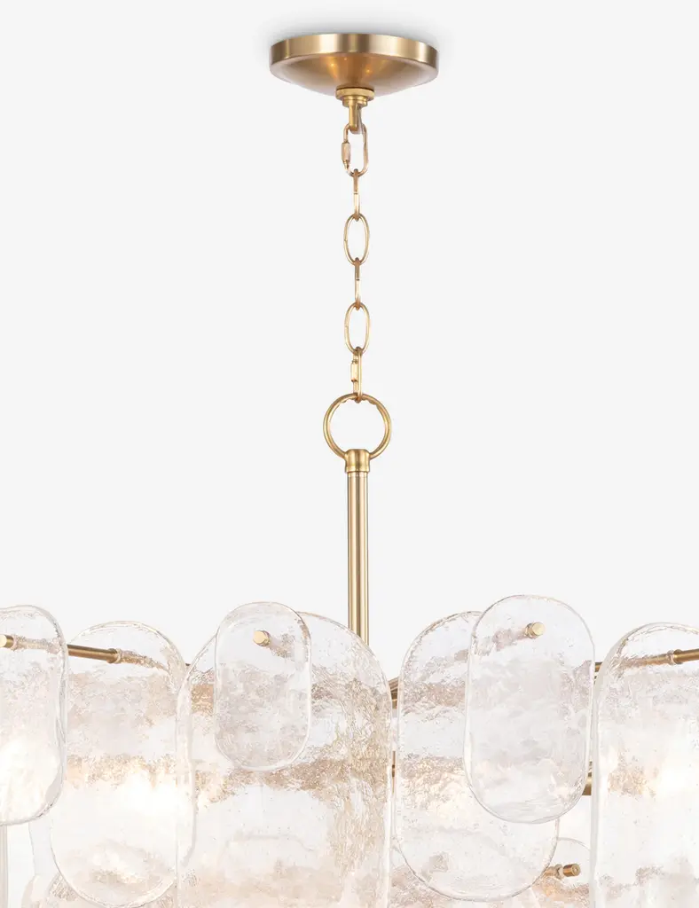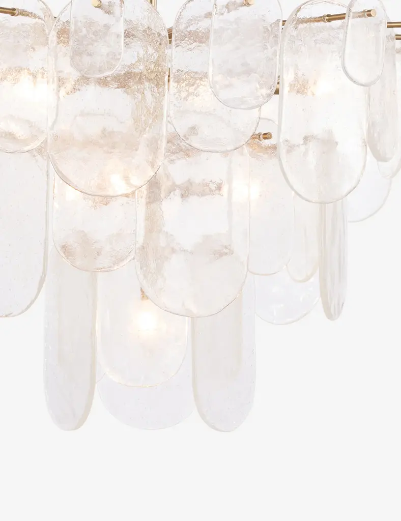 The Echo chandelier offers a brilliant statement in light. The layered arrangement of textural glass panes creates a diffused glow that brightens your space with sophistication and warmth. This sculptural chandelier design makes a striking focal point for a dining area or living room.