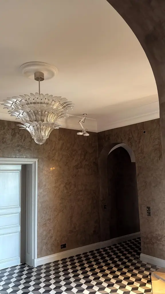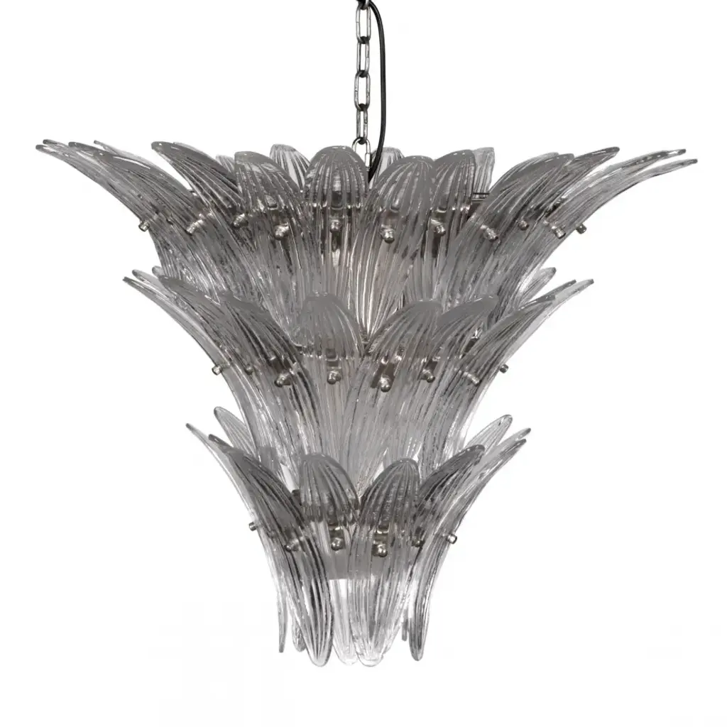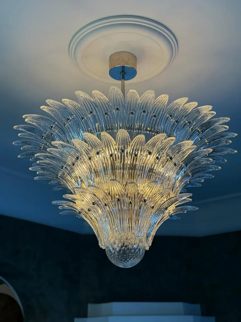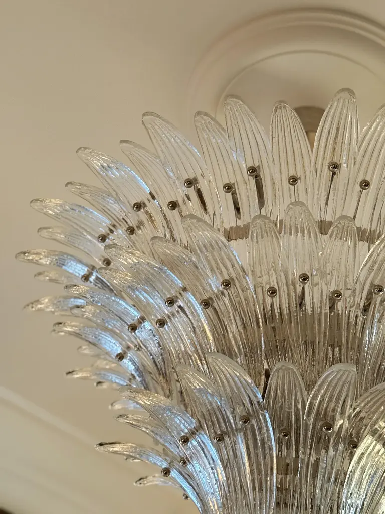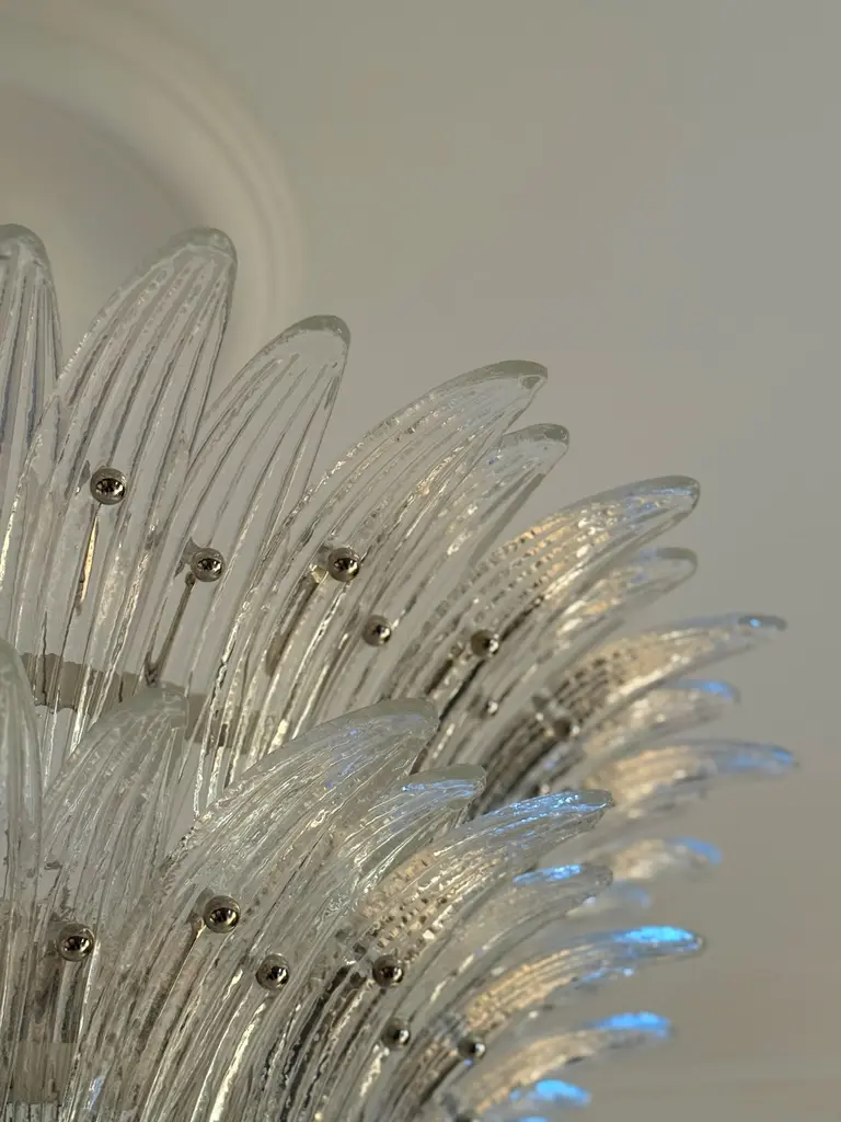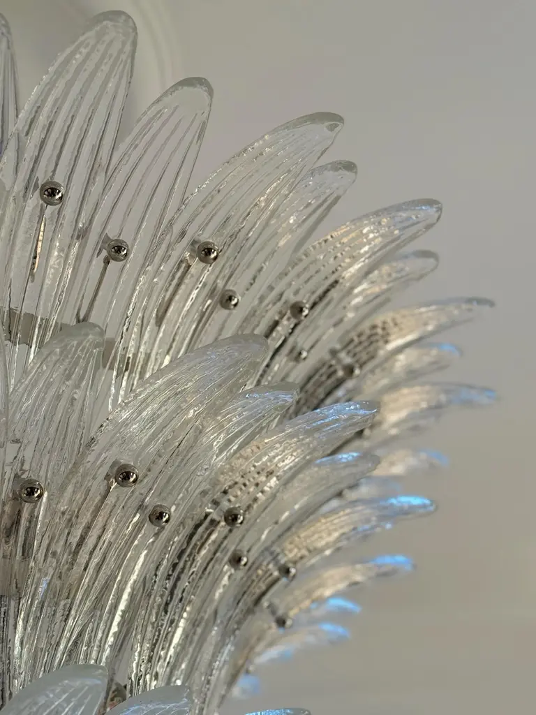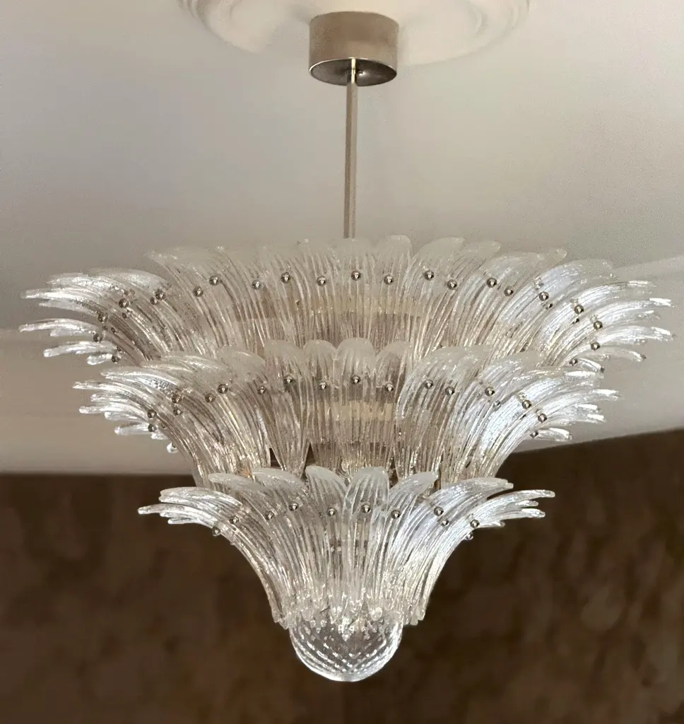 Stunner eclectic murano chandelier in the style of barovier. Italian palmette chandelier in 1970s style with clear murano glass feathers arranged in three tiers and mounted on a lamp structure and ceiling rose in chrome. bold murano chandelier in traditional italian mid-century style and produced during the 21th century. The chandelier is composed of 104 clear feather formed crystal prisms in the size of 10.3” x 2.4” / 26 x 6 cm. The glass ball is 12 cm / 4.7" in diameter. new eu wiring. Us and uk rewiring is offered complimentary, expect two weeks extra delivery time for the service. 6 light sources e27 / e27. measure: total height with adjustable chain: 39.4” / 100 cm total height for the glass body of the chandelier: 25.6” / 65 cm diameter where widest: 39.4” / 100 cm european plug (up to 250v).the wiring of this item may be original and might need replacement, if not specified otherwise.