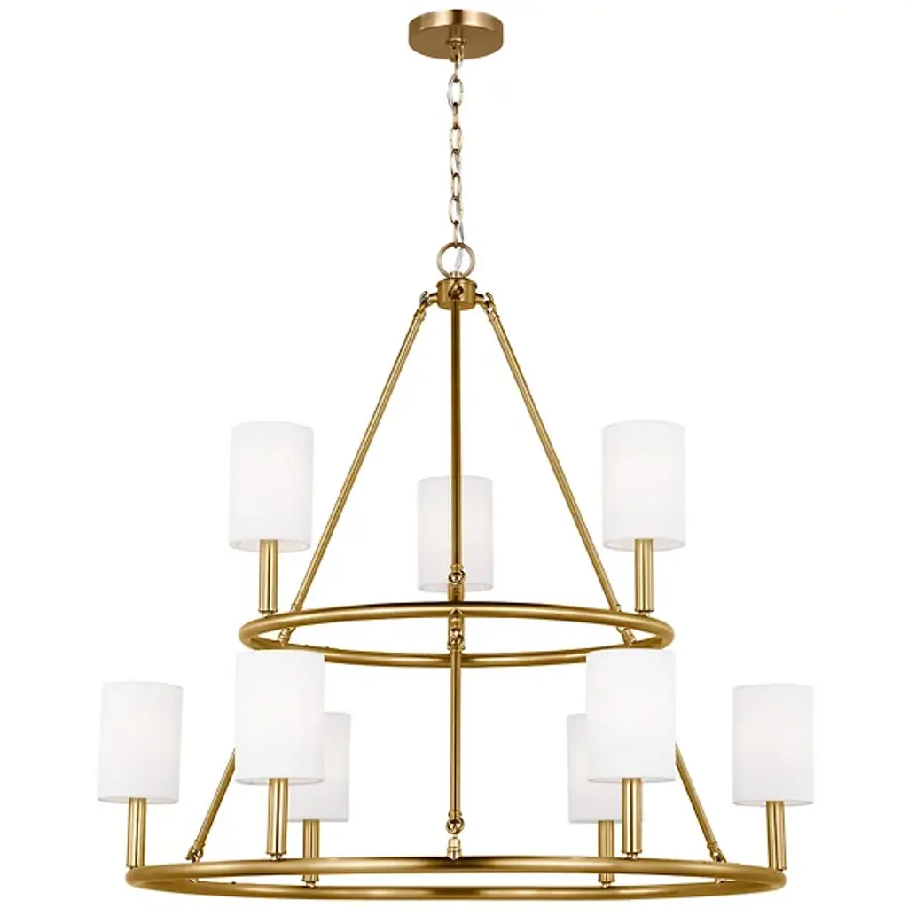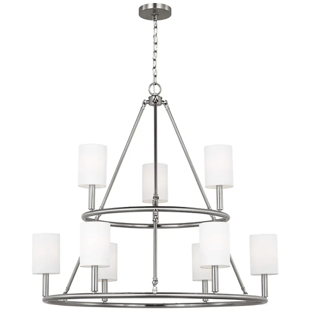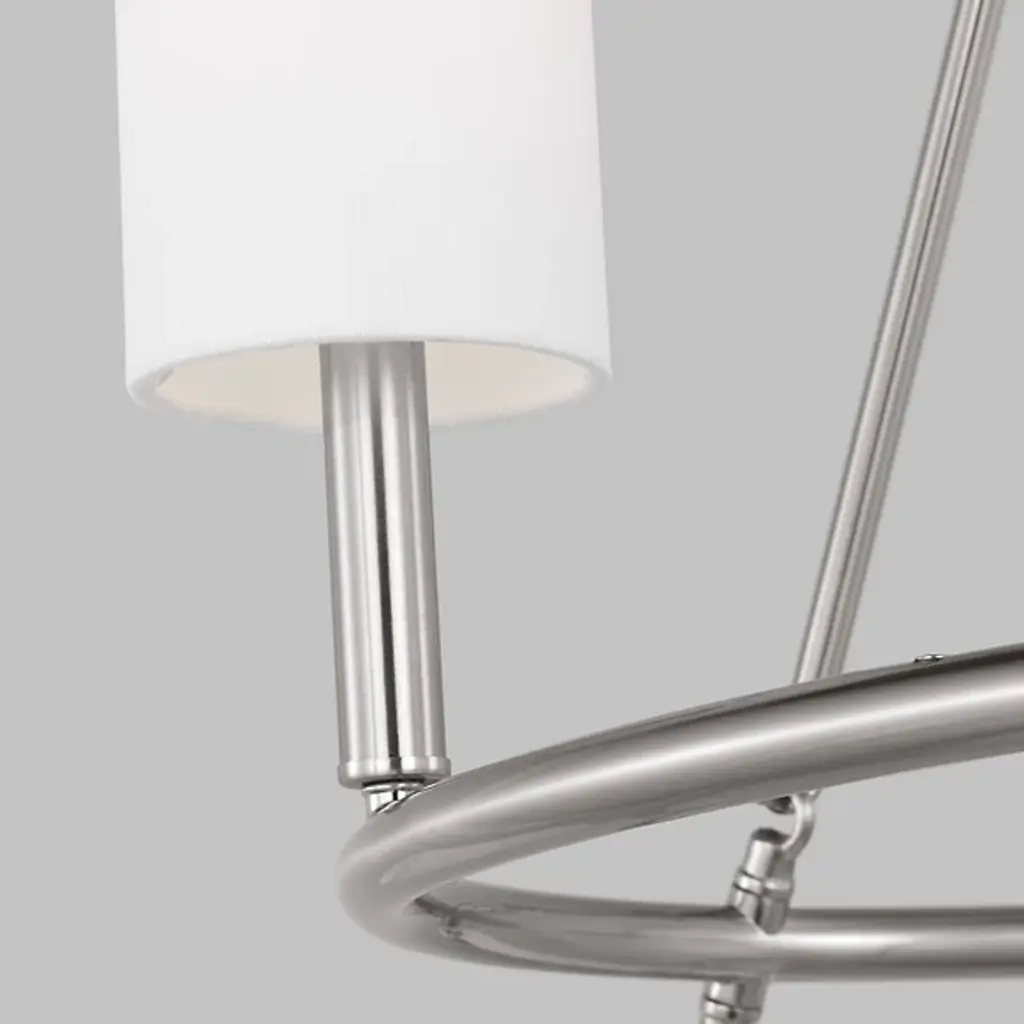 The Egmont 2-Tier Chandelier by Visual Comfort Studio gives your home interior a refreshing transitional personality, one underscored by clean geometry. LED lamps are arranged in a 2-tiered fashion along the steel, ring-shaped frames. These lamps perch atop slender holders that recall classic candles. The lamp's light is tempered by cylindrical shades of white linen, giving your environment a warm, spacious glow.