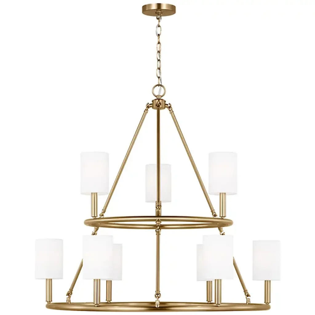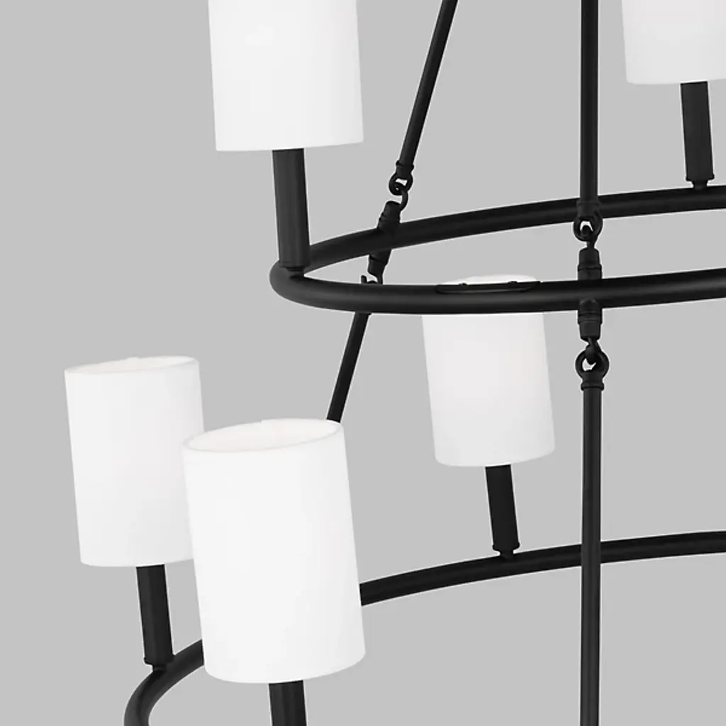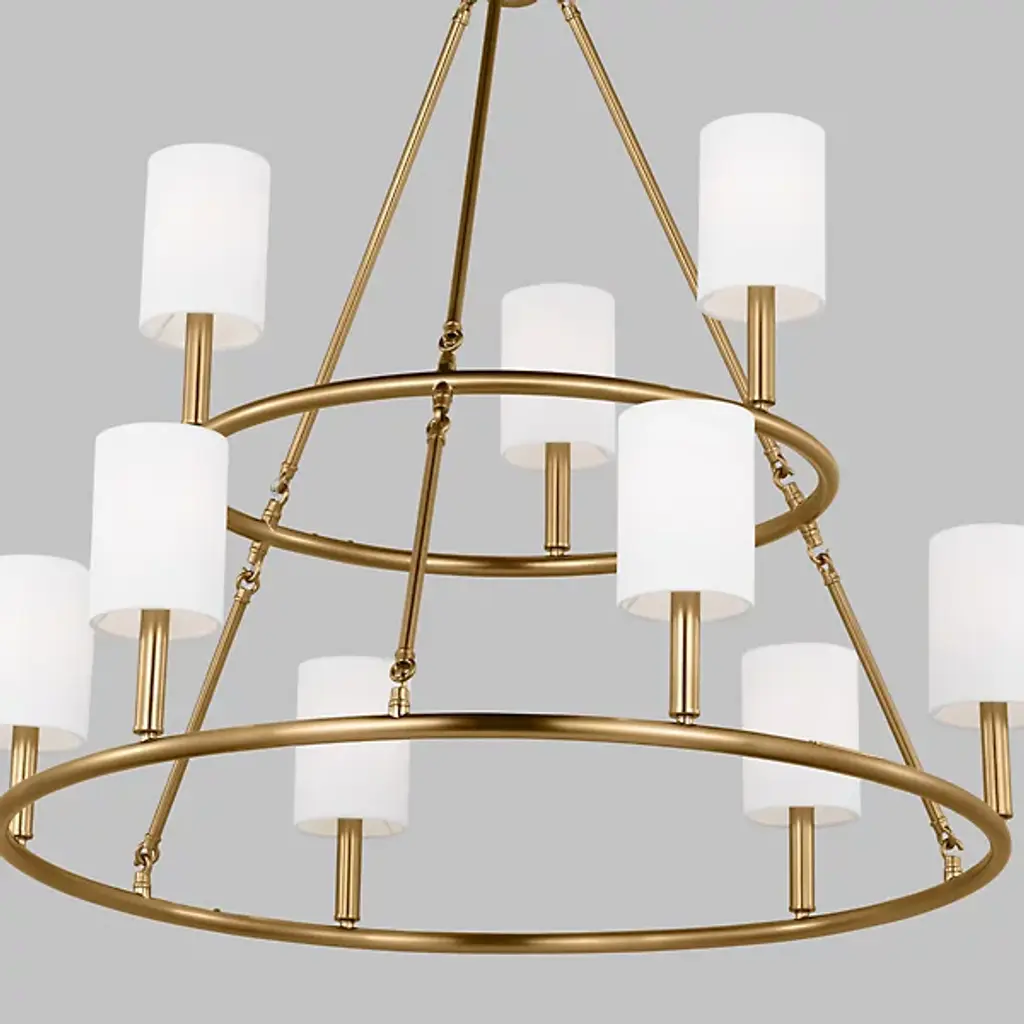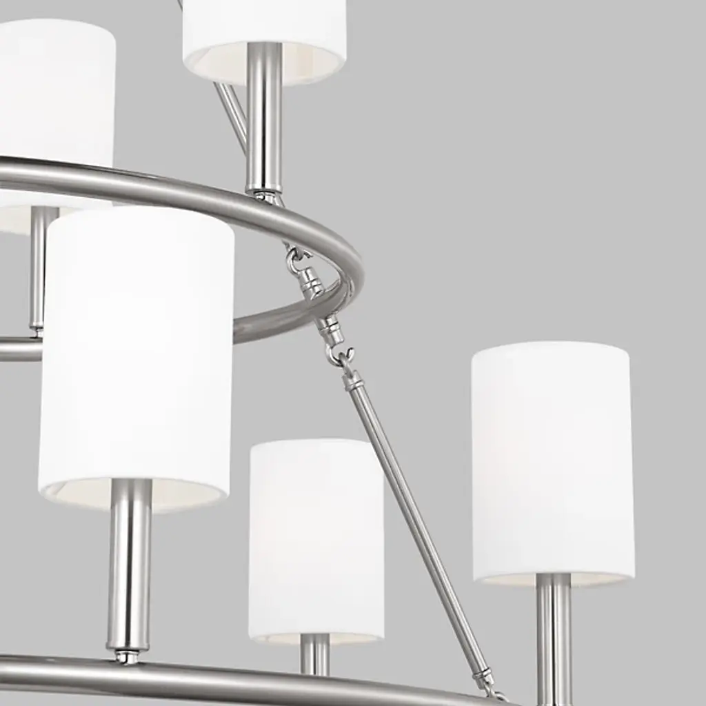 The Egmont 2-Tier Chandelier by Visual Comfort Studio gives your home interior a refreshing transitional personality, one underscored by clean geometry. LED lamps are arranged in a 2-tiered fashion along the steel, ring-shaped frames. These lamps perch atop slender holders that recall classic candles. The lamp's light is tempered by cylindrical shades of white linen, giving your environment a warm, spacious glow.