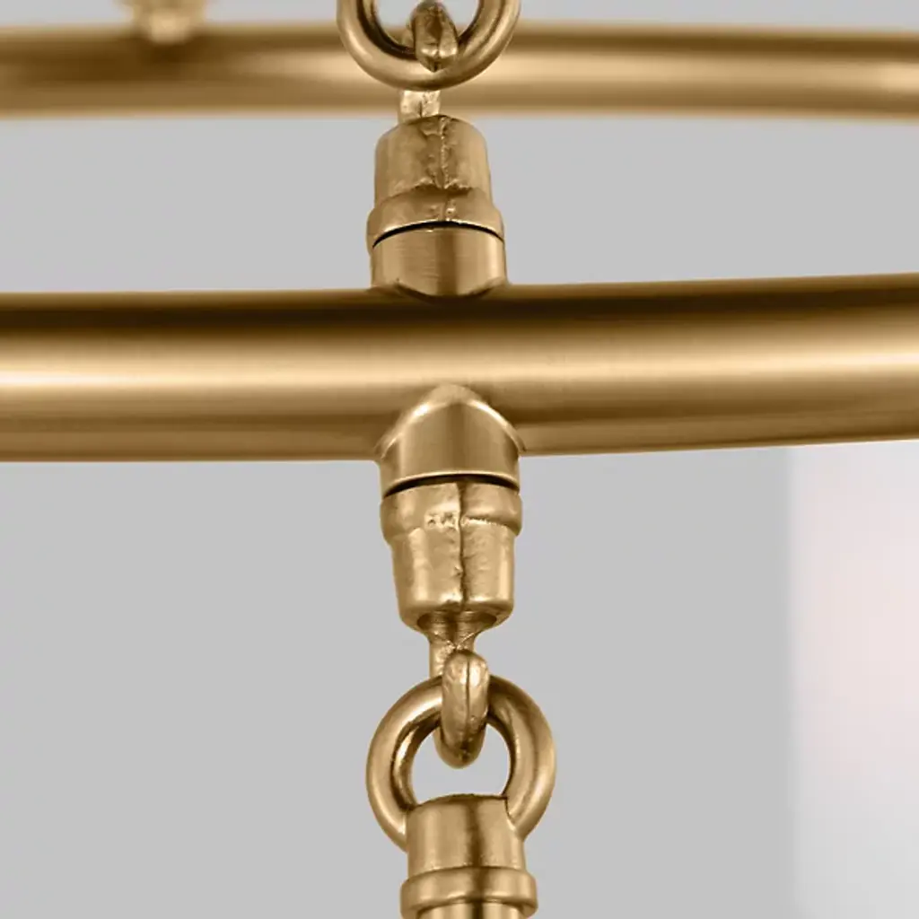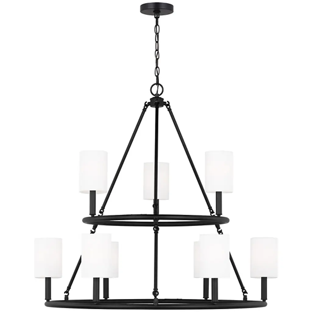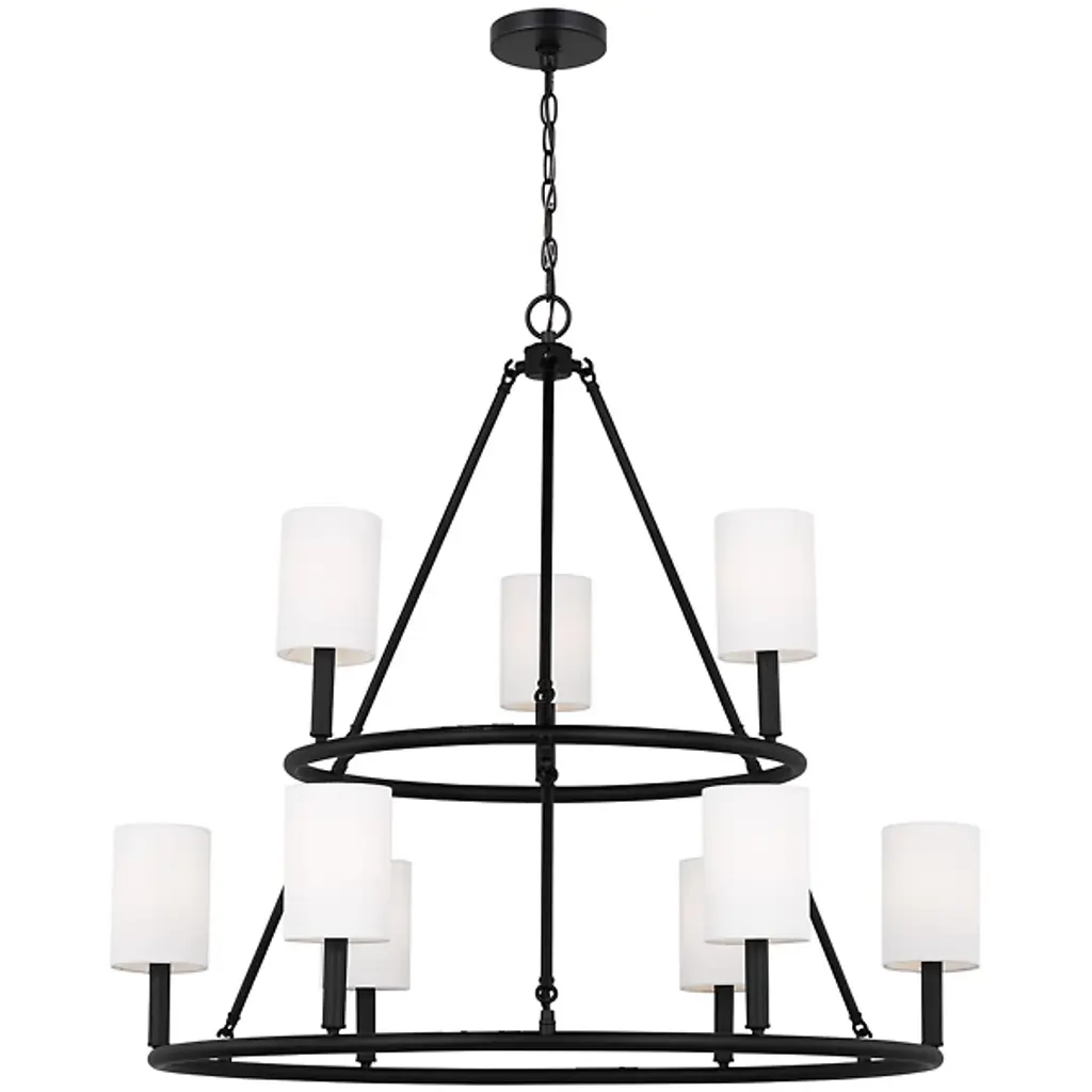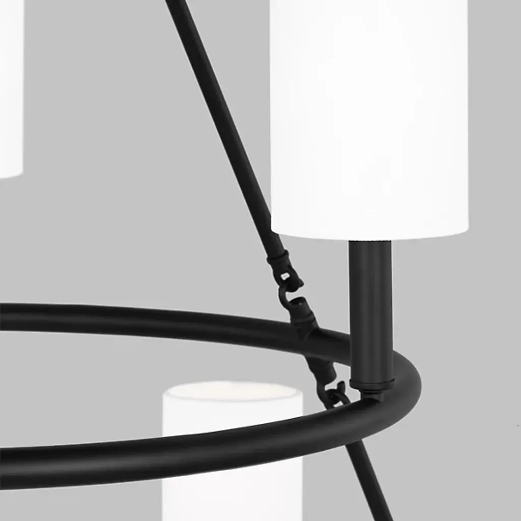 The Egmont 2-Tier Chandelier by Visual Comfort Studio gives your home interior a refreshing transitional personality, one underscored by clean geometry. LED lamps are arranged in a 2-tiered fashion along the steel, ring-shaped frames. These lamps perch atop slender holders that recall classic candles. The lamp's light is tempered by cylindrical shades of white linen, giving your environment a warm, spacious glow.
