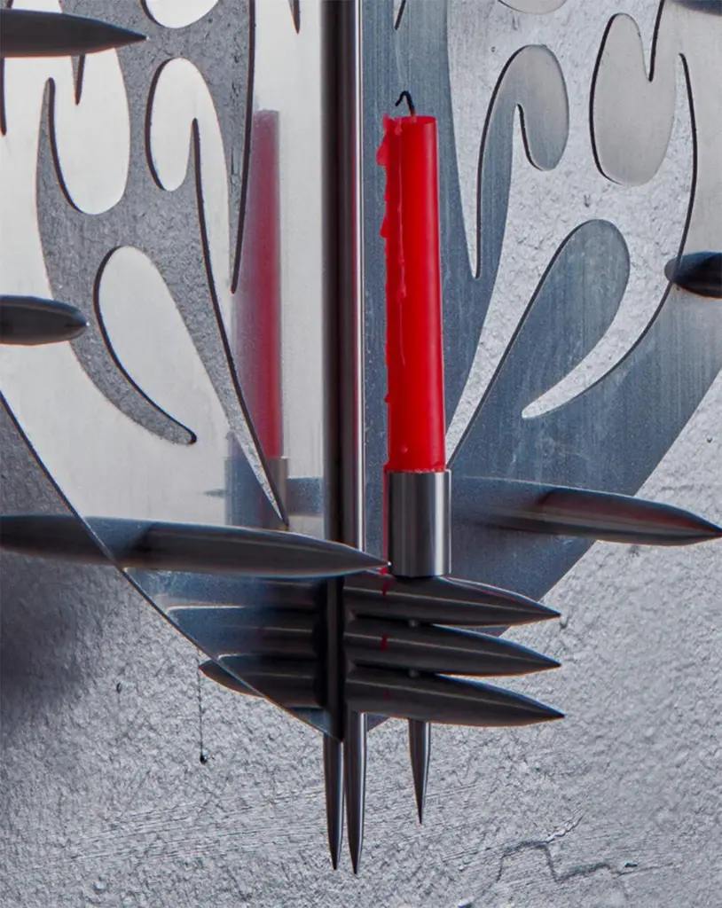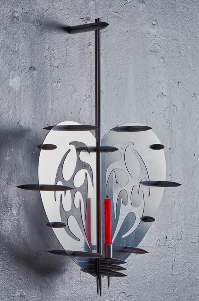 Piece made of polished aluminum. Heart-shaped main plate in 1/8” laser-cut aluminum with intermediate bend. Aluminum tubes in different aluminum tubes in different sizes in the form of peaks worked by means of the turning process.