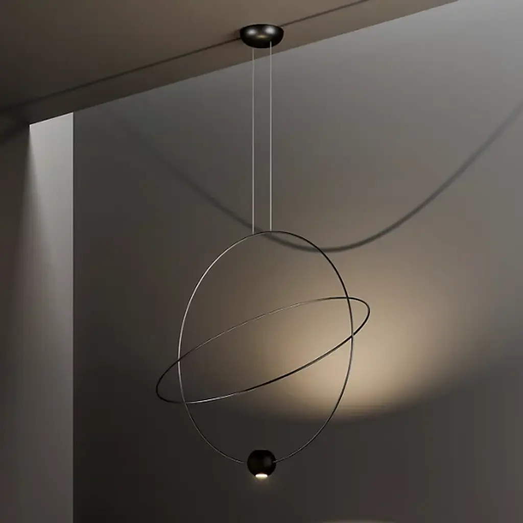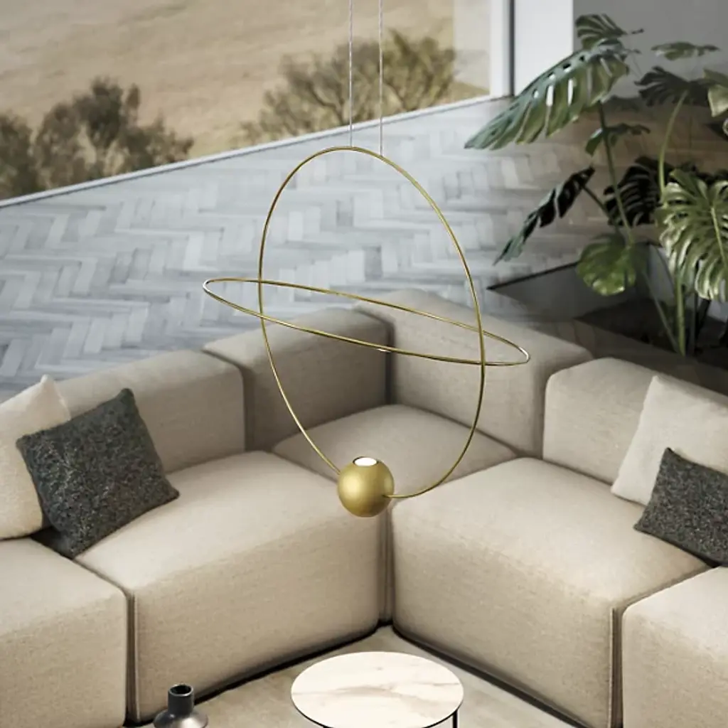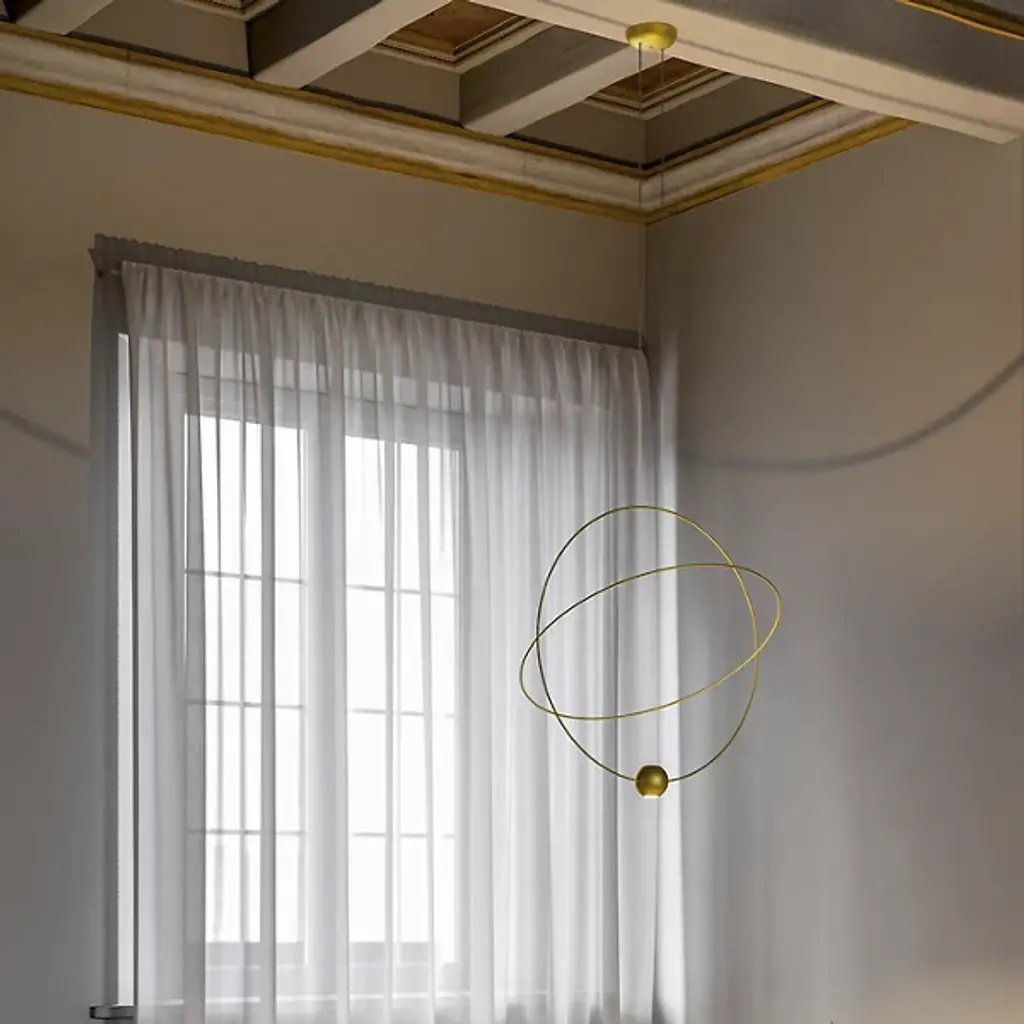 The Elara LED Chandelier from LODES boasts a stunning contemporary style that is at once celestial and functional. Designed by designer Nika Zupanc in 2022, each fixture is made in Italy with precision from high-quality steel and aluminum. The name "Elara" draws inspiration from astronomy and Greek mythology, and its design mirrors the celestial trajectory of planets. Featuring two adjustable metal rings and a small sphere housing the light source, the Elara allows for dynamic configurations, creating fluidity and movement, with a central ring able to adjust for height and angle to provide a customizable glow that can illuminate an entire room.