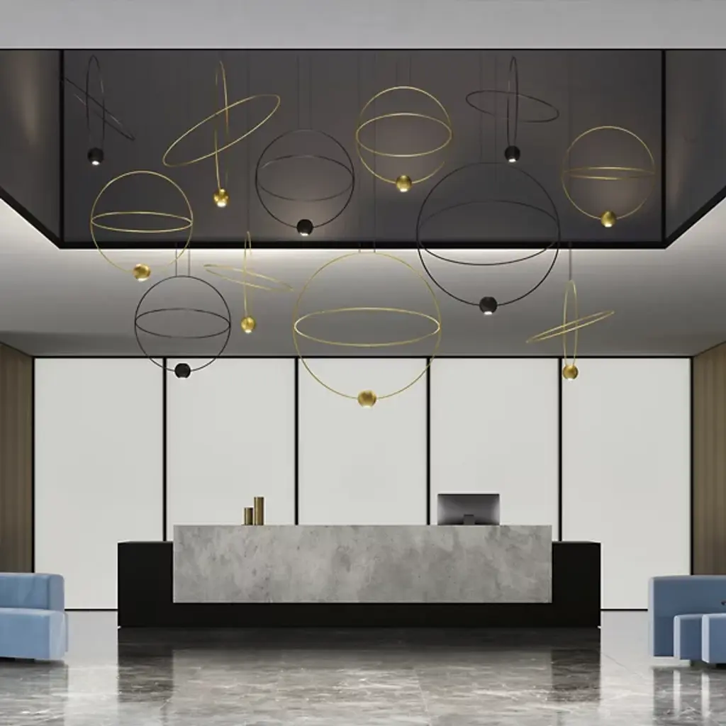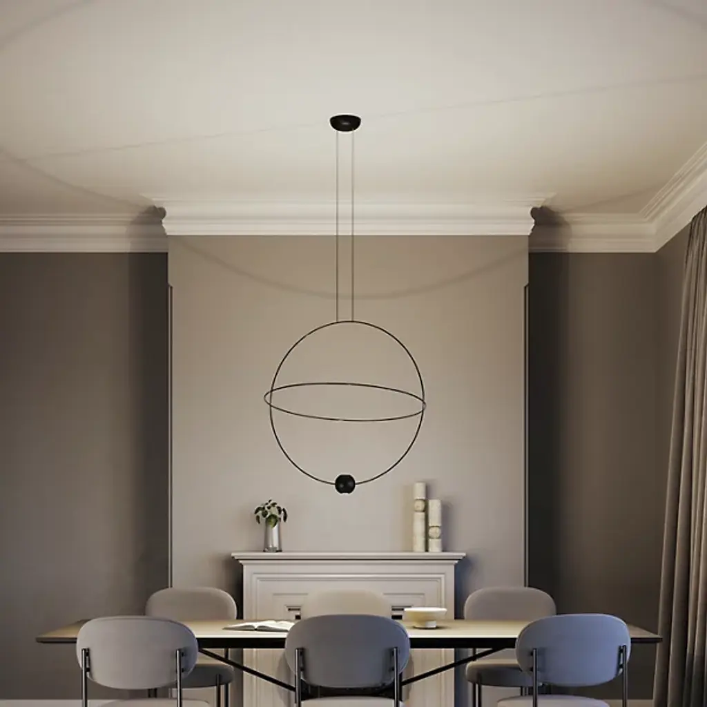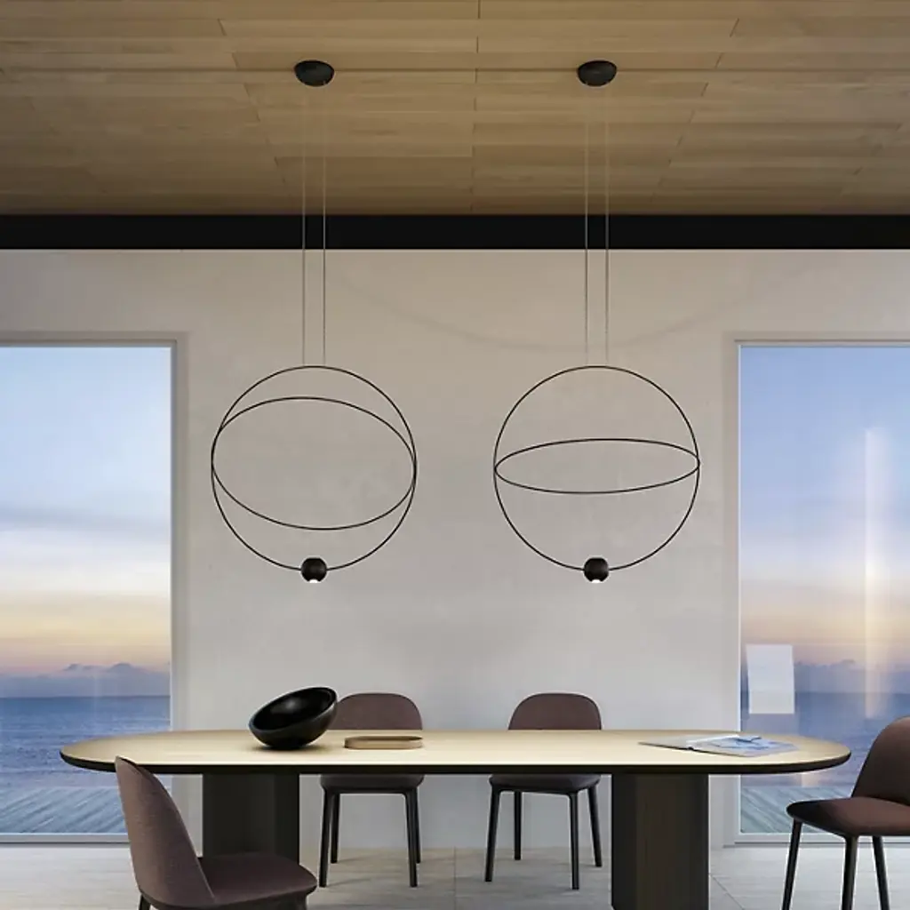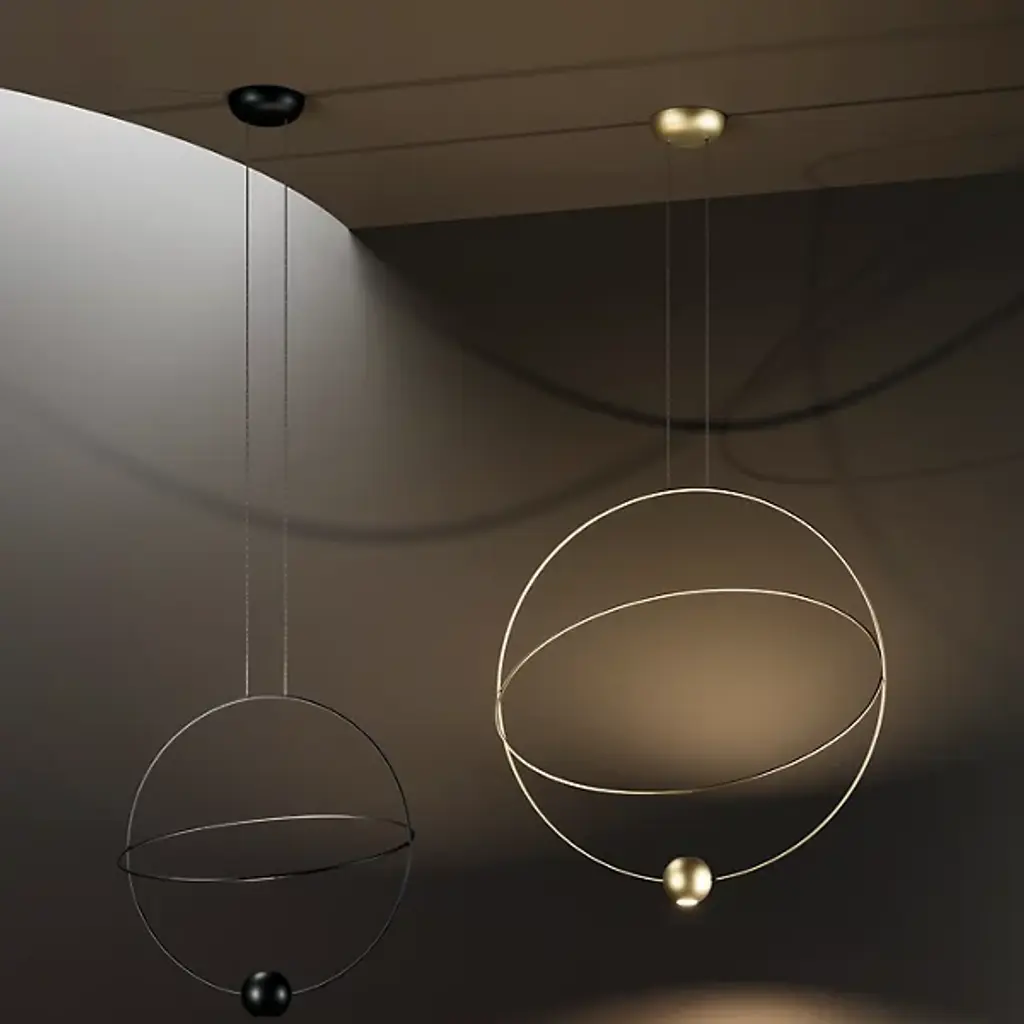 The Elara LED Chandelier from LODES boasts a stunning contemporary style that is at once celestial and functional. Designed by designer Nika Zupanc in 2022, each fixture is made in Italy with precision from high-quality steel and aluminum. The name "Elara" draws inspiration from astronomy and Greek mythology, and its design mirrors the celestial trajectory of planets. Featuring two adjustable metal rings and a small sphere housing the light source, the Elara allows for dynamic configurations, creating fluidity and movement, with a central ring able to adjust for height and angle to provide a customizable glow that can illuminate an entire room.