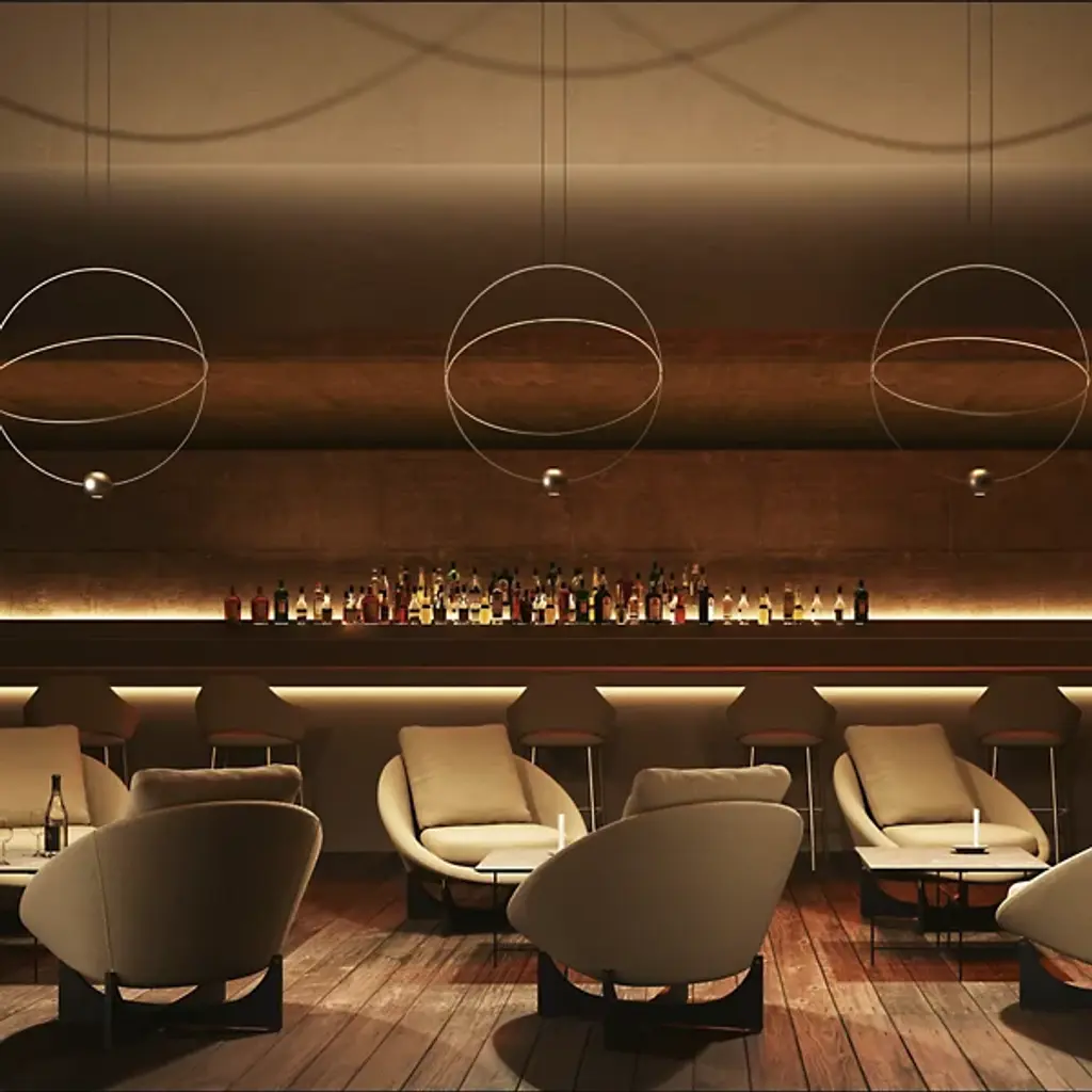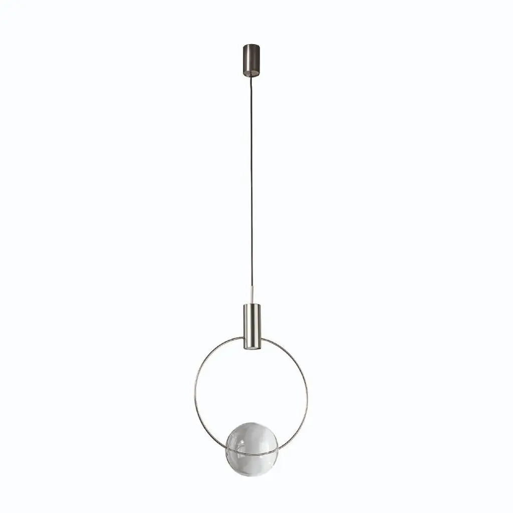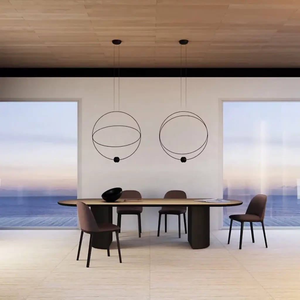 The Elara LED Chandelier from LODES boasts a stunning contemporary style that is at once celestial and functional. Designed by designer Nika Zupanc in 2022, each fixture is made in Italy with precision from high-quality steel and aluminum. The name "Elara" draws inspiration from astronomy and Greek mythology, and its design mirrors the celestial trajectory of planets. Featuring two adjustable metal rings and a small sphere housing the light source, the Elara allows for dynamic configurations, creating fluidity and movement, with a central ring able to adjust for height and angle to provide a customizable glow that can illuminate an entire room.