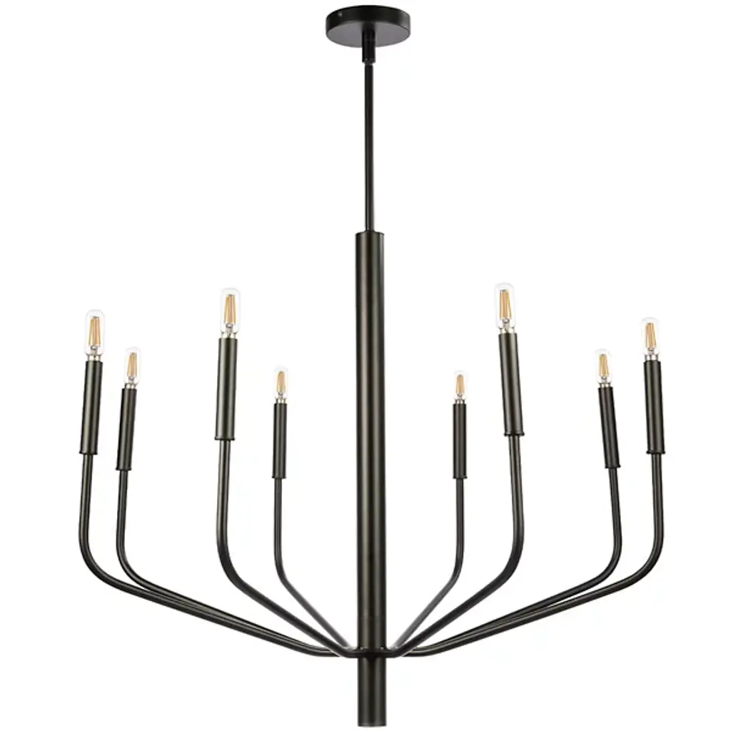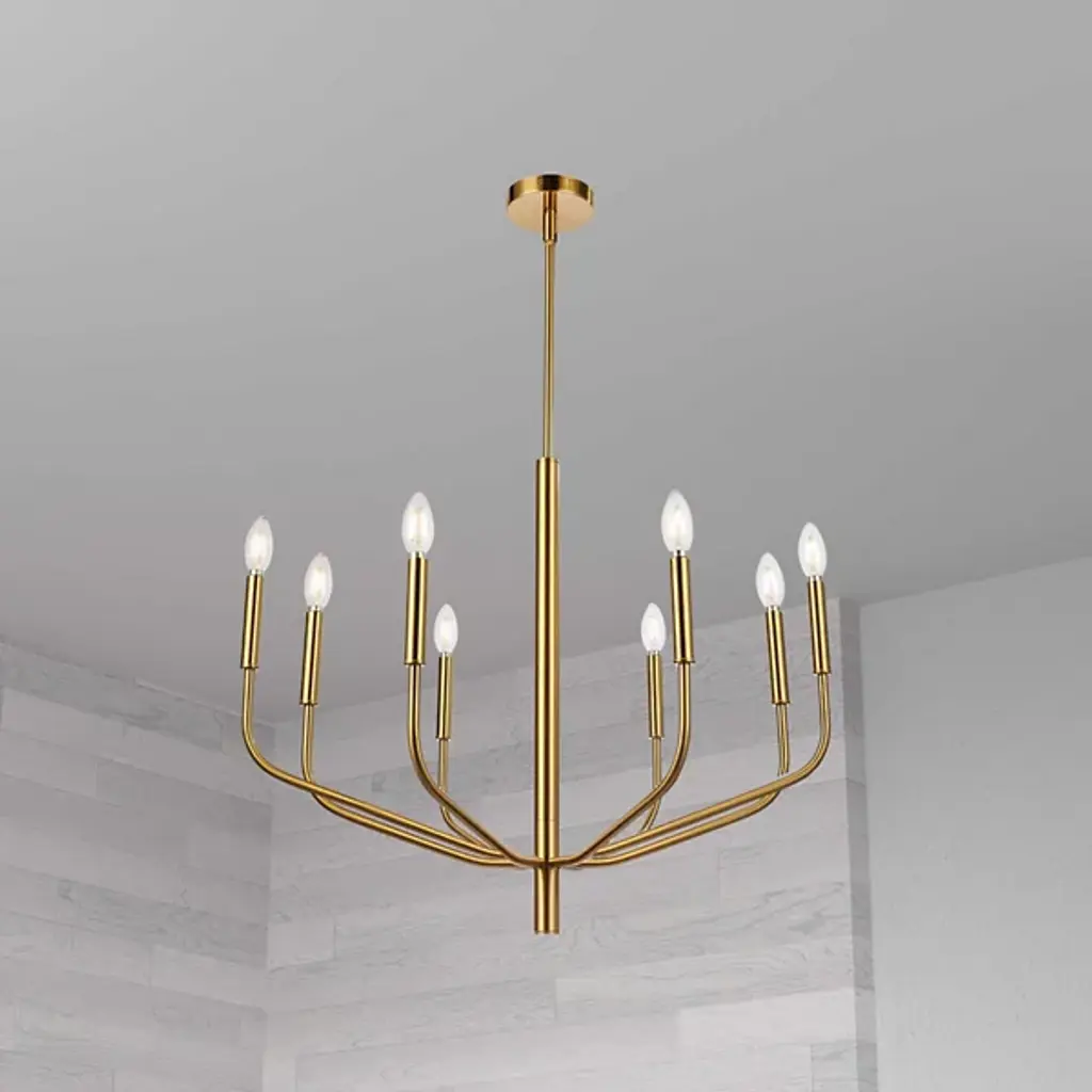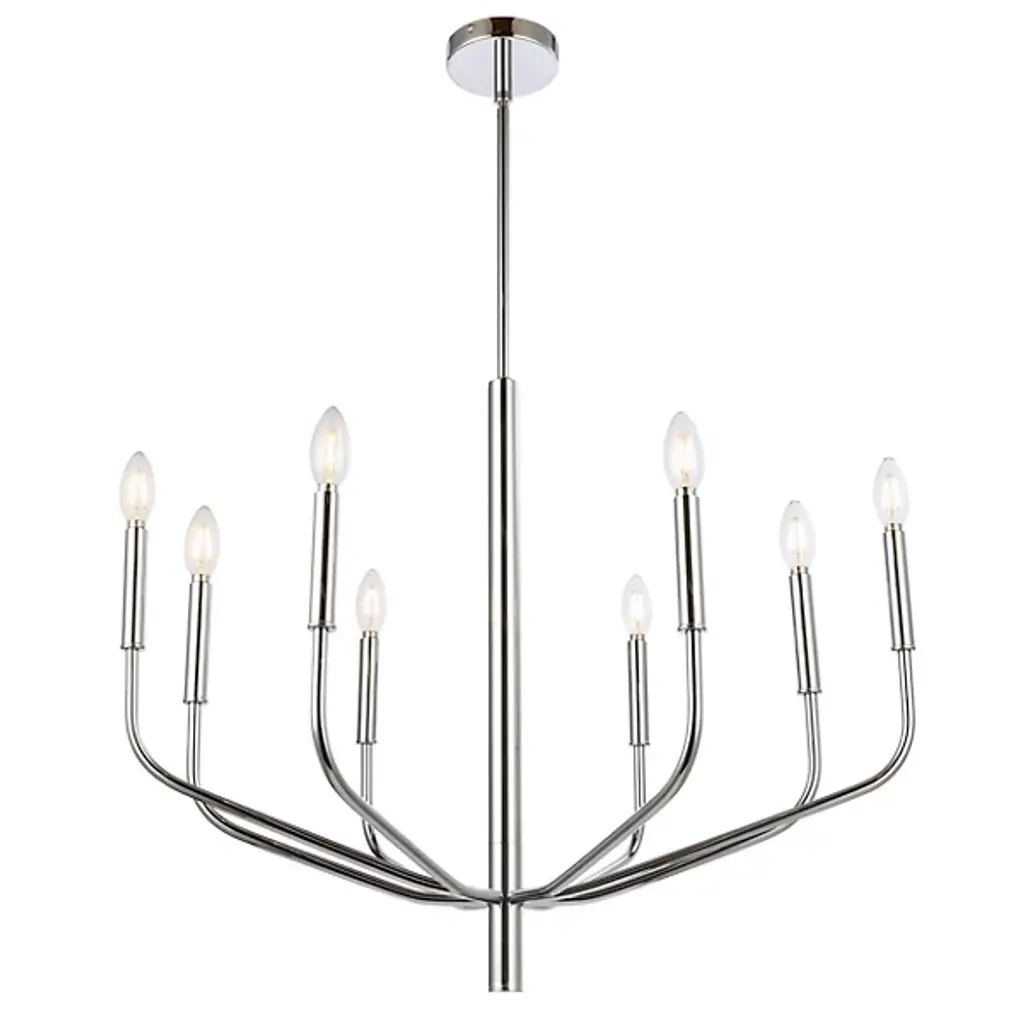 The Eleanor Chandelier by Dainolite is a simple fixture with a clean style. Its circular canopy sends a downrod to a set of slender metal arms. Each arm extends upward and gently angles to support tubular candlesticks with a slightly wider profile. Incandescent bulbs emit a wash of warm, ambient light throughout the space, unfettered by shades or additional adornments. This minimalistic fixture elevates a space effortlessly while providing ample illumination.