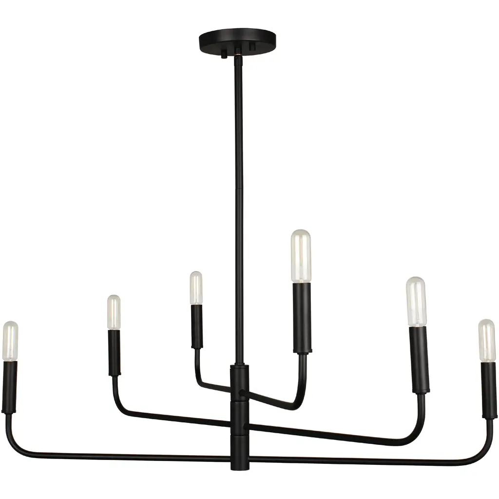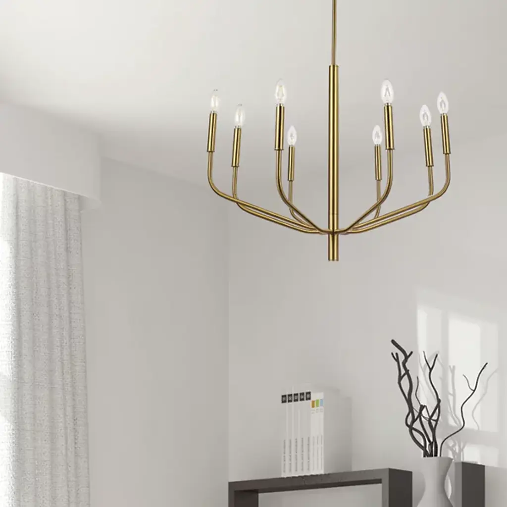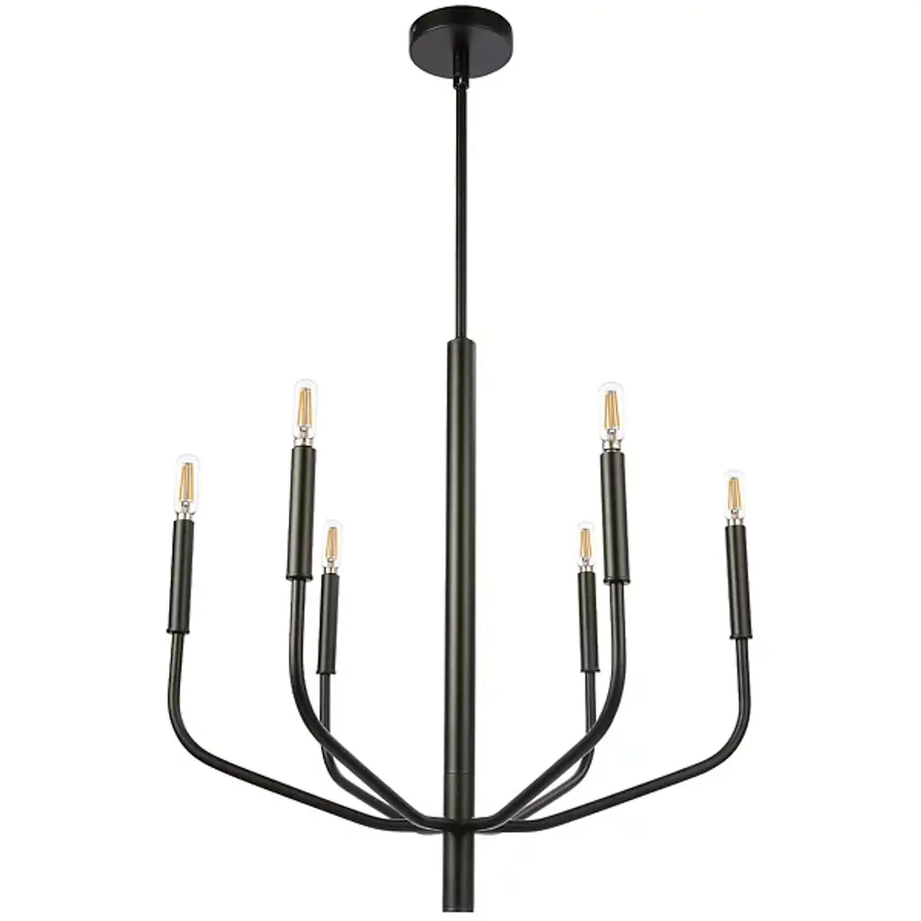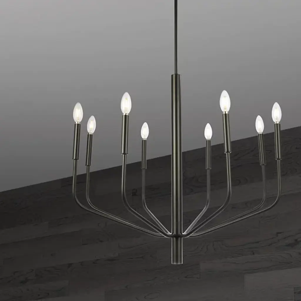 The Eleanor Chandelier by Dainolite is a simple fixture with a clean style. Its circular canopy sends a downrod to a set of slender metal arms. Each arm extends upward and gently angles to support tubular candlesticks with a slightly wider profile. Incandescent bulbs emit a wash of warm, ambient light throughout the space, unfettered by shades or additional adornments. This minimalistic fixture elevates a space effortlessly while providing ample illumination.