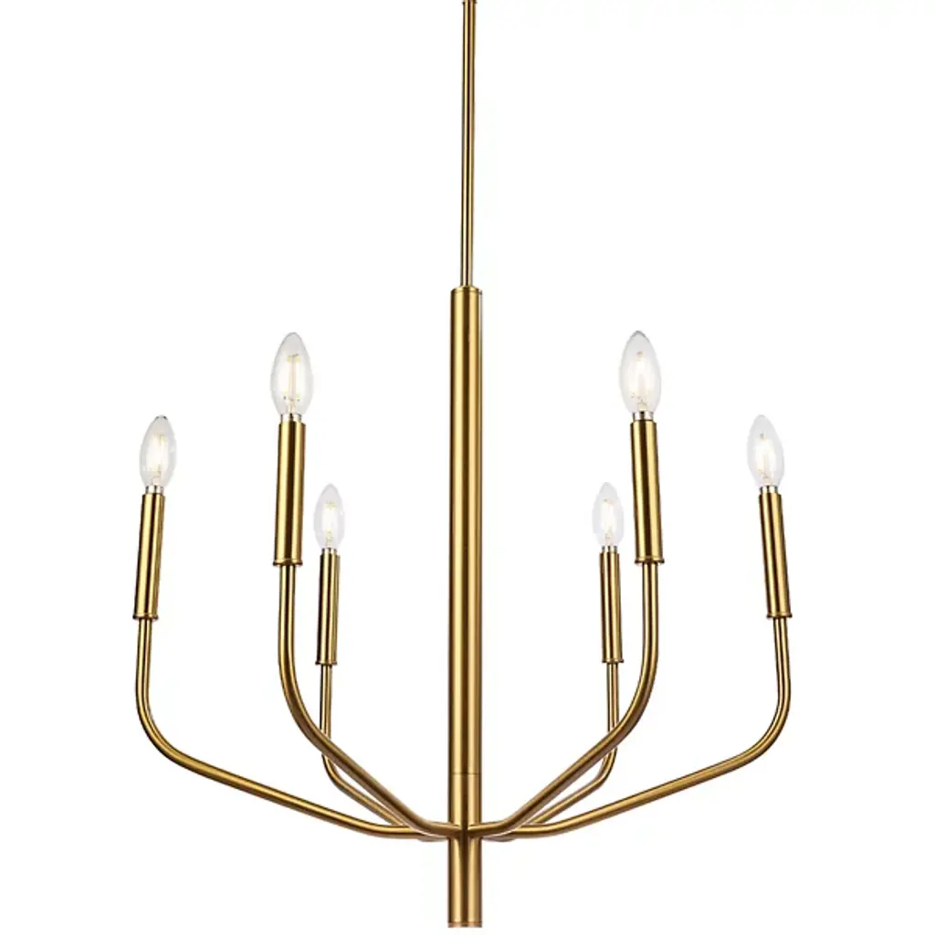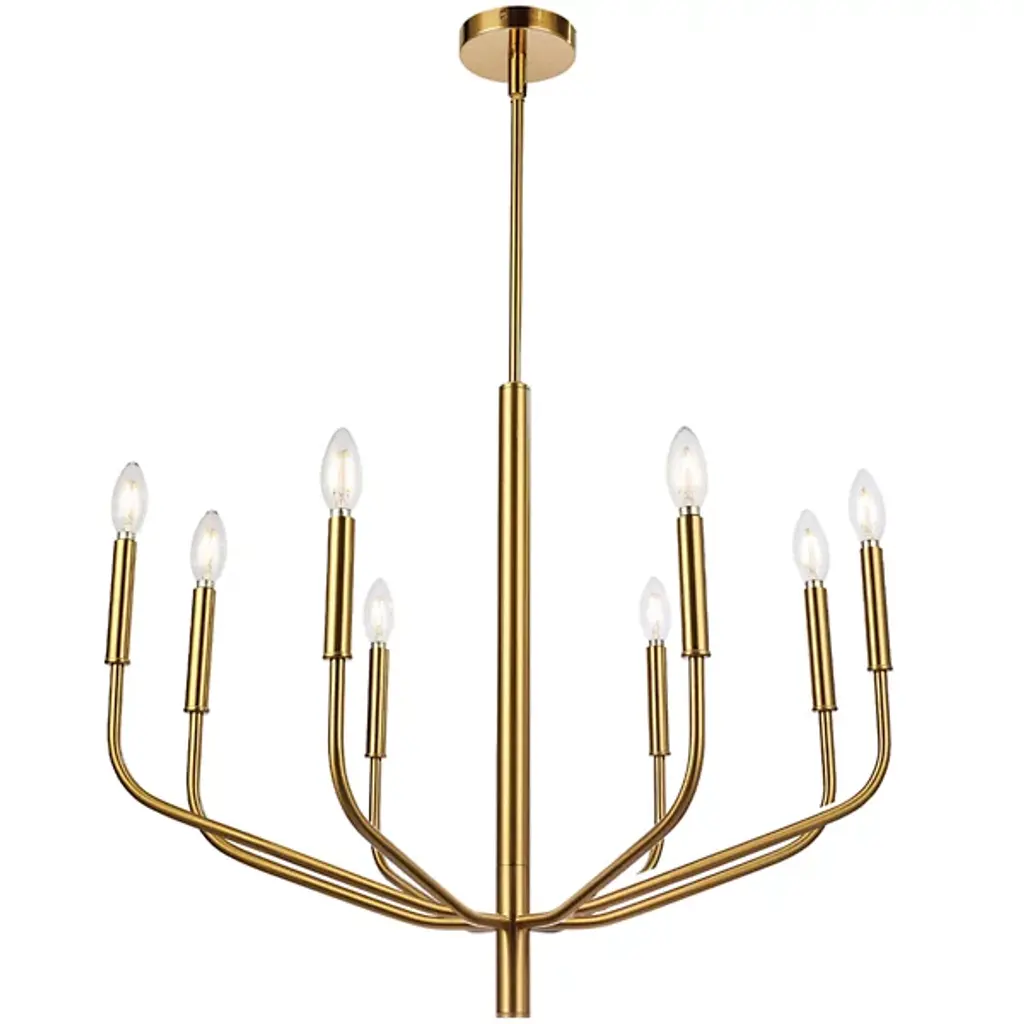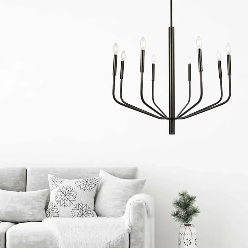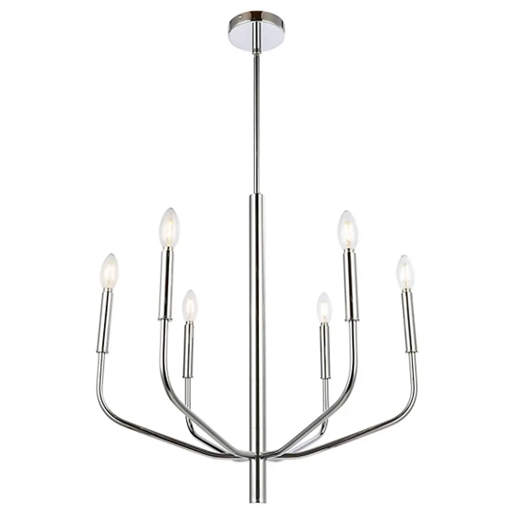 The Eleanor Chandelier by Dainolite is a simple fixture with a clean style. Its circular canopy sends a downrod to a set of slender metal arms. Each arm extends upward and gently angles to support tubular candlesticks with a slightly wider profile. Incandescent bulbs emit a wash of warm, ambient light throughout the space, unfettered by shades or additional adornments. This minimalistic fixture elevates a space effortlessly while providing ample illumination.