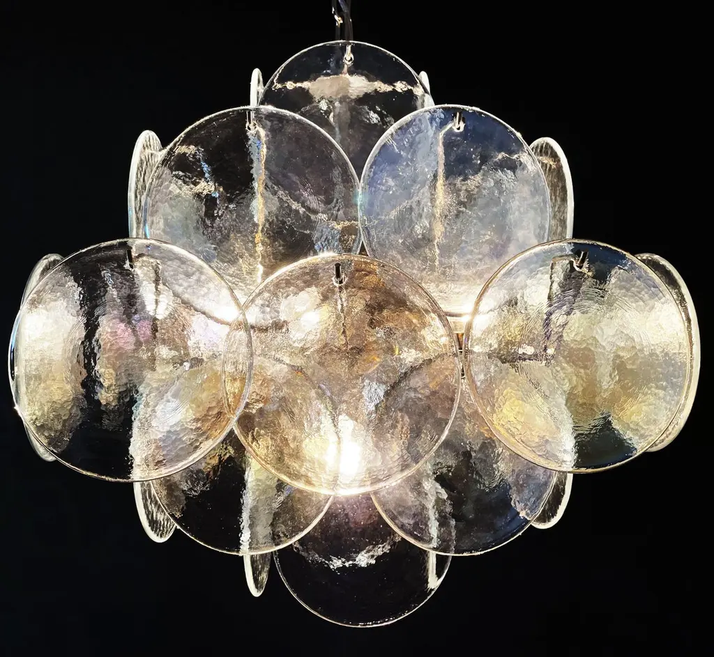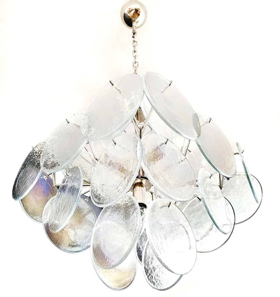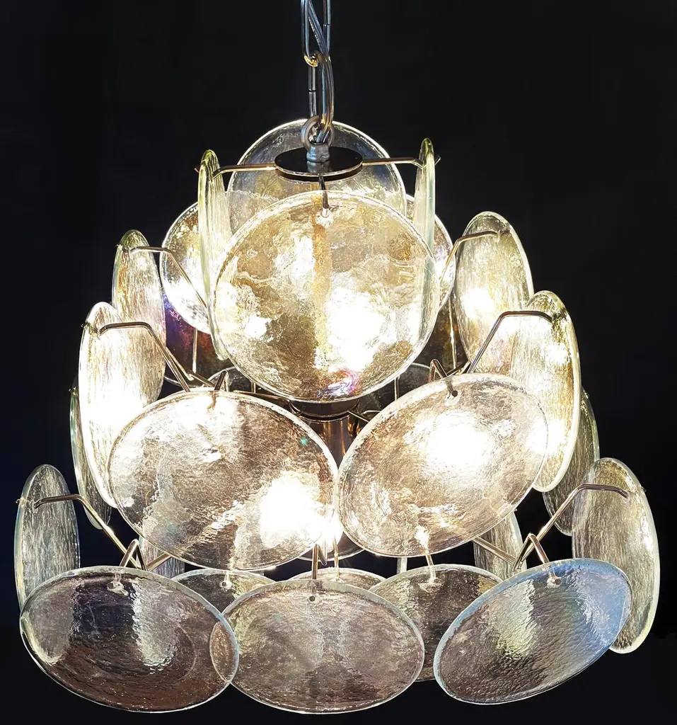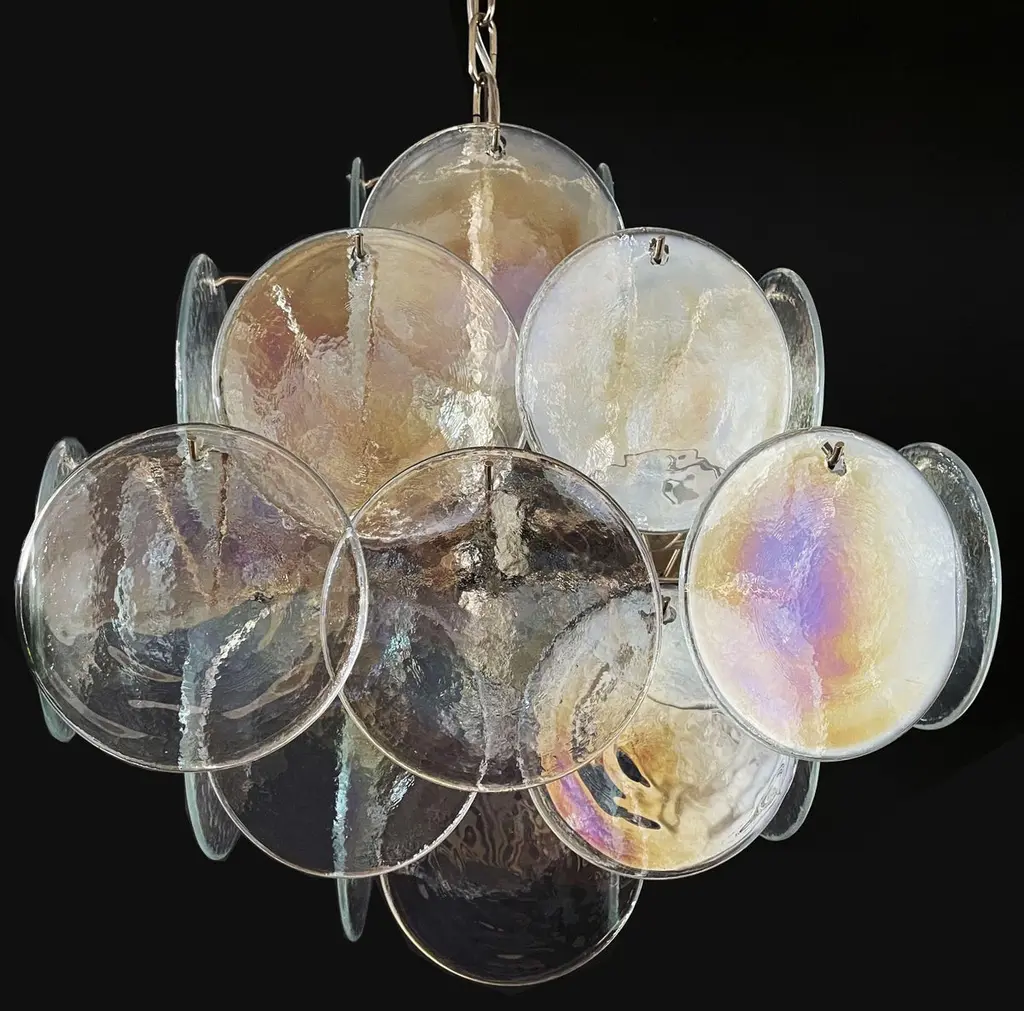 Vintage Italian Murano chandelier in Vistosi style. The chandelier has 36 fantastic iridescent discs in a nickel metal frame. The glasses have the particularity of reflecting a multiplicity of colors, which makes the chandelier a true work of art.Period: Late 20th centuryDimensions: 44,50 inches (150 cm) height with chain; 19,40 inches (50 cm) height without chain; 19,40 inches (50 cm) maximum diameter.Dimension glasses: 5.50 / 6.10 inches (14 / 15.5 cm) diameter (the diameter and thickness of the glass varies from each other, of glass concerned handmade)Light bulbs: 5 lights bulbs (E14 Dimension, not included in the sale) - On request we can replace the lampholders with those suitable for the American electrical system.Condition: Perfect condition and fully working. The glasses are perfect and the chrome has wear consisting in age and use.