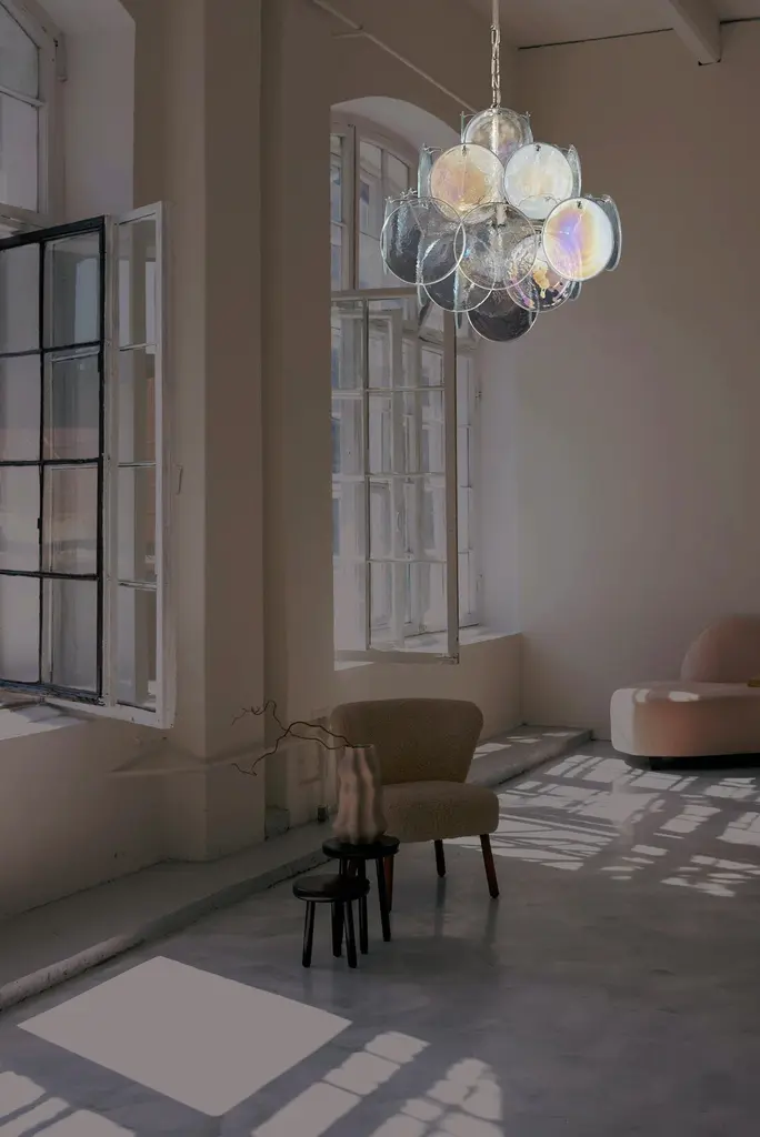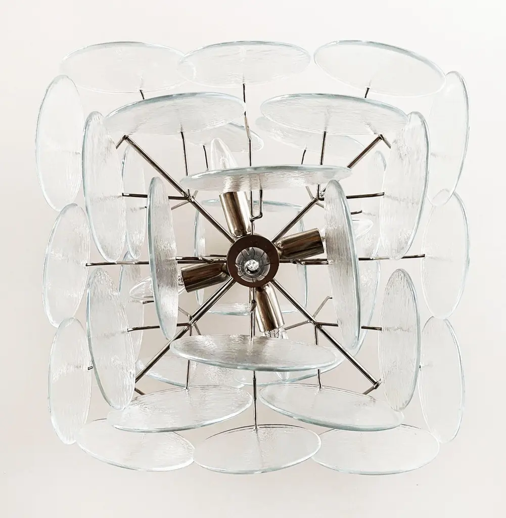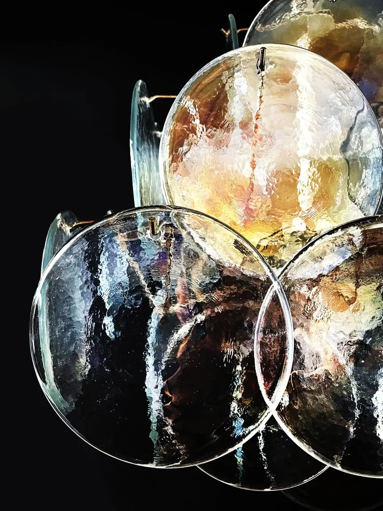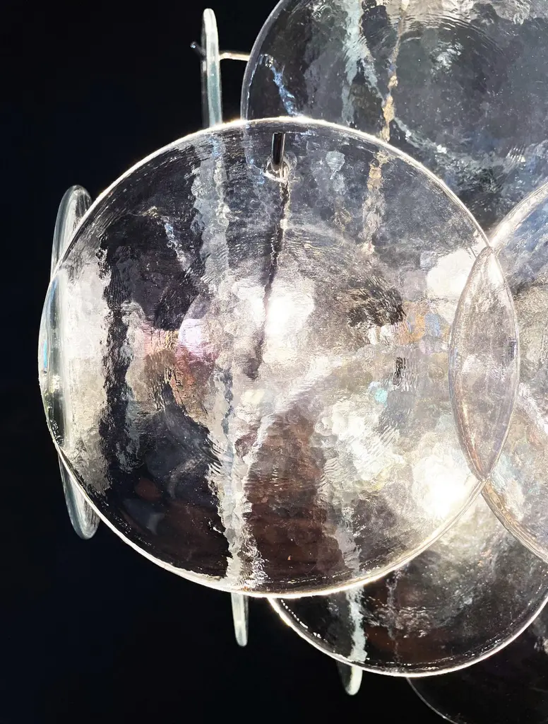 Vintage Italian Murano chandelier in Vistosi style. The chandelier has 36 fantastic iridescent discs in a nickel metal frame. The glasses have the particularity of reflecting a multiplicity of colors, which makes the chandelier a true work of art.Period: Late 20th centuryDimensions: 44,50 inches (150 cm) height with chain; 19,40 inches (50 cm) height without chain; 19,40 inches (50 cm) maximum diameter.Dimension glasses: 5.50 / 6.10 inches (14 / 15.5 cm) diameter (the diameter and thickness of the glass varies from each other, of glass concerned handmade)Light bulbs: 5 lights bulbs (E14 Dimension, not included in the sale) - On request we can replace the lampholders with those suitable for the American electrical system.Condition: Perfect condition and fully working. The glasses are perfect and the chrome has wear consisting in age and use.
