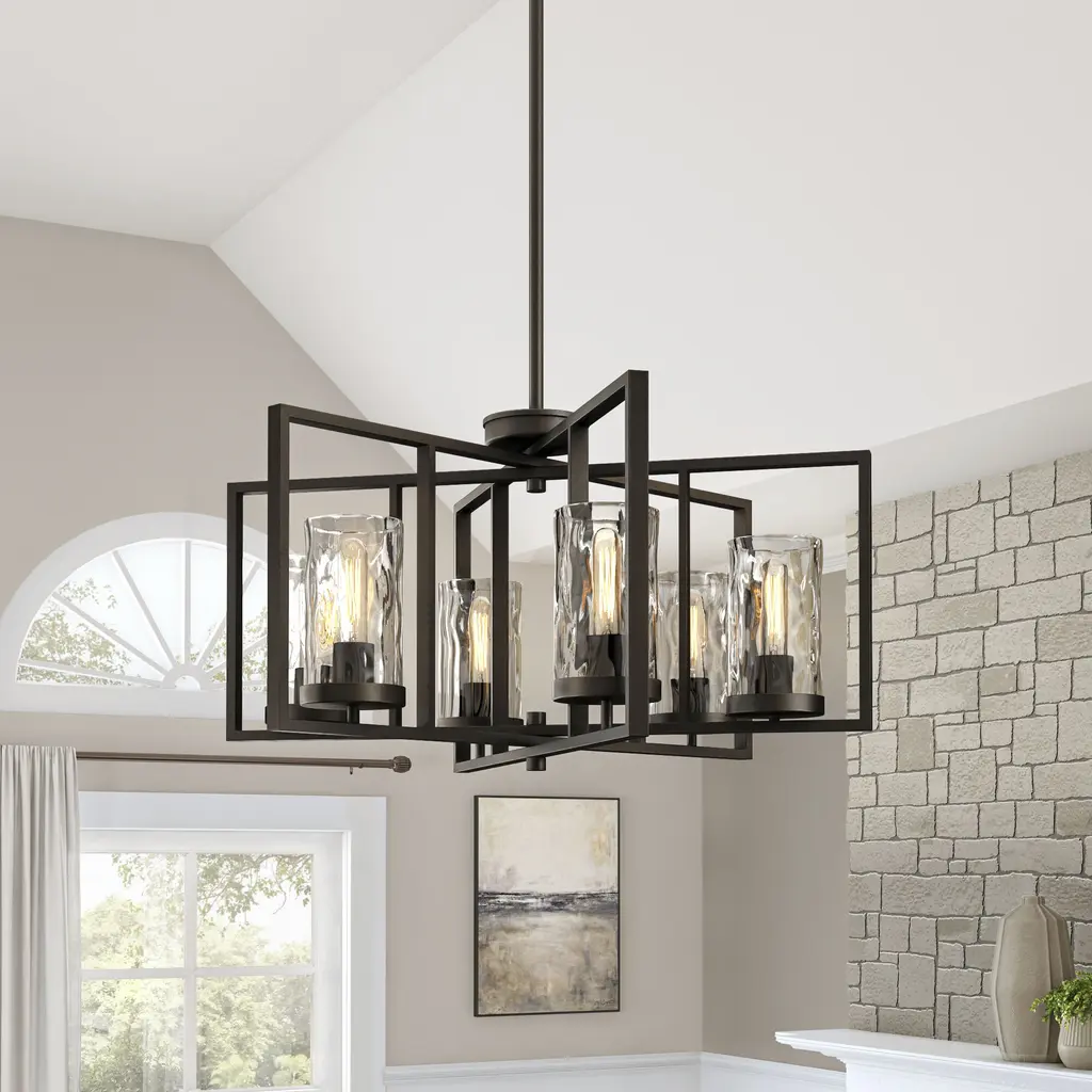 The Elements Collection comes in Charcoal with Rain glass. This Transitional Elements 6 Light Chandelier will complement the decor in any room of your home. Made with solid steel construction to look great and last for years to come. The Elements collection features the perfect design for Craftsman or Mission inspired room settings. The filament lamp will inspire the 20th century feel.