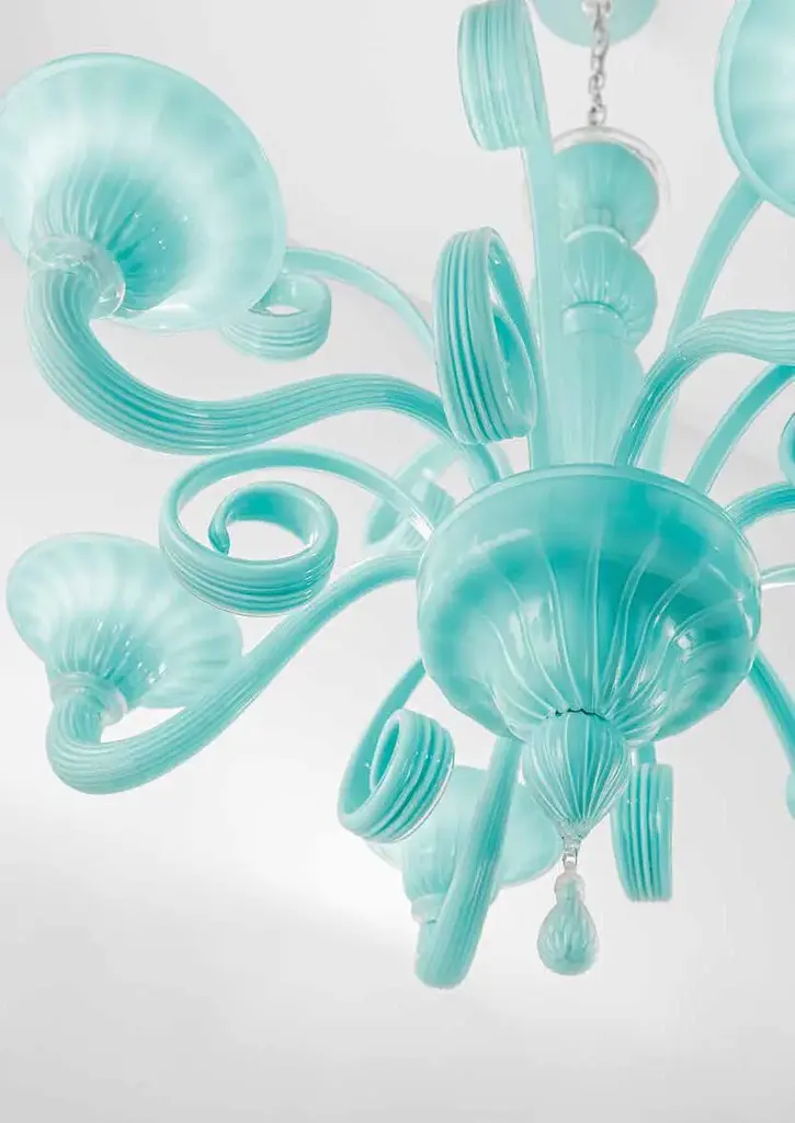 Elena is a chandelier in blown glass, an object meticulously worked, selecting a range of metallic finishes, glass colours and precious details that make it unique and handcrafted.1017/6: 6 bulbs (E14 - 40W)
