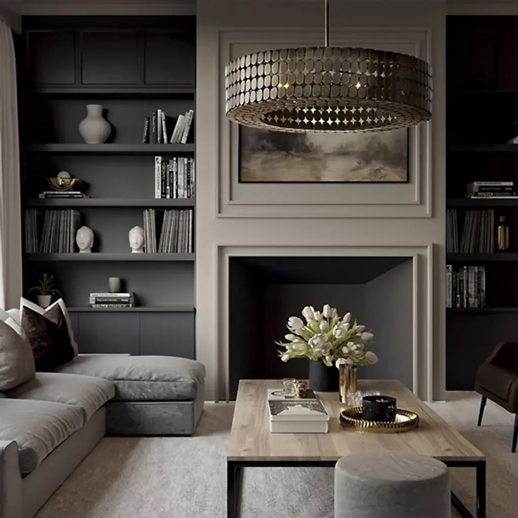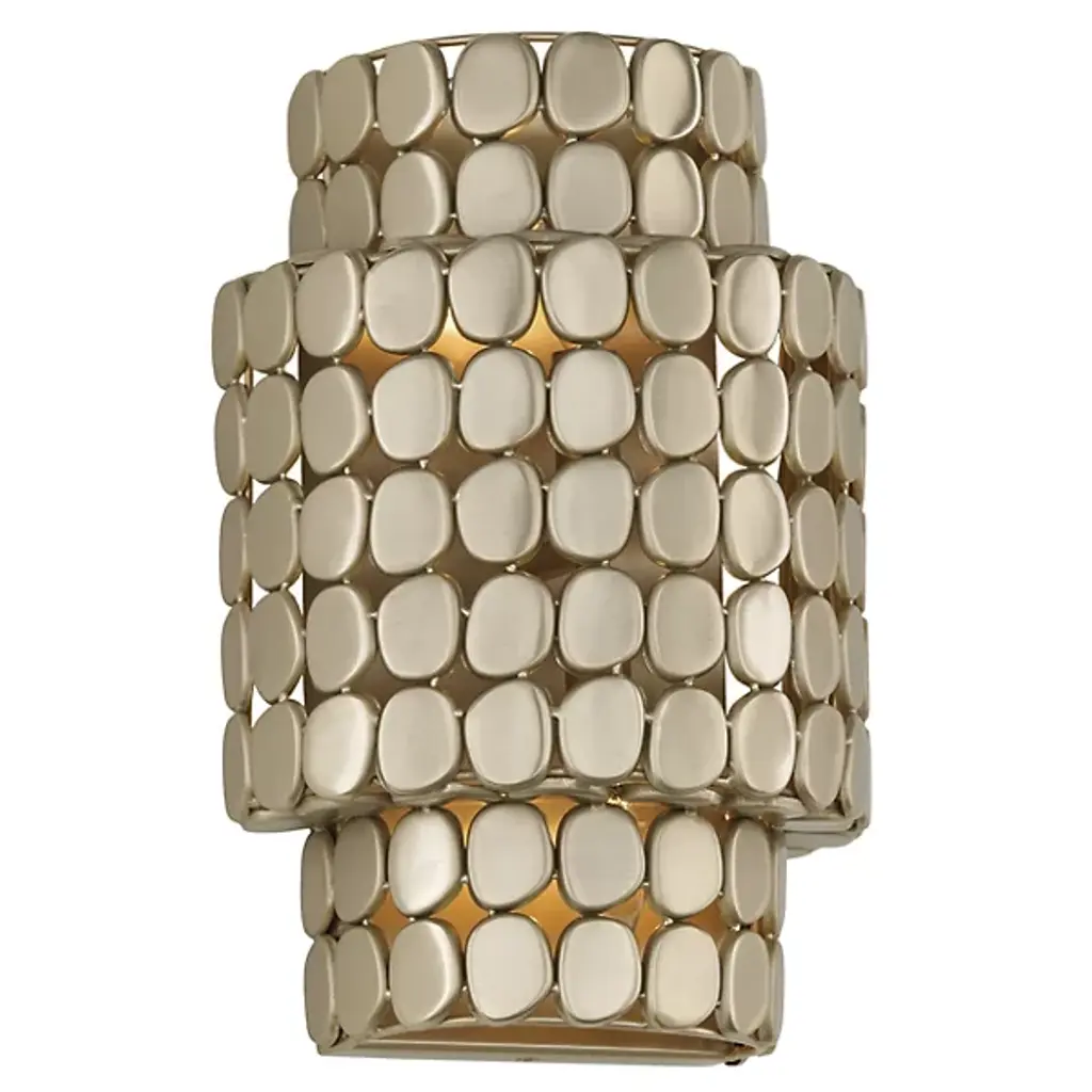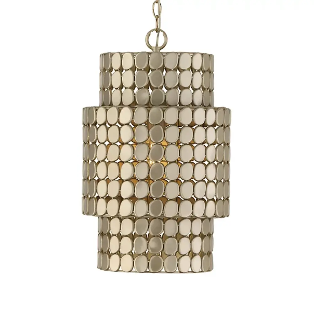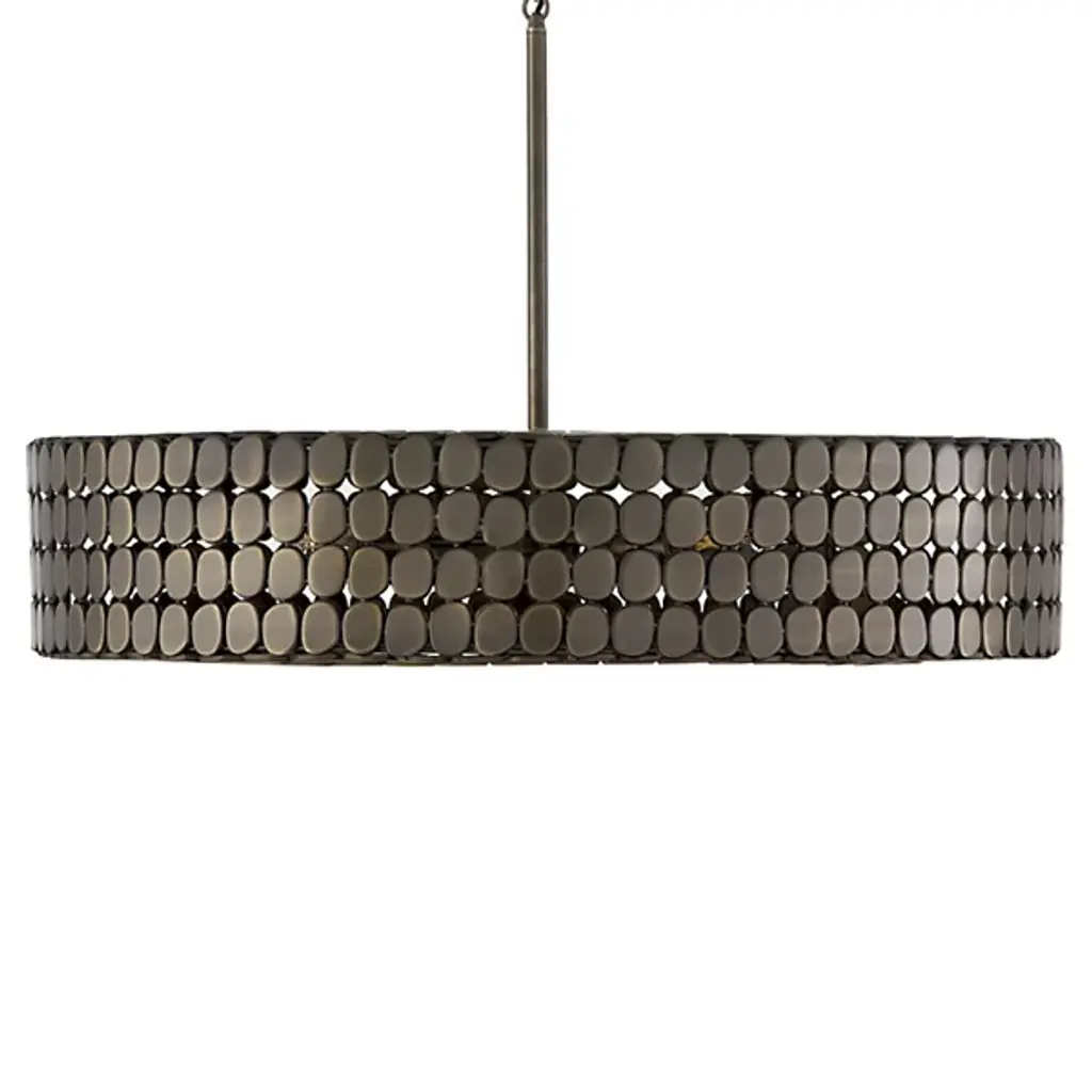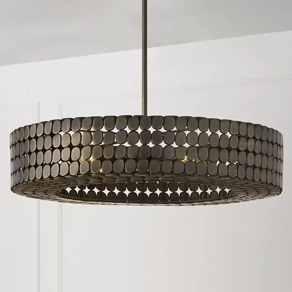The Eliana Chandelier from Capital Lighting creates a dialogue between light and material through its arrangement of metal medallions. The horizontal socket placement ensures light radiates outward through the spaces between discs rather than simply downward. Handcrafted attention appears in the precise placement of each metal element, allowing controlled glimpses of the light source within. The drum form provides a contemporary foundation, while the detailed medallion pattern adds artisan complexity. The spacing between elements lets light escape in calculated patterns that transform surrounding spaces. This fixture balances modern restraint with decorative richness.