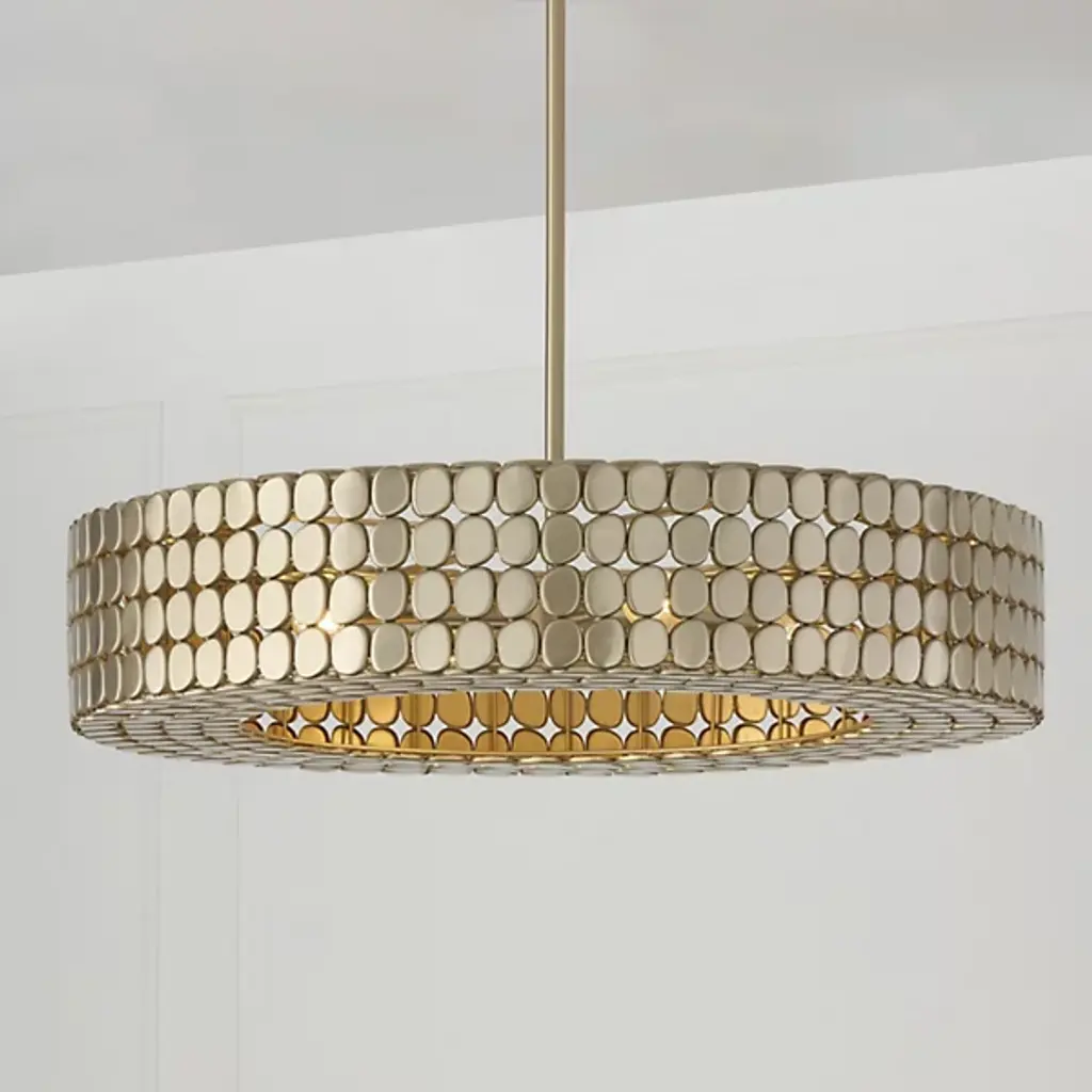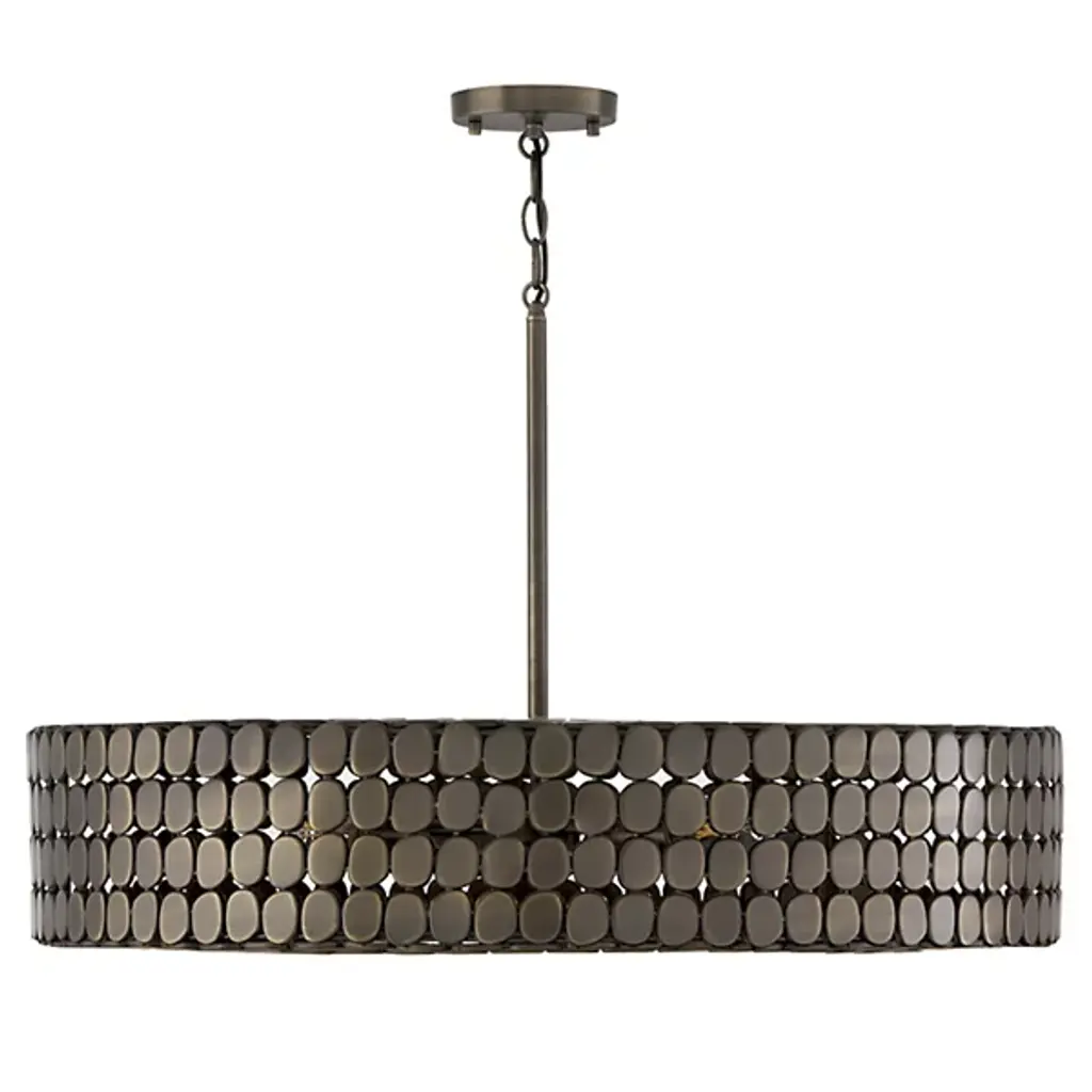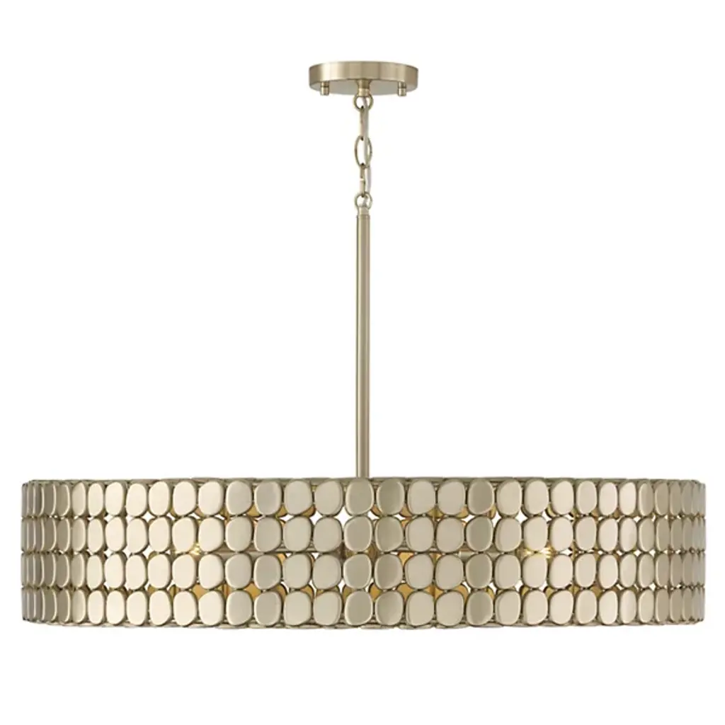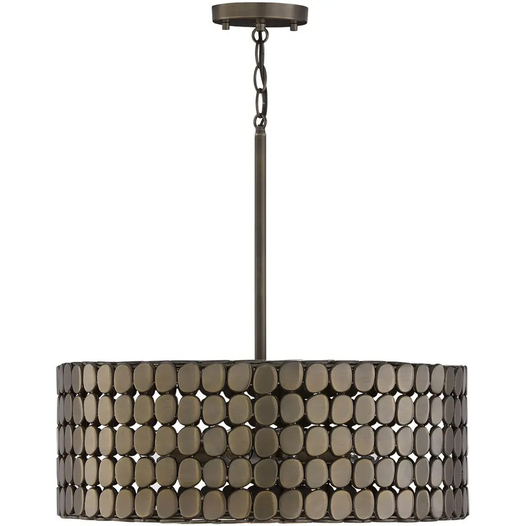 The Eliana Chandelier from Capital Lighting creates a dialogue between light and material through its arrangement of metal medallions. The horizontal socket placement ensures light radiates outward through the spaces between discs rather than simply downward. Handcrafted attention appears in the precise placement of each metal element, allowing controlled glimpses of the light source within. The drum form provides a contemporary foundation, while the detailed medallion pattern adds artisan complexity. The spacing between elements lets light escape in calculated patterns that transform surrounding spaces. This fixture balances modern restraint with decorative richness.