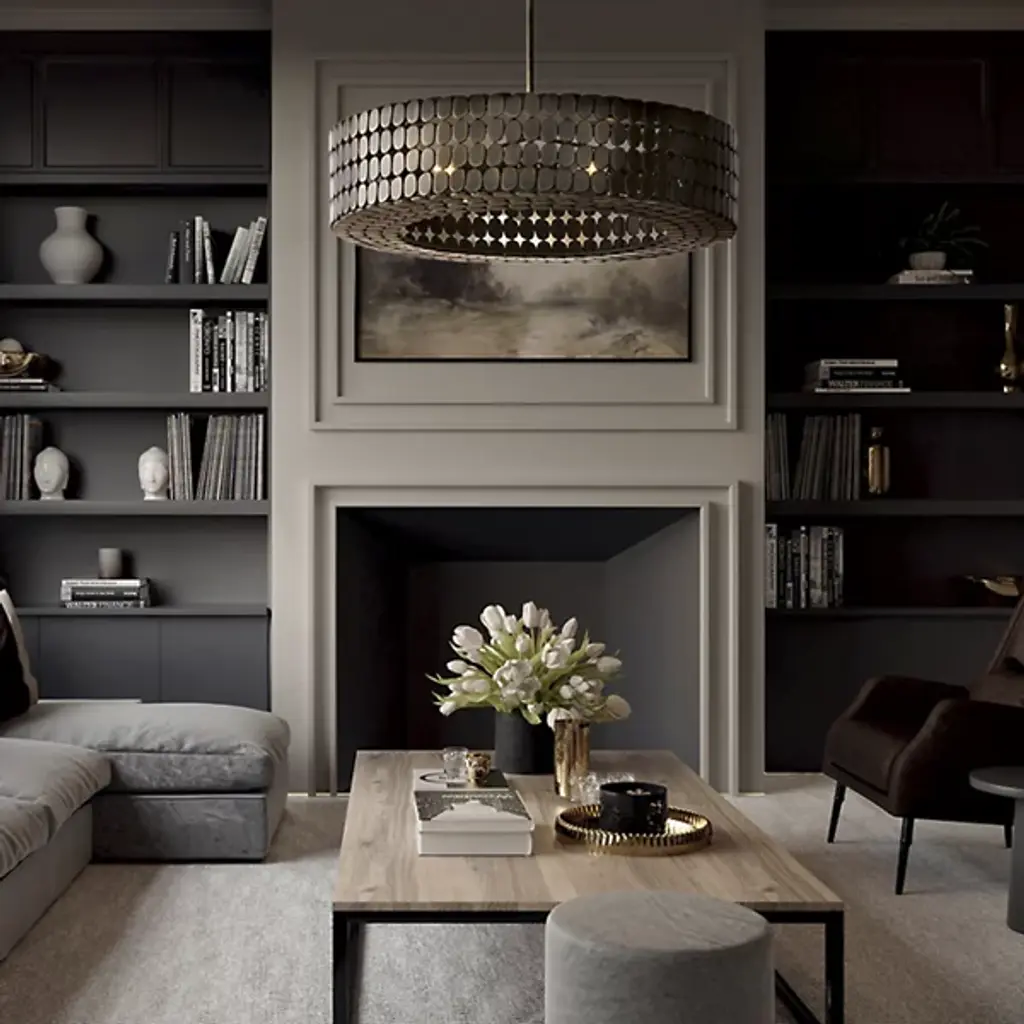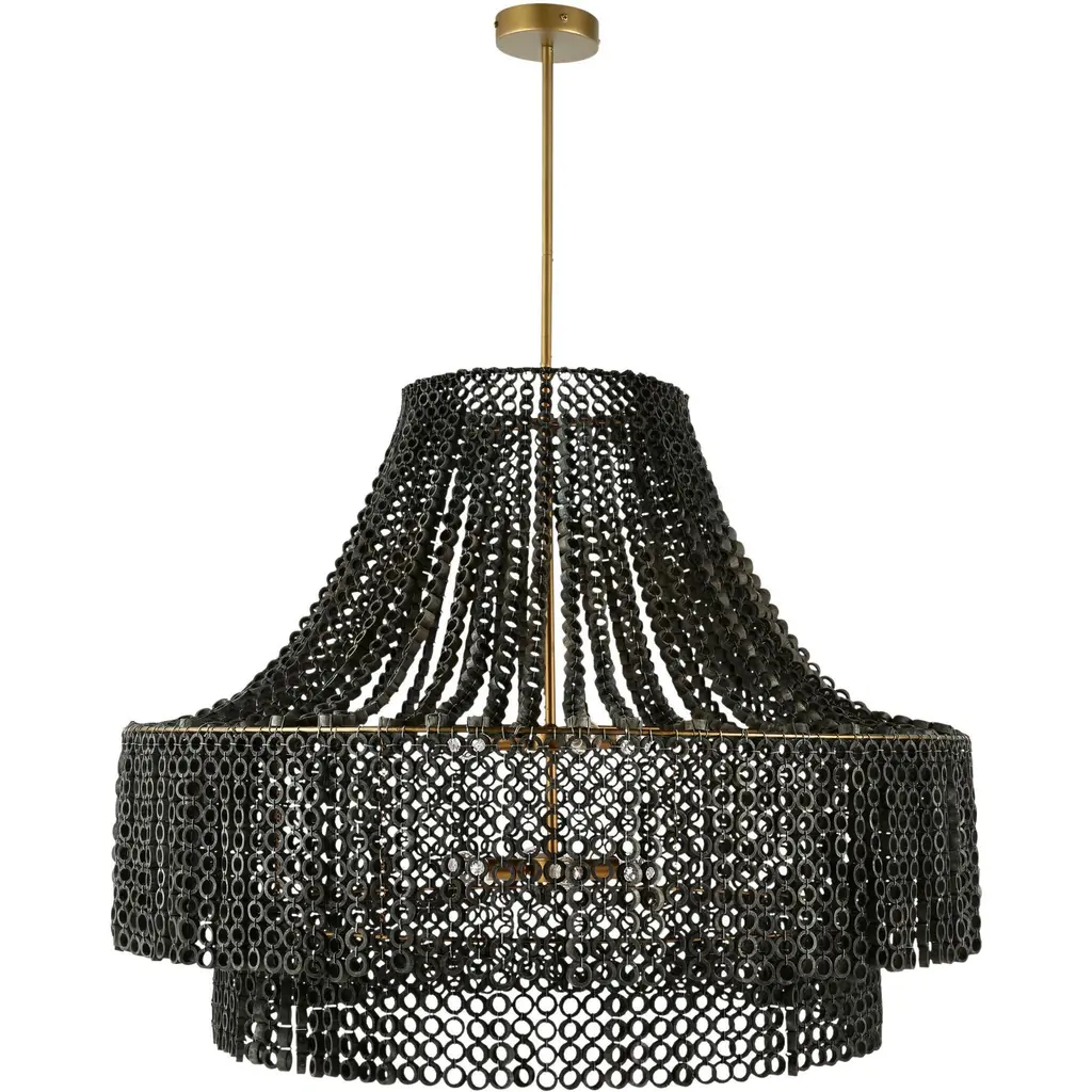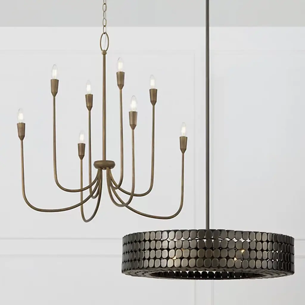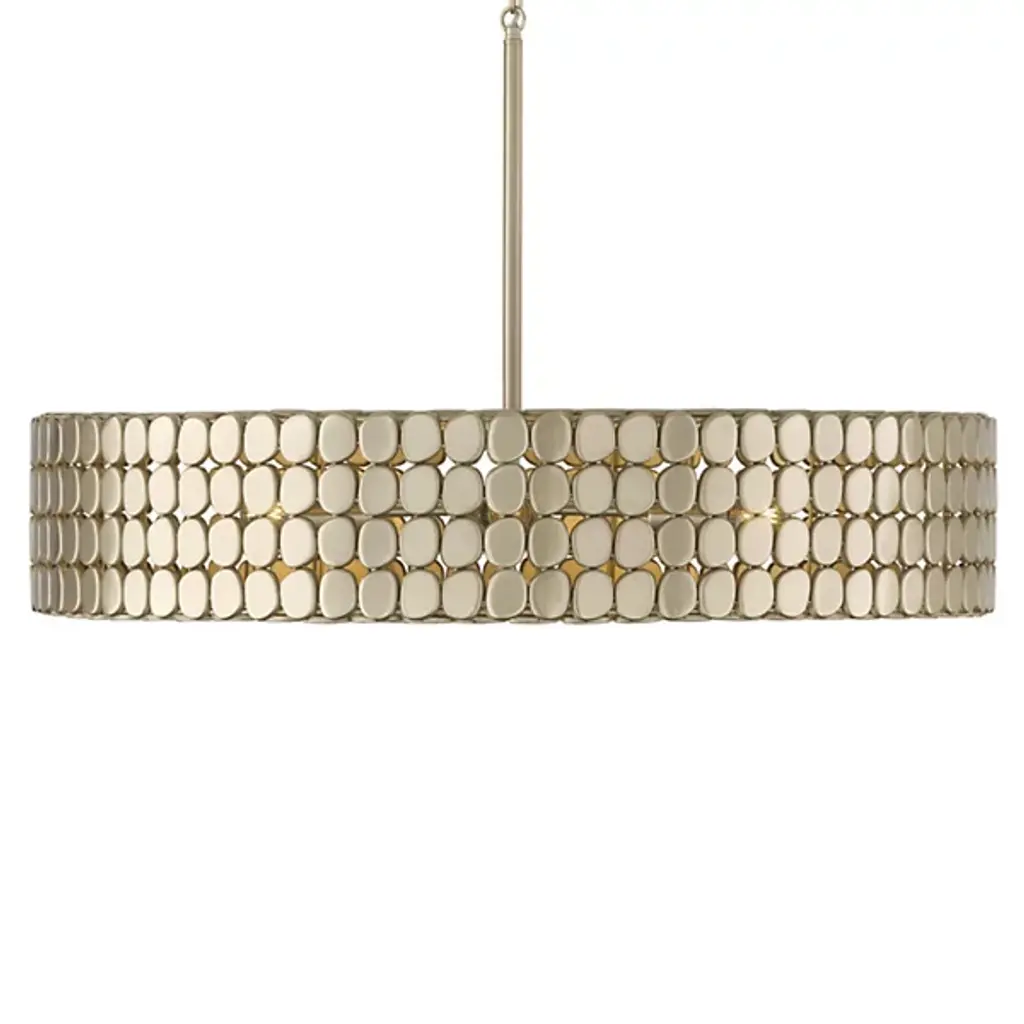 The Eliana Chandelier from Capital Lighting creates a dialogue between light and material through its arrangement of metal medallions. The horizontal socket placement ensures light radiates outward through the spaces between discs rather than simply downward. Handcrafted attention appears in the precise placement of each metal element, allowing controlled glimpses of the light source within. The drum form provides a contemporary foundation, while the detailed medallion pattern adds artisan complexity. The spacing between elements lets light escape in calculated patterns that transform surrounding spaces. This fixture balances modern restraint with decorative richness.