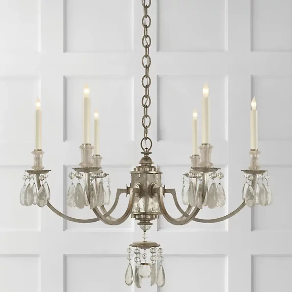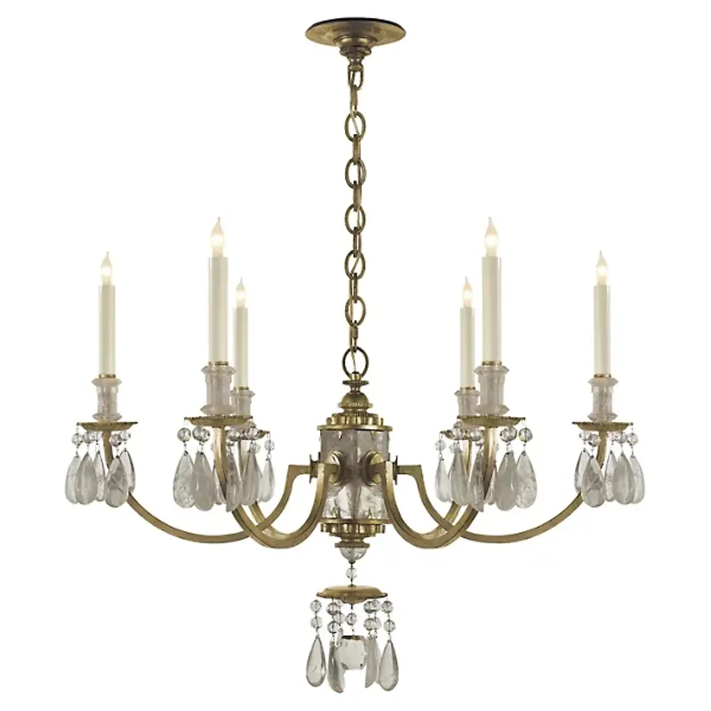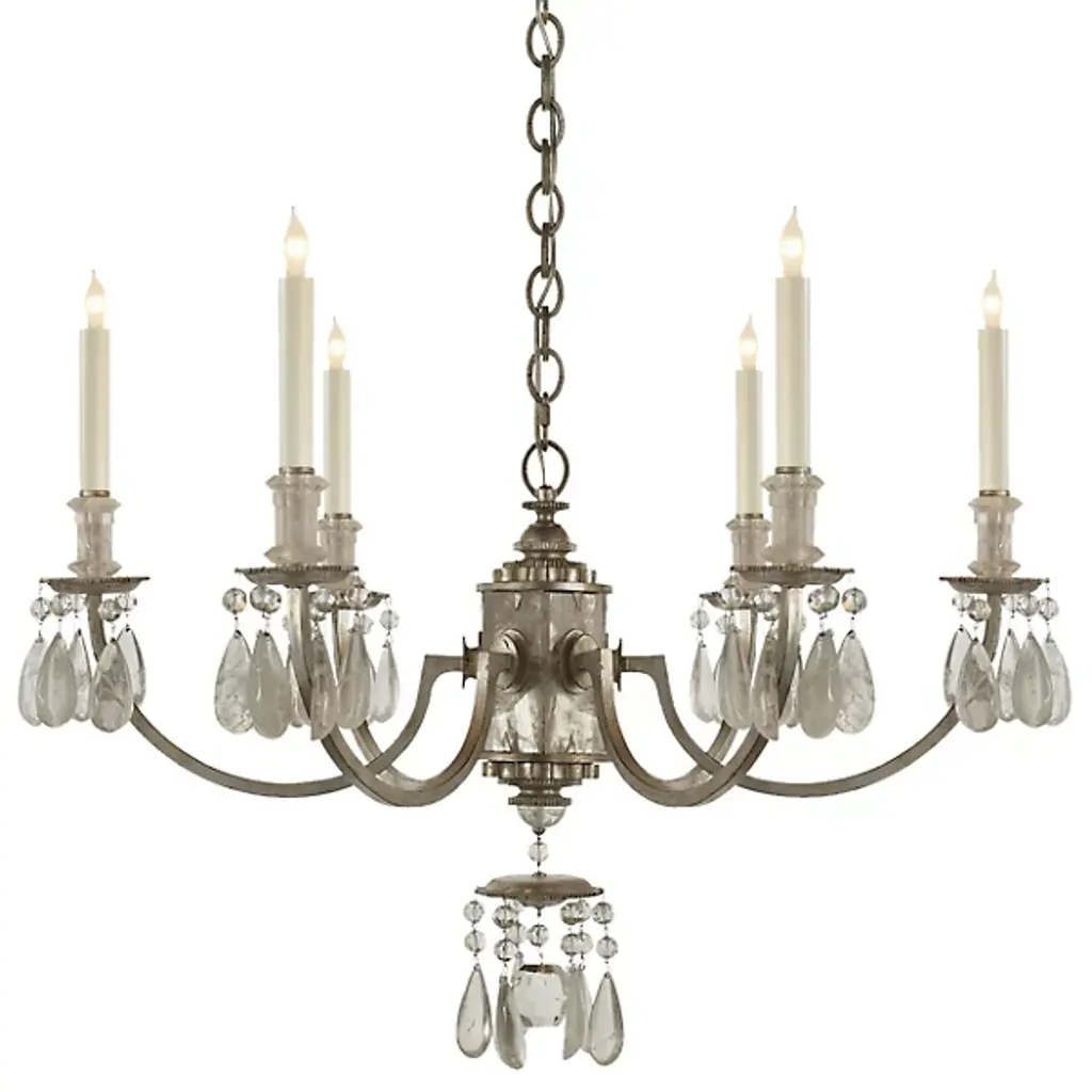 Make every dining experience an elegant occasion with the addition of an Elizabeth 6-Lght Chandelier by Visual Comfort Signature, formerly known as Visual Comfort, All 6 curved arms host a candelabra socket and are accented with teardrop pieces crafted from quartz that give this fixture a rich and regal ambiance. With such a captivating presence, this chandelier would look equally stunning gracing an entryway or formal family room.