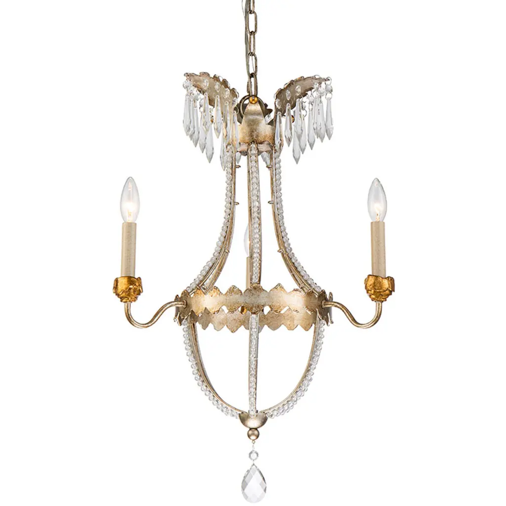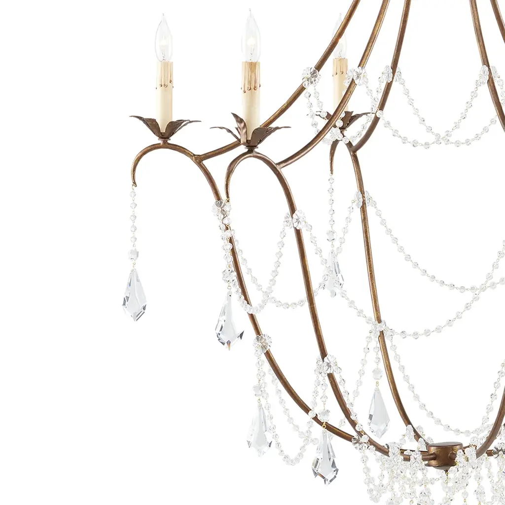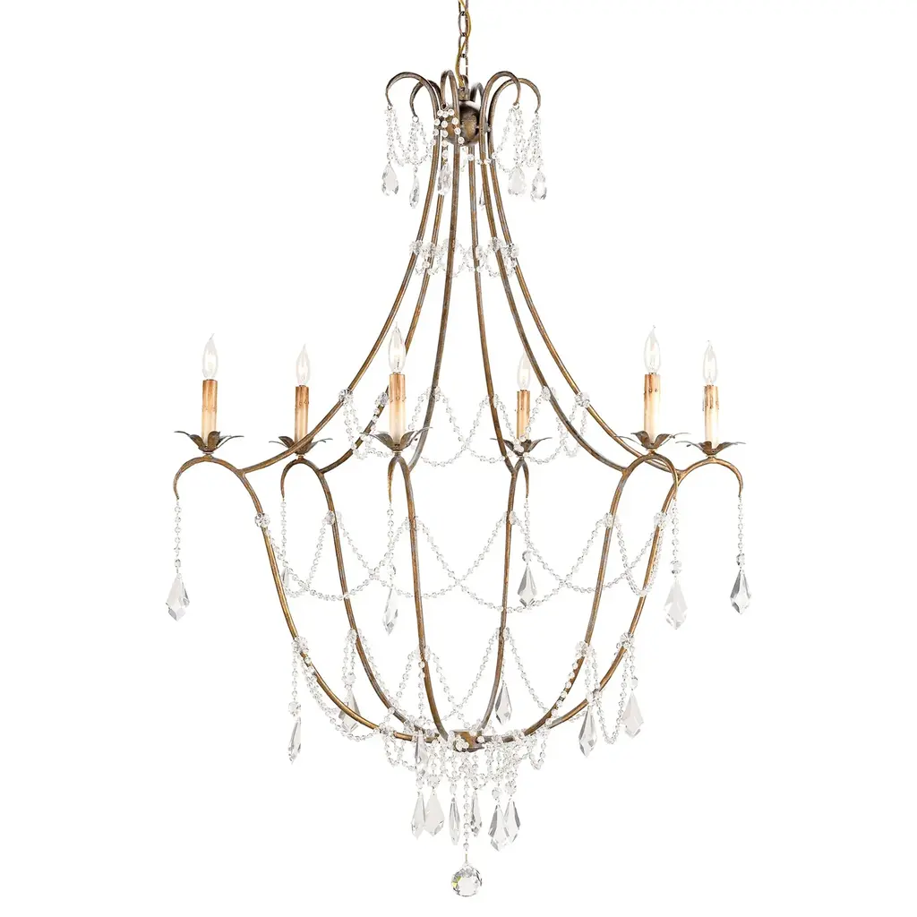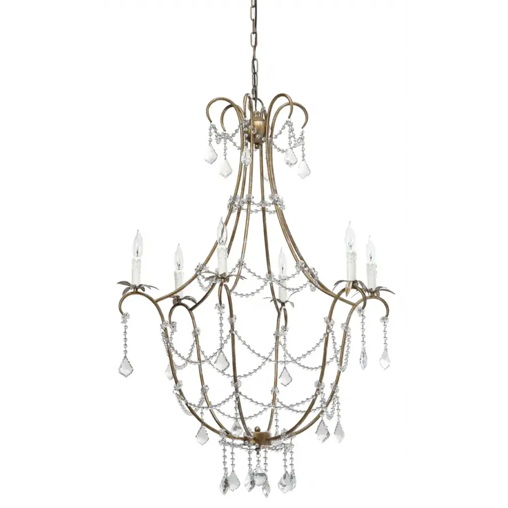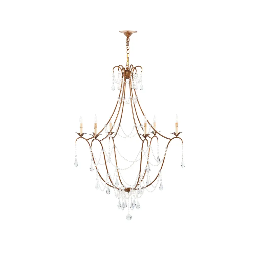 Our Elizabeth Gold Chandelier has an airy iron frame draped with tasteful crystal accents. Teardrops and beaded stands adorn this six-light chandelier in a Rhine gold Granello finish to bring luminosity to its formal chandelier shape. Ships In 7-10 Business Days This image is for illustrative purposes only. The colors shown are accurate within the constraints of lighting, photography, and the color accuracy of your screen.