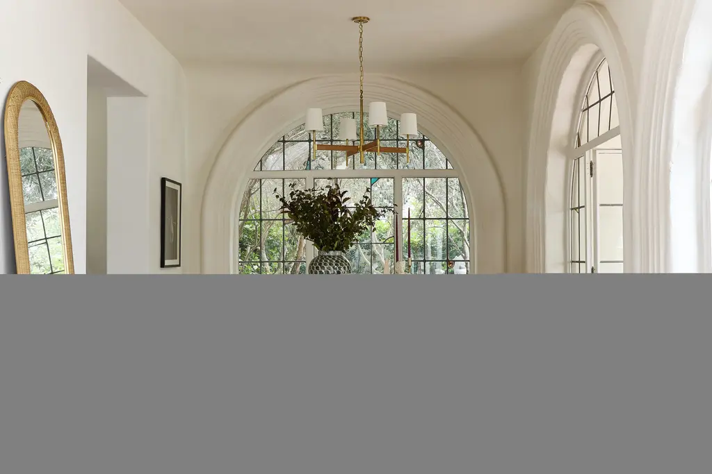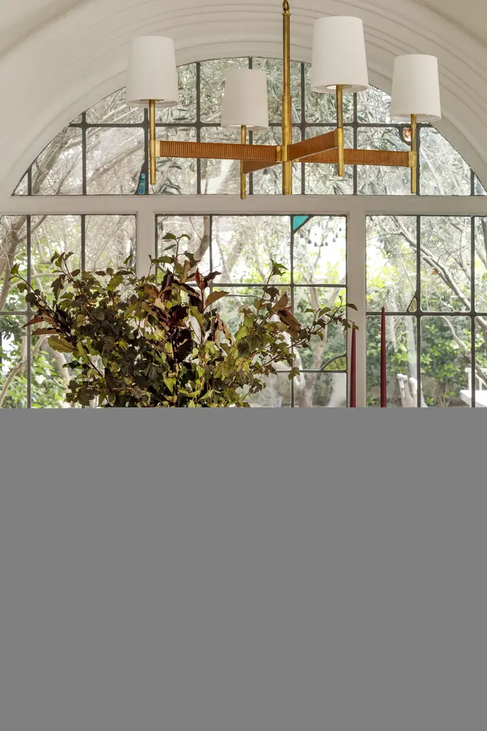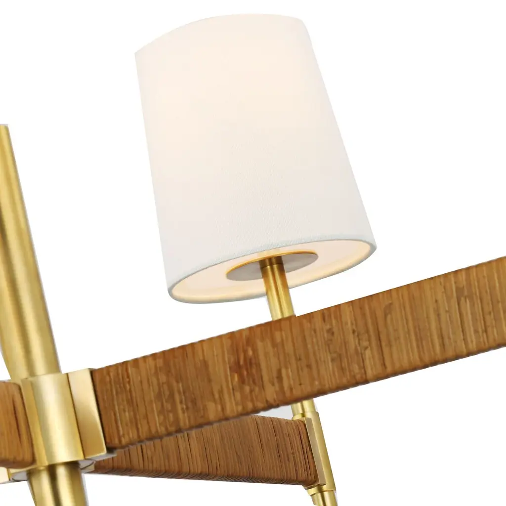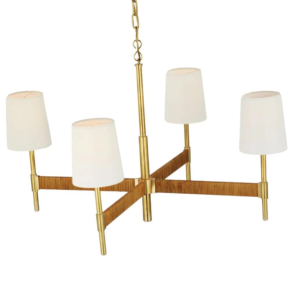 Rattan wrapped around this chandelier's four arms provides an organic contrast to the gleaming metal and adds warmth to the angular shape. The four white linen shades are an ideal grace note.