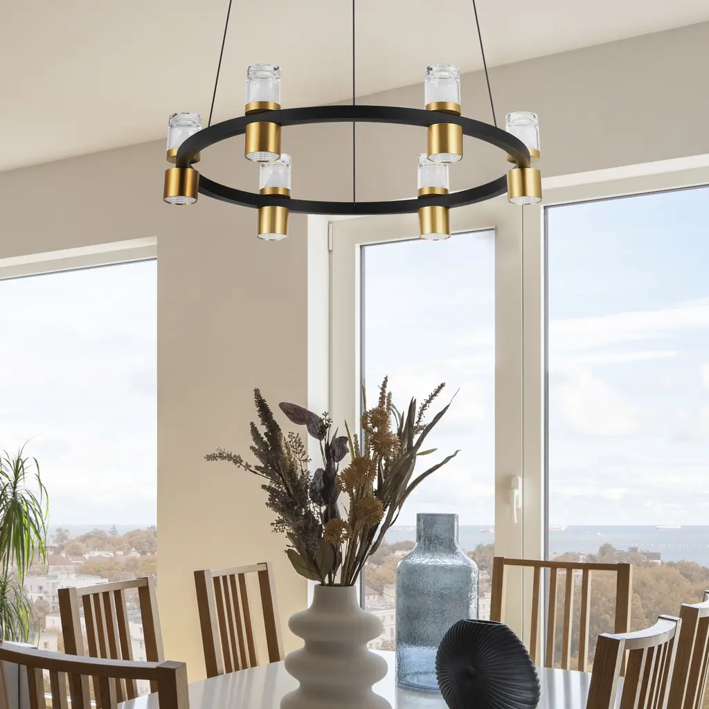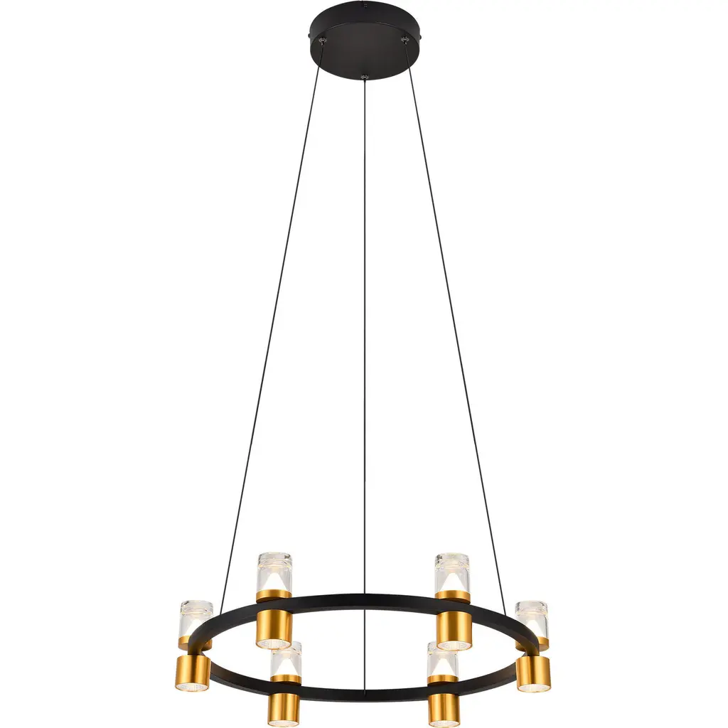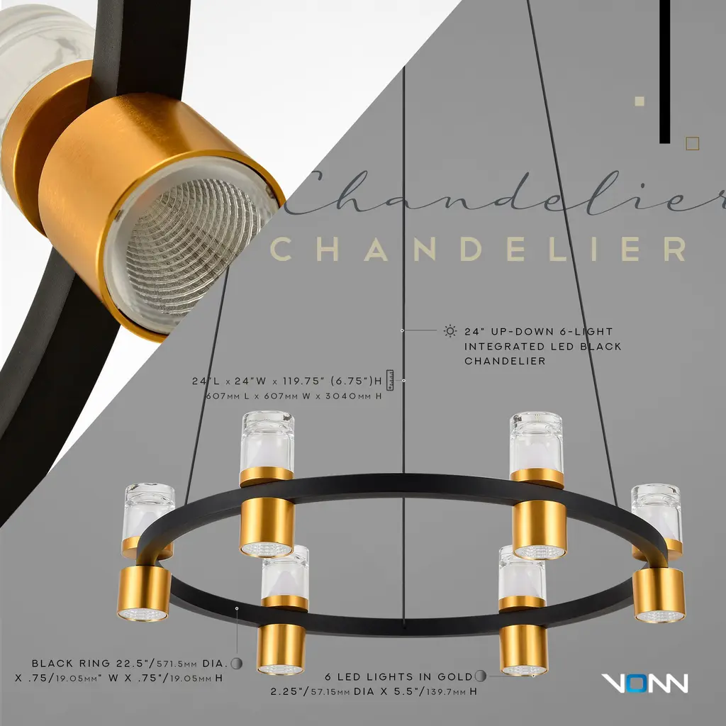 From VONN's Ellegi Series, the VMC34224BL Integrated LED Chandelier is a modern 24-inch fixture made from aluminum and acrylic, with a Powder Coated Black aluminum canopy and an Integrated LED Shade. The shade consists of a 22.5-inch Black aluminum Ring and 6 attached spotlights in Anodized Gold for a modern look. Emitting a soft white ambient light at 3000 Kelvin, it offers adjustable height, dimmable functionality, and compatibility with sloped ceilings. With 3407.80 Lumens brightness, an energy-efficient power consumption of 46.94 Watts, and CRI 90, this chandelier combines style and efficiency for versatile and customizable illumination.