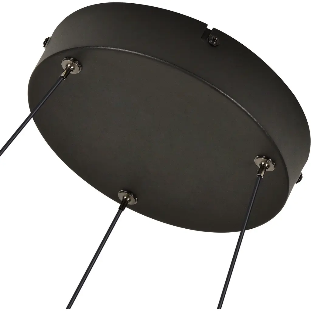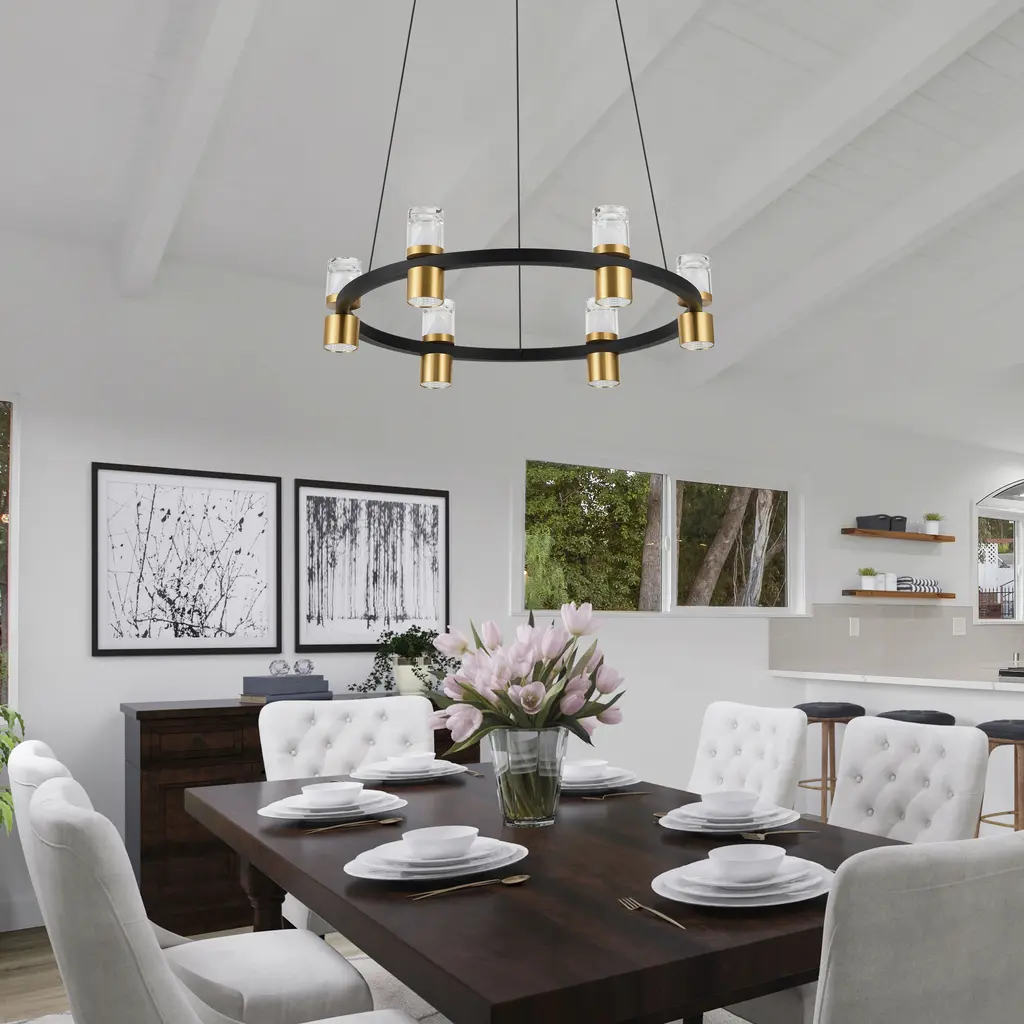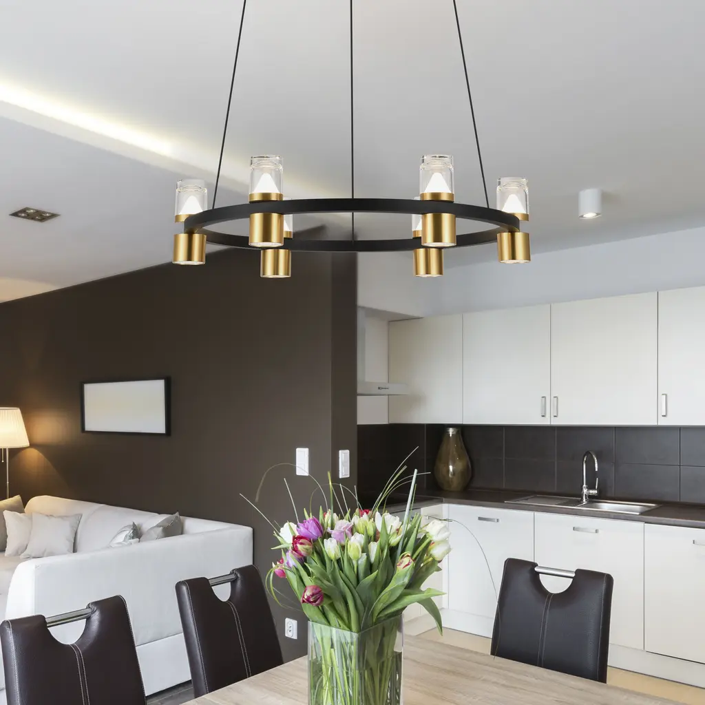 From VONN's Ellegi Series, the VMC34224BL Integrated LED Chandelier is a modern 24-inch fixture made from aluminum and acrylic, with a Powder Coated Black aluminum canopy and an Integrated LED Shade. The shade consists of a 22.5-inch Black aluminum Ring and 6 attached spotlights in Anodized Gold for a modern look. Emitting a soft white ambient light at 3000 Kelvin, it offers adjustable height, dimmable functionality, and compatibility with sloped ceilings. With 3407.80 Lumens brightness, an energy-efficient power consumption of 46.94 Watts, and CRI 90, this chandelier combines style and efficiency for versatile and customizable illumination.