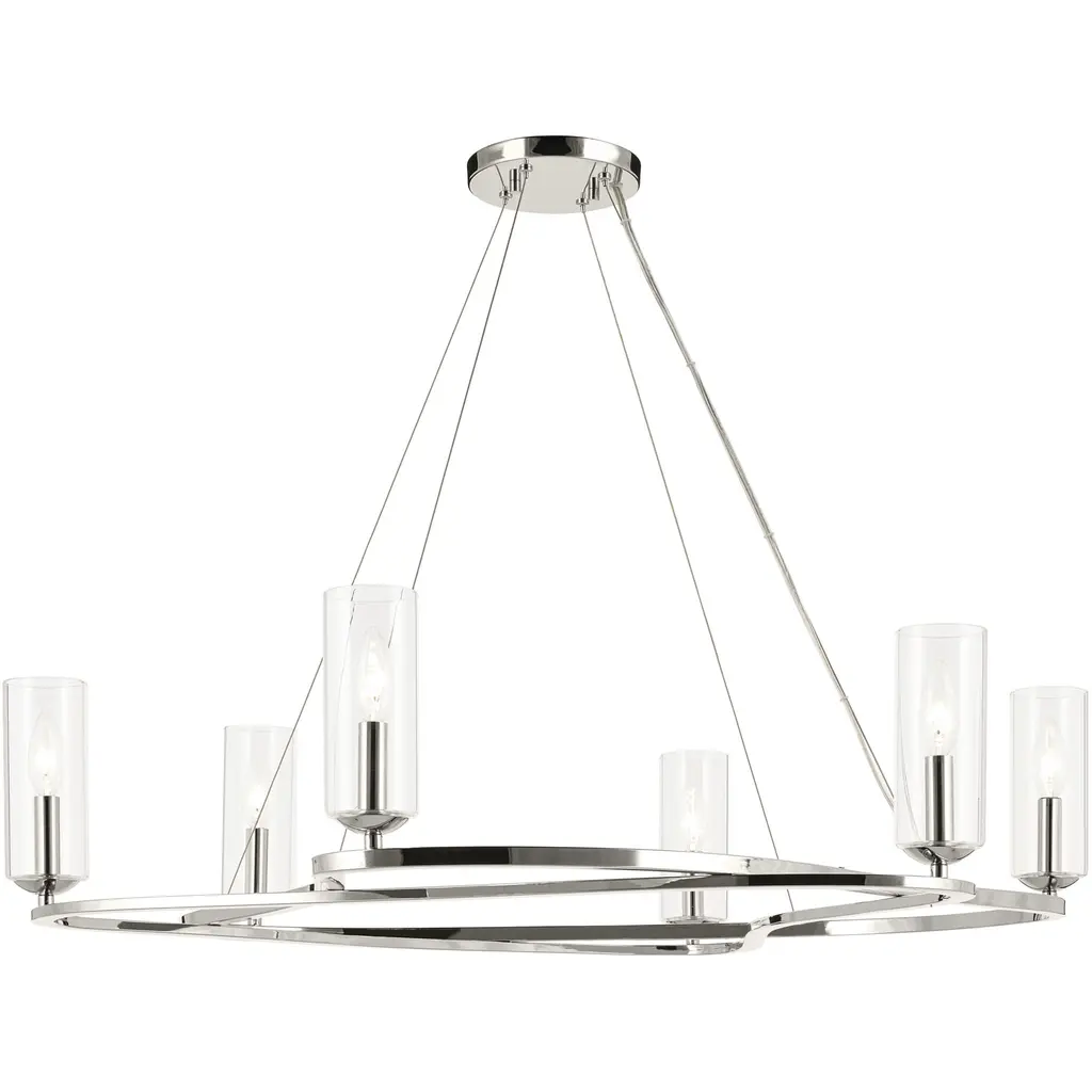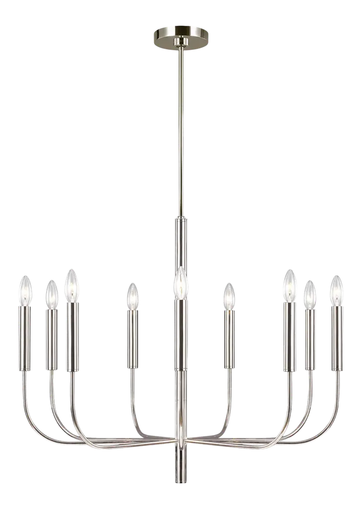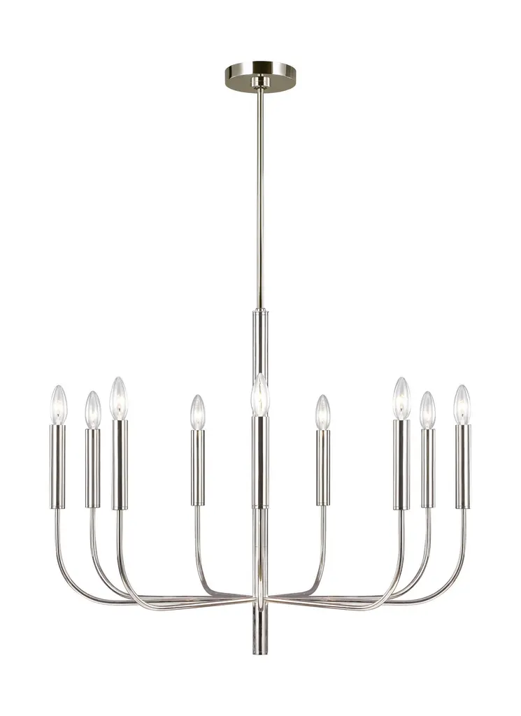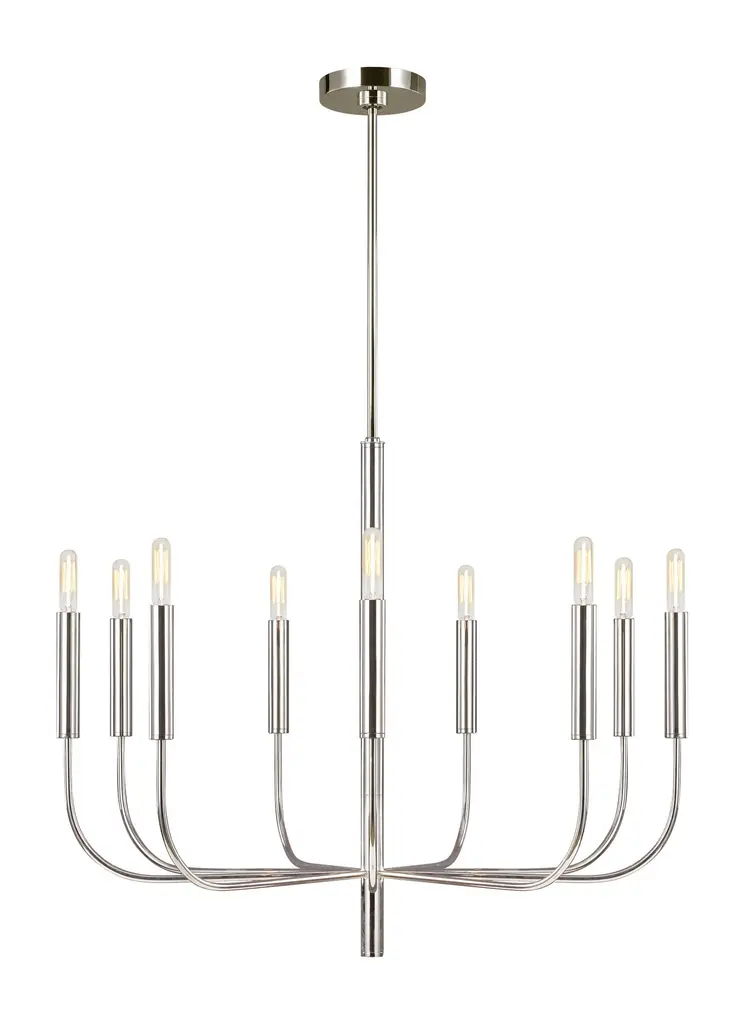 The Brianna nine light single tier chandelier in polished nickel supplies ample lighting for your daily needs, while adding a layer of today's style to your home's décor. Brianna's graceful, seamless curvature and elongated tubular arms lend fluidity and modern appeal to this classic minimalist silhouette. Available in rich, gilded Burnished Brass and the more contemporary Polished Nickel finish. Brianna wall sconces include cylindrical shades in fresh White Linen. Designer: Ellen DeGeneres Max Height: 81.25 Canopy: D:5 1/2'' H:1 3/8'' Round Max Ceiling Slope (in degrees): 11 Lamping: 9 Torpedo Candelabra 60 watt light bulbs Voltage: 120 Bulb Included: No Safety Rating Location: damp