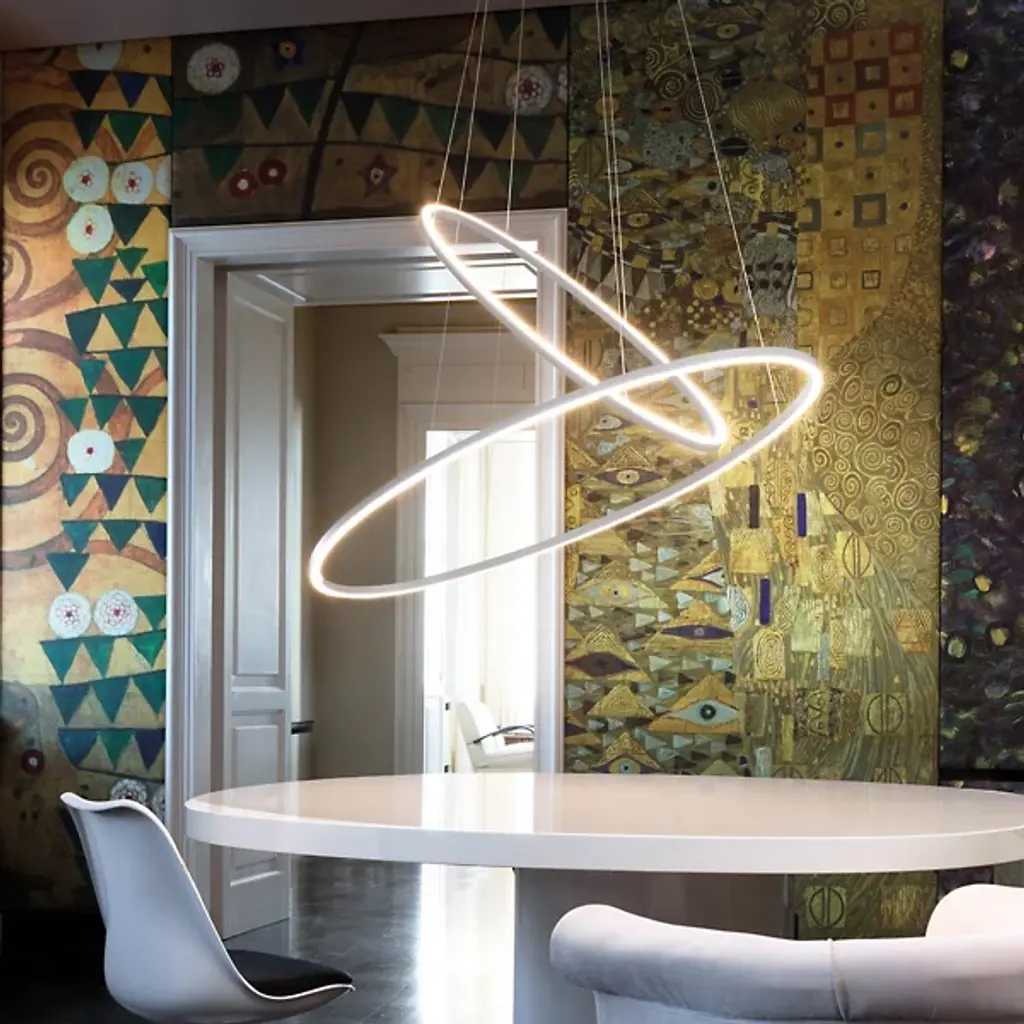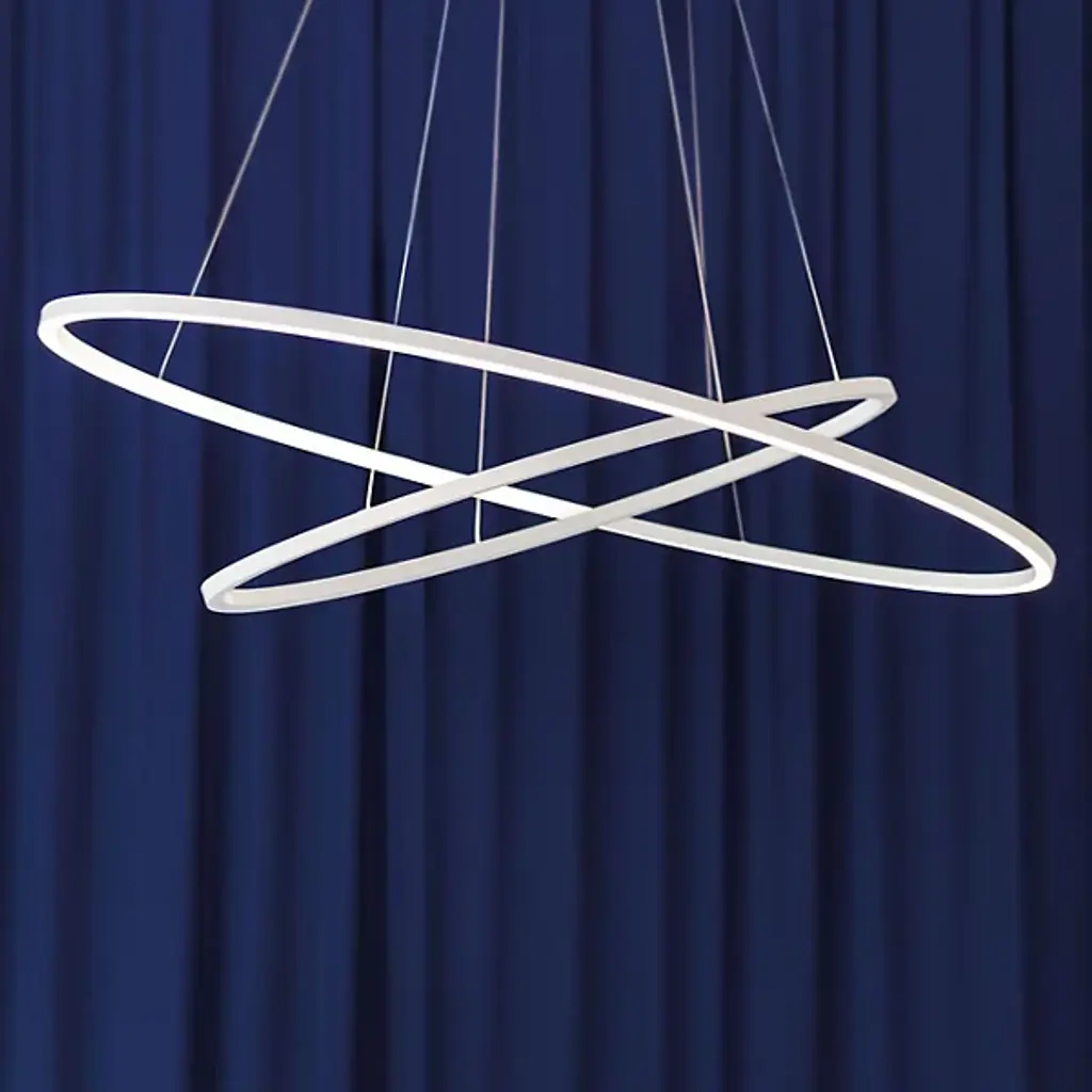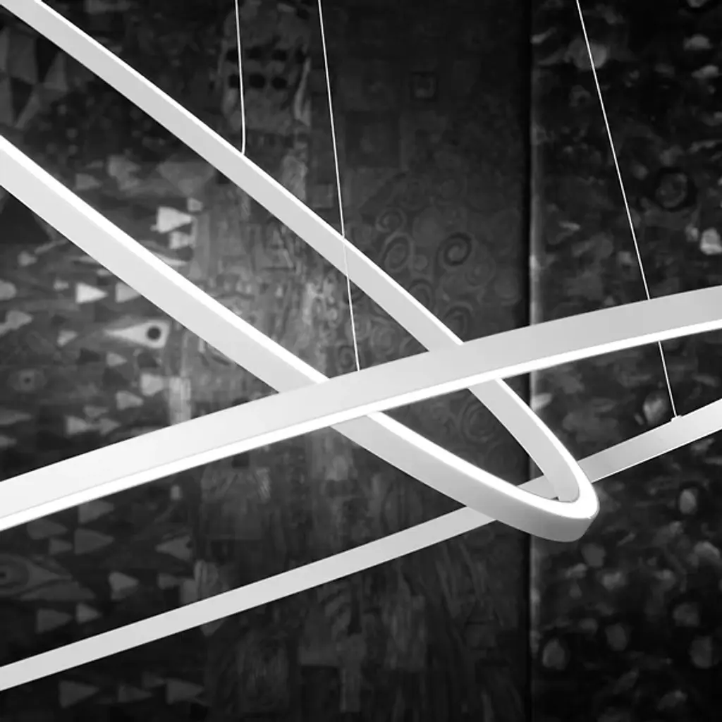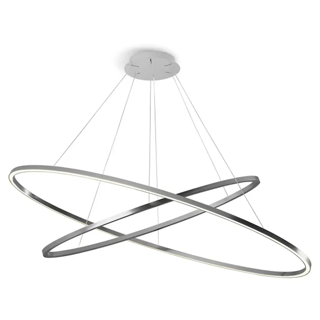 The Ellisse LED Double Chandelier from Nemo places two concentric rings together, forming the largest design in this constellation-inspired family. Both rings work in tandem to create an optimum amount of light. The rings are composed of Aluminum and are also lined with an opal diffuser to soften the double array of light in either direction. The structure can also be angled to alter the suspension style.