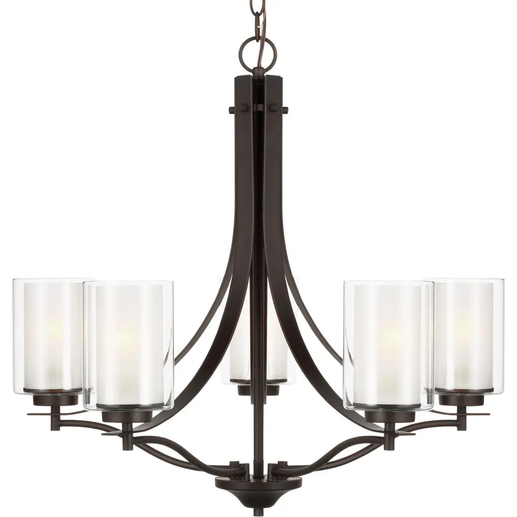 The Elmwood Park five light single tier chandelier in bronze is the perfect way to achieve your desired fashion or functional needs in your home. Elmwood Park by has clear glass tube shades with an inner white glass element that softens the light and helps cast an even glow. A cylinder of etched glass is centered within a larger cylinder of clear glass which encircles each light bulb to create this stunning visual effect. The full assortment includes three-, five-and nine-light chandeliers, a four-light linear, one-light mini pendant, a three-light pendant, a two-light semi flush which is convertible into a pendant, and one-, two-, three- and four-light bath fixtures. All fixtures offered in either a Brushed Nickel or Brushed Oil Rubbed Bronze. Incandescent and ENERGY STAR-qualified LED lamping are available; all fixtures are California Title 24 compliant.