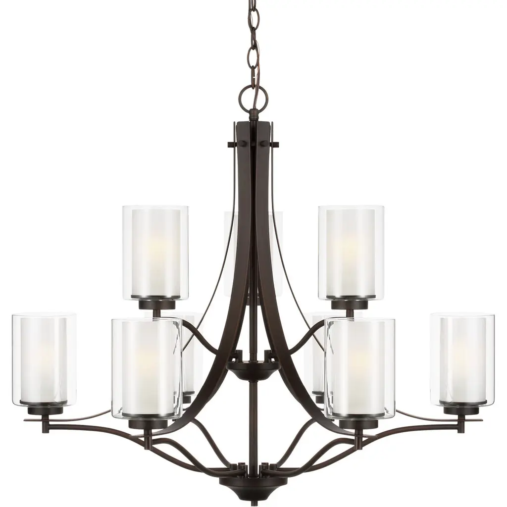 The Elmwood Park nine light multi-tier chandelier in bronze enhances the beauty of your home with ample light and style to match today's trends. Elmwood Park by has clear glass tube shades with an inner white glass element that softens the light and helps cast an even glow. A cylinder of etched glass is centered within a larger cylinder of clear glass which encircles each light bulb to create this stunning visual effect. The full assortment includes three-, five-and nine-light chandeliers, a four-light linear, one-light mini pendant, a three-light pendant, a two-light semi flush which is convertible into a pendant, and one-, two-, three- and four-light bath fixtures. All fixtures offered in either a Brushed Nickel or Brushed Oil Rubbed Bronze. Incandescent and ENERGY STAR-qualified LED lamping are available; all fixtures are California Title 24 compliant.