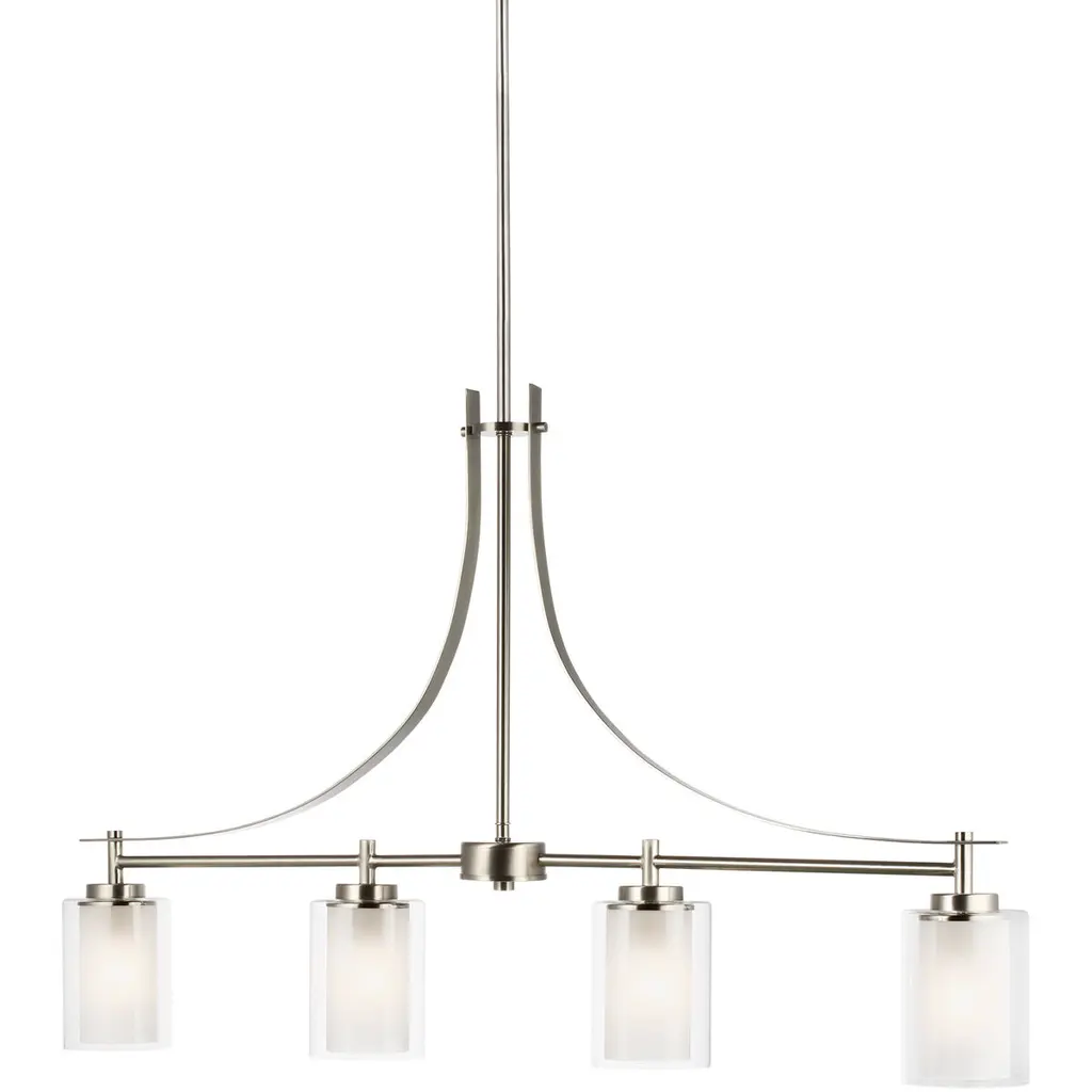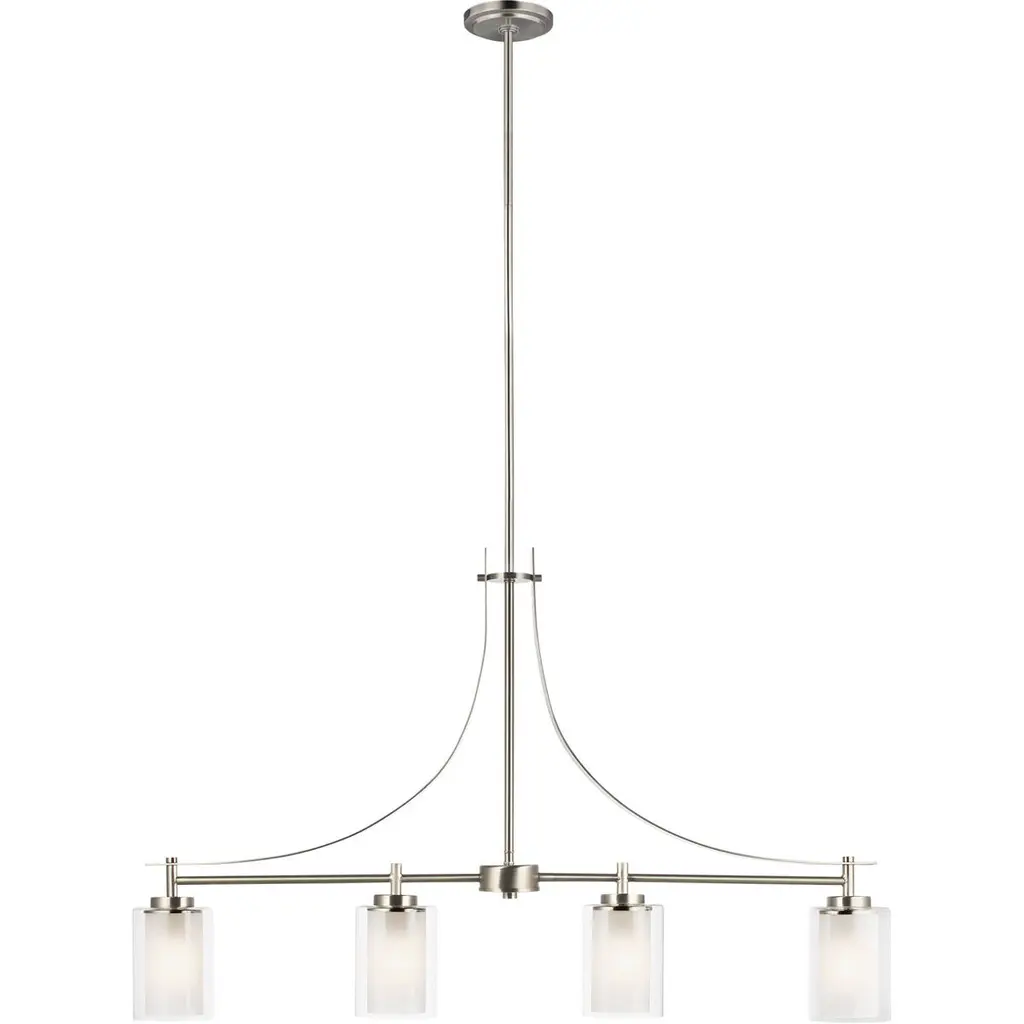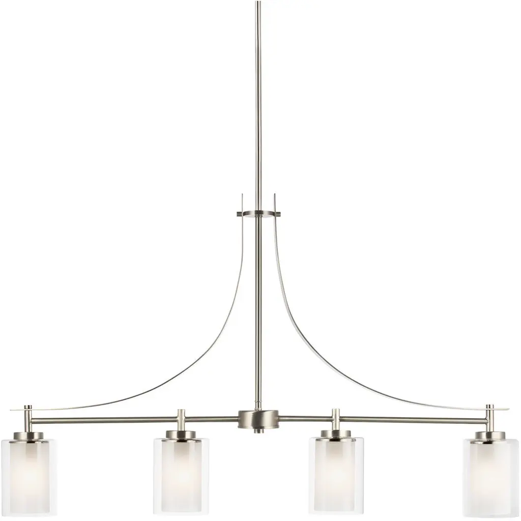 The Elmwood Park four light linear chandelier in brushed nickel is an ENERGY STAR½ qualified lighting fixture that uses LED bulbs to save you both time and money. Elmwood Park by has clear glass tube shades with an inner white glass element that softens the light and helps cast an even glow. A cylinder of etched glass is centered within a larger cylinder of clear glass which encircles each light bulb to create this stunning visual effect. The full assortment includes three-, five-and nine-light chandeliers, a four-light linear, one-light mini pendant, a three-light pendant, a two-light semi flush which is convertible into a pendant, and one-, two-, three- and four-light bath fixtures. All fixtures offered in either a Brushed Nickel or Brushed Oil Rubbed Bronze. Incandescent and ENERGY STAR-qualified LED lamping are available; all fixtures are California Title 24 compliant.