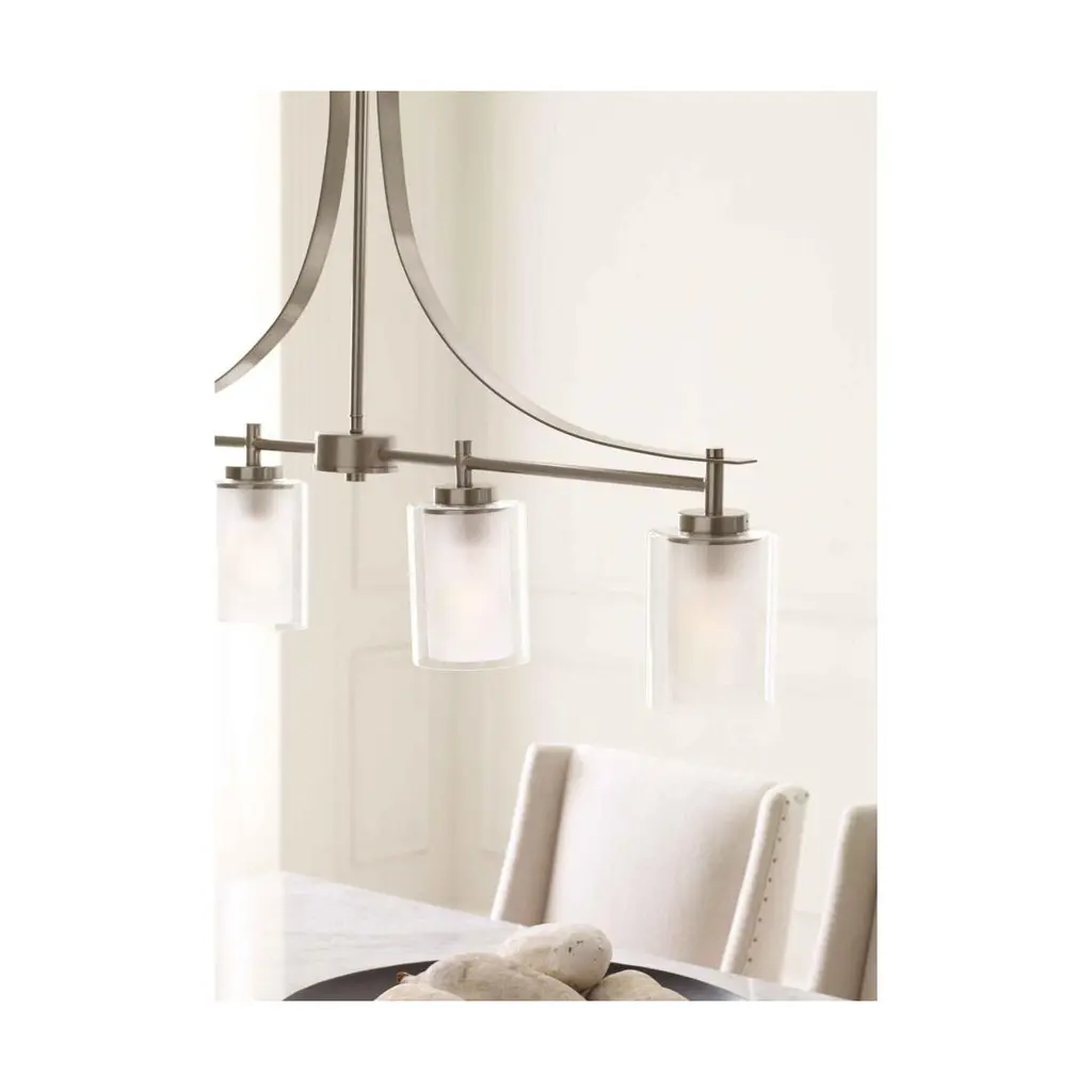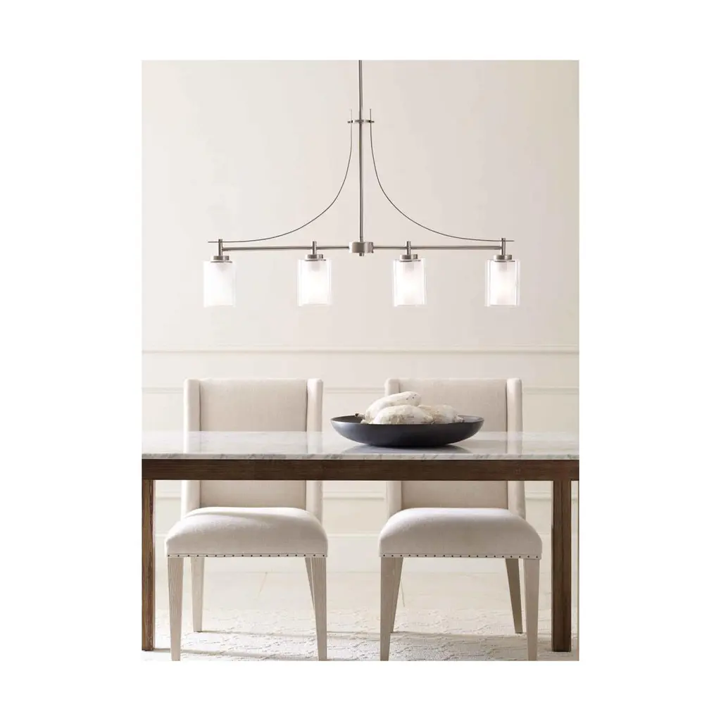 The Elmwood Park four light linear chandelier in brushed nickel is the perfect way to achieve your desired fashion or functional needs in your home. Elmwood Park by has clear glass tube shades with an inner white glass element that softens the light and helps cast an even glow. A cylinder of etched glass is centered within a larger cylinder of clear glass which encircles each light bulb to create this stunning visual effect. The full assortment includes three-, five-and nine-light chandeliers, a four-light linear, one-light mini pendant, a three-light pendant, a two-light semi flush which is convertible into a pendant, and one-, two-, three- and four-light bath fixtures. All fixtures offered in either a Brushed Nickel or Brushed Oil Rubbed Bronze. Incandescent and ENERGY STAR-qualified LED lamping are available; all fixtures are California Title 24 compliant.