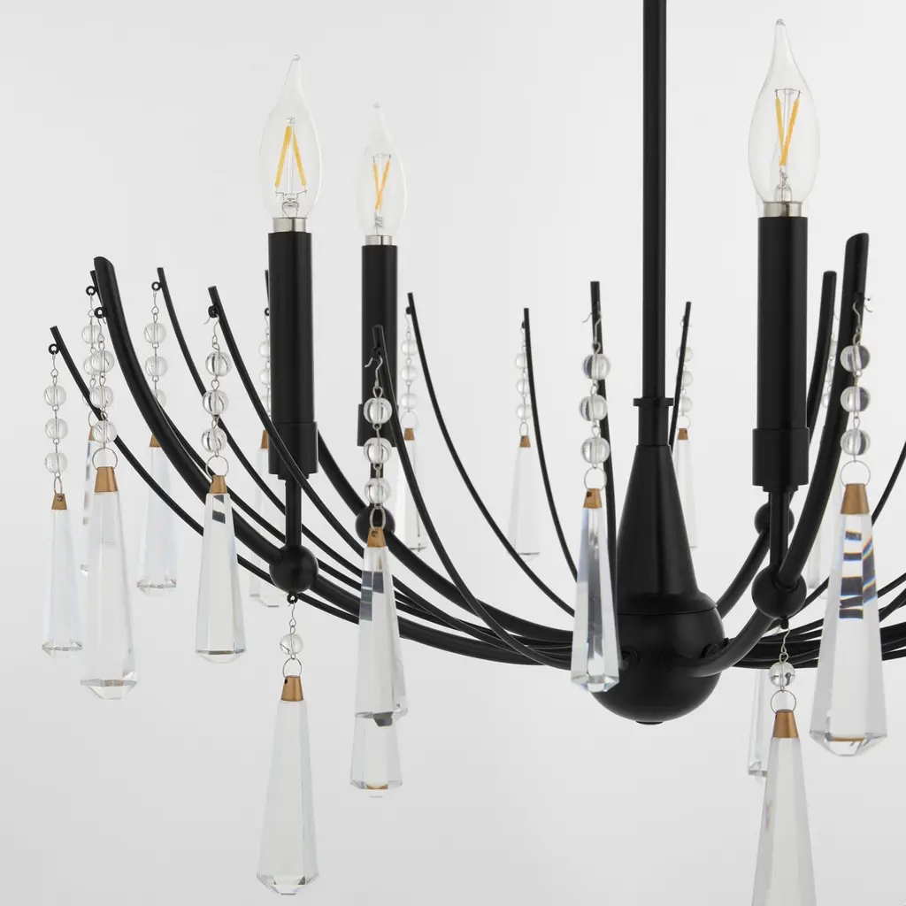 Eloise brings unexpected elegance with its bold, U-shaped design. Thick, droplet-shaped crystals hang from glass beaded strings, adding a luxurious touch. The light source filters through the various-sized arms, casting a soft, refined glow throughout the space. Available in 5-light and 6-light versions, finished in Matte Black.