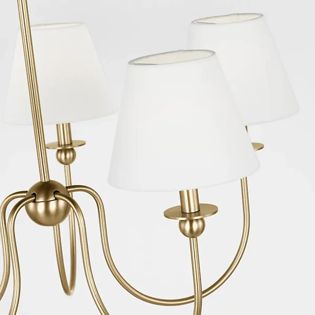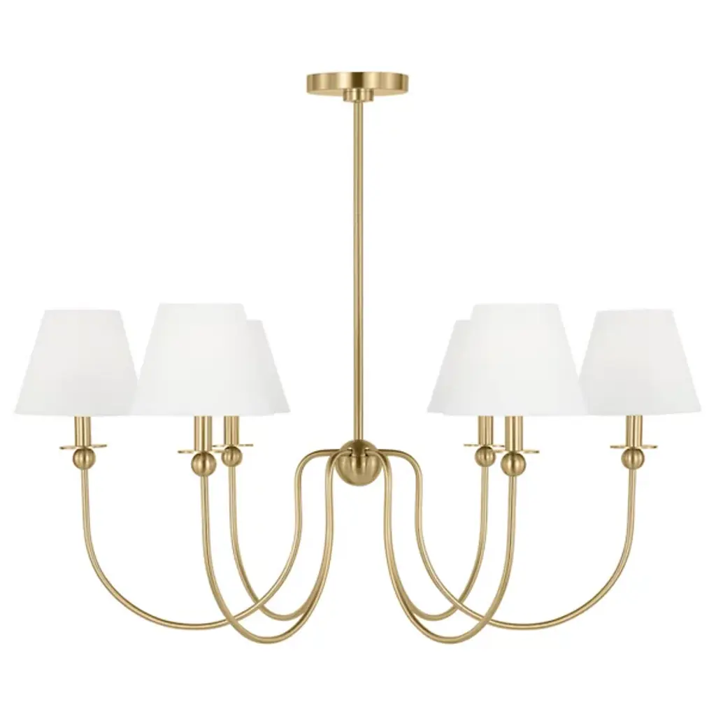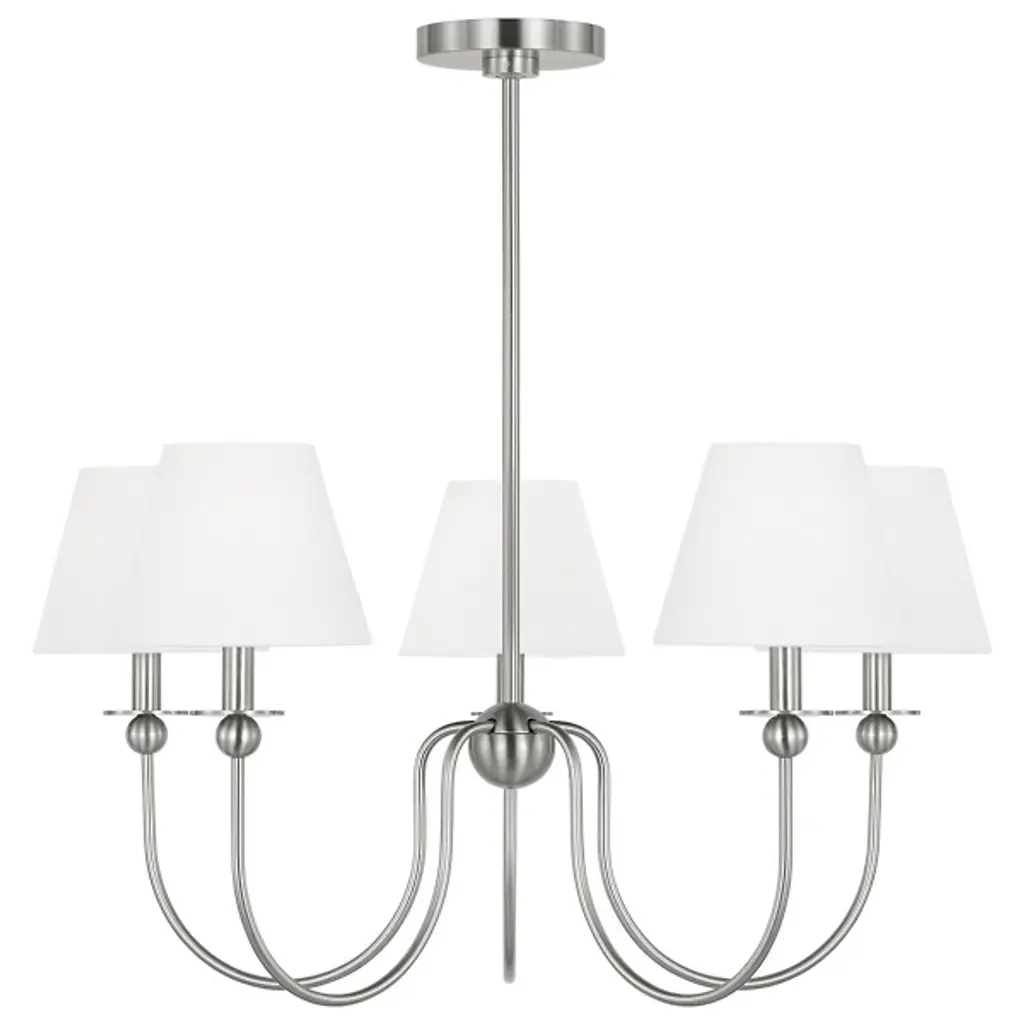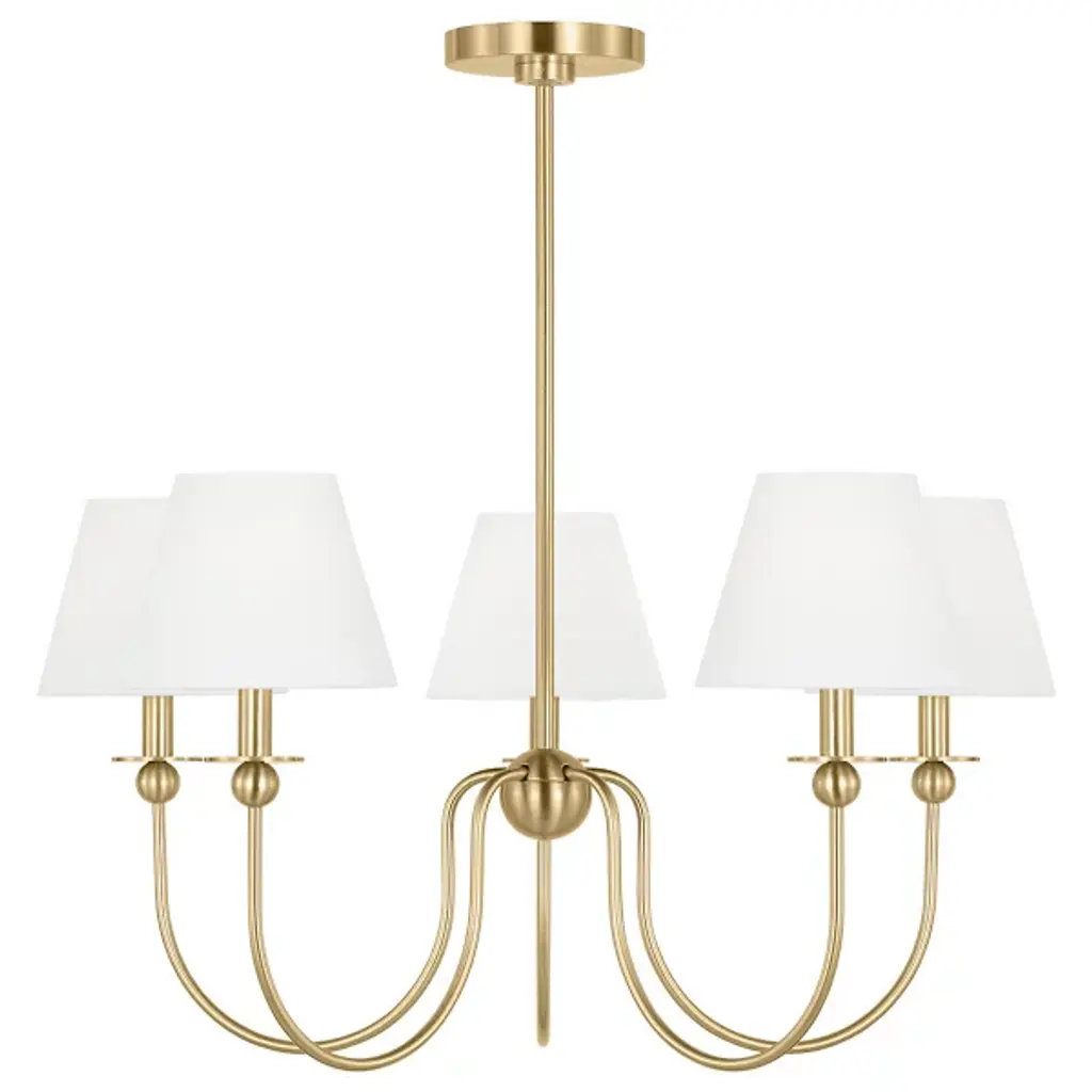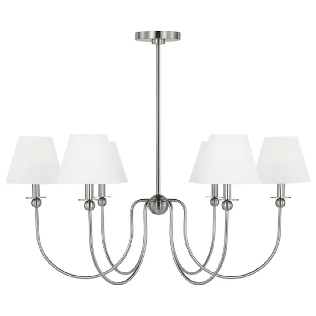 The Elsay Chandelier from Visual Comfort Studio, designed by Drew & Jonathan Scott, updates traditional lighting with gracefully curved arms that sweep out from a central sphere. The J-shaped arms create a fluid, open profile that gives this fixture an airy quality despite its substantial presence. Each arm culminates in a linen fabric shade that diffuses light pleasantly throughout dining areas, entranceways, and living rooms. Small spherical details punctuate the design, adding subtle visual interest. This dimmable suspension’s metal frame complements its fabric shades, creating a lighting solution that feels current without chasing trends.