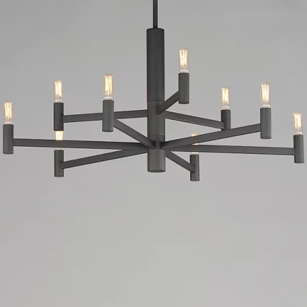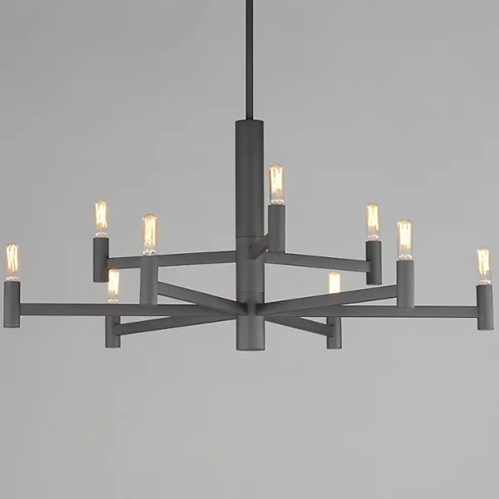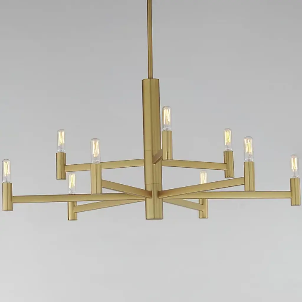 The Emana 2-Tier Chandelier by Maxim Lighting boasts a transitional design featuring straight extensions of rectilinear arms emanating from a cylindrical center housing. This configuration creates a streamlined chandelier aesthetic that seamlessly blends with various interior styles. The candelabra, fashioned in a cylindrical form, complements the overall geometry. Versatile and budget-friendly, this collection suits diverse design aesthetics. Customize with tubular lamps for an industrial or modern feel, or use torpedo-shaped ones for a contemporary chandelier update.