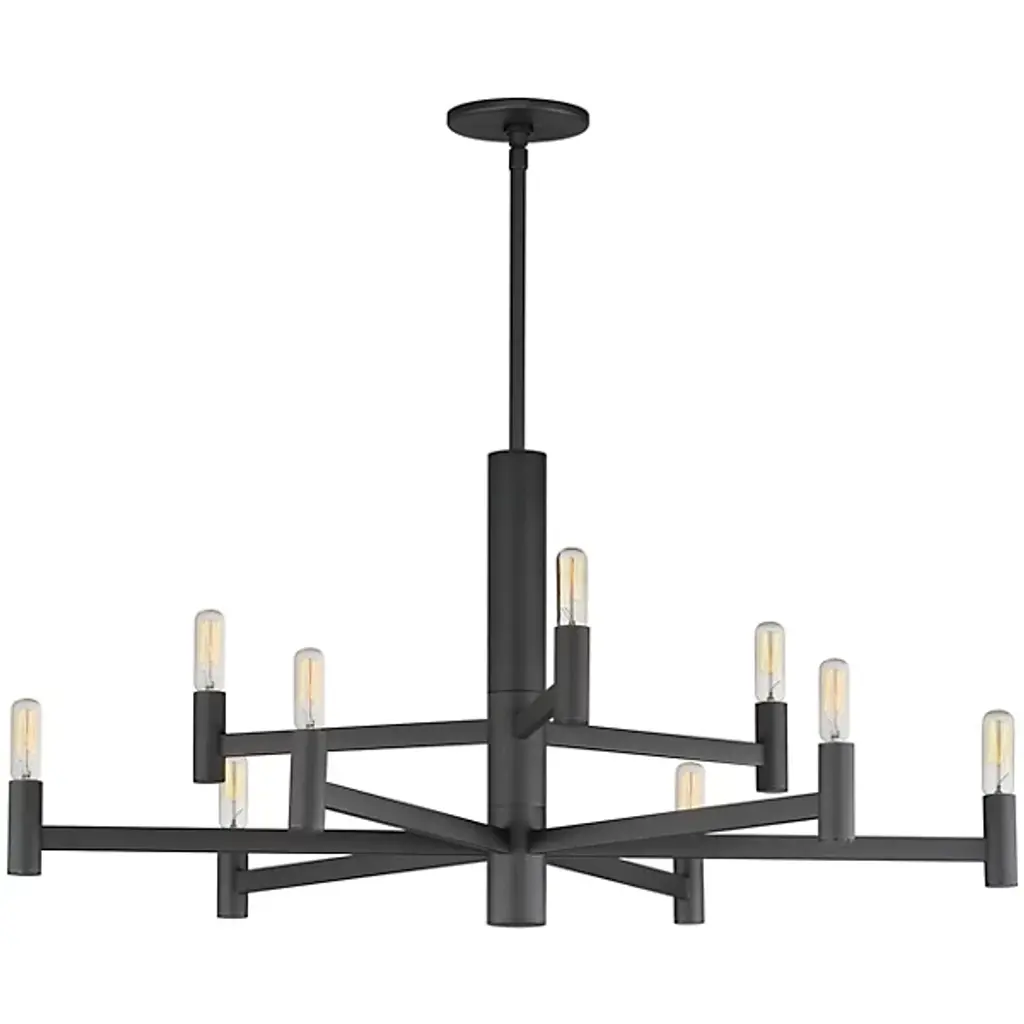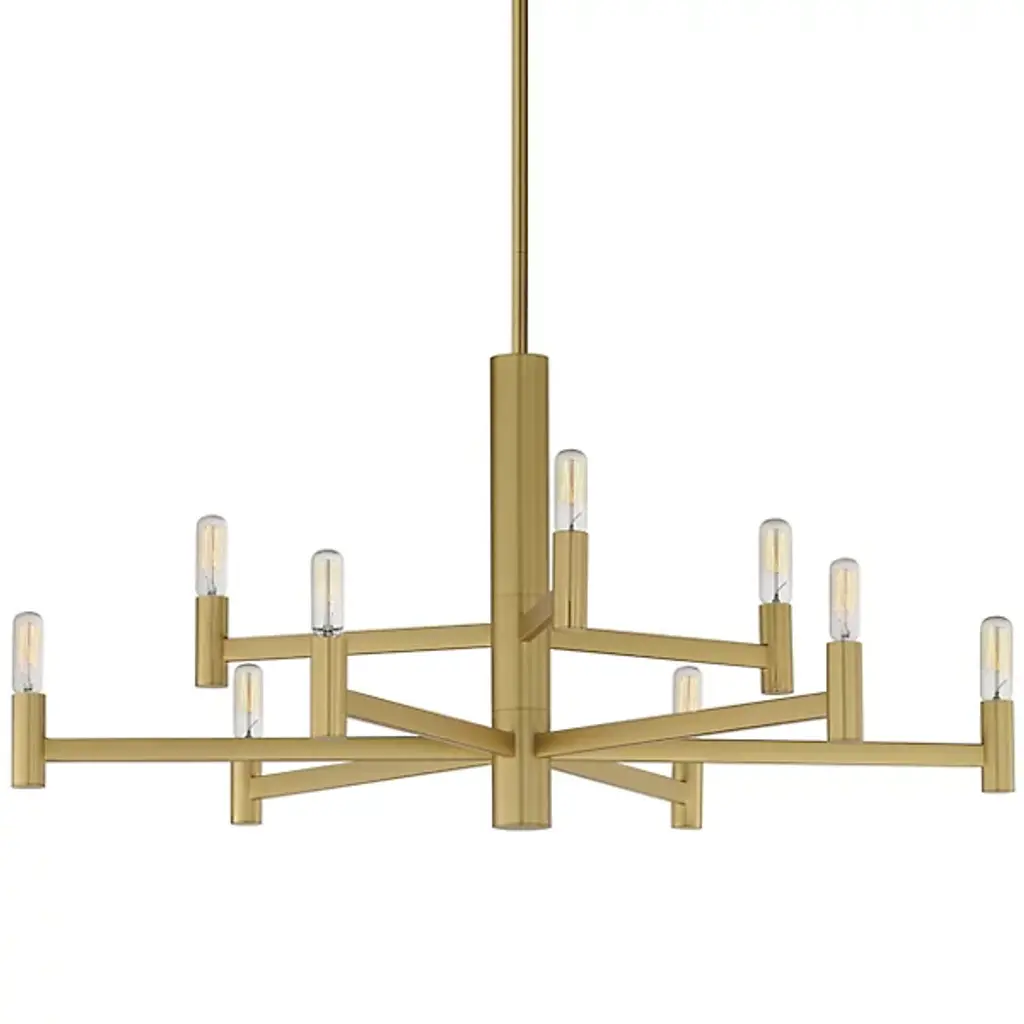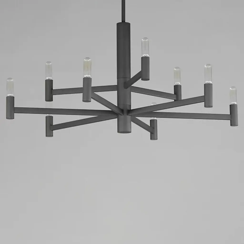 The Emana 2-Tier Chandelier by Maxim Lighting boasts a transitional design featuring straight extensions of rectilinear arms emanating from a cylindrical center housing. This configuration creates a streamlined chandelier aesthetic that seamlessly blends with various interior styles. The candelabra, fashioned in a cylindrical form, complements the overall geometry. Versatile and budget-friendly, this collection suits diverse design aesthetics. Customize with tubular lamps for an industrial or modern feel, or use torpedo-shaped ones for a contemporary chandelier update.