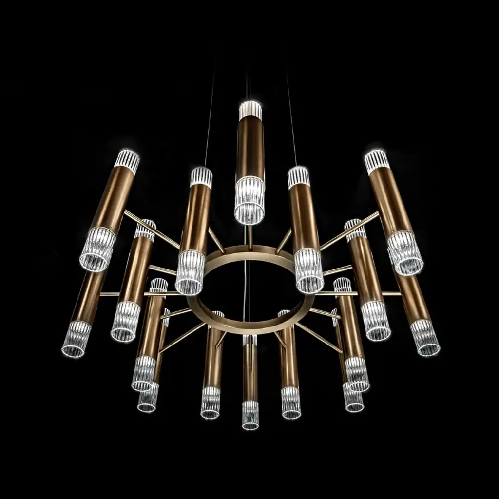 Embrace H16+16 is a metal suspension lamp.Technical featuresLight source: 32 X GU10 / 220V / MAX. 50WDimmable05 Bronze-coloured finish with premium sanded surfaceLight source not includedVariants14715 - Clear Glass14716 - Matt White Glass14717 - Frosted GlassEmbrace collection is elegant yet impactful. Capable to amaze you from different angles. Like a true piece of art. Inspired by the designer’s dedication to embrace all challenges in life. A playful composition of refined metalwork provides a powerful character, without becoming massive. Its open base and slender arms create a chandelier that is balanced in a way that is not obvious.
