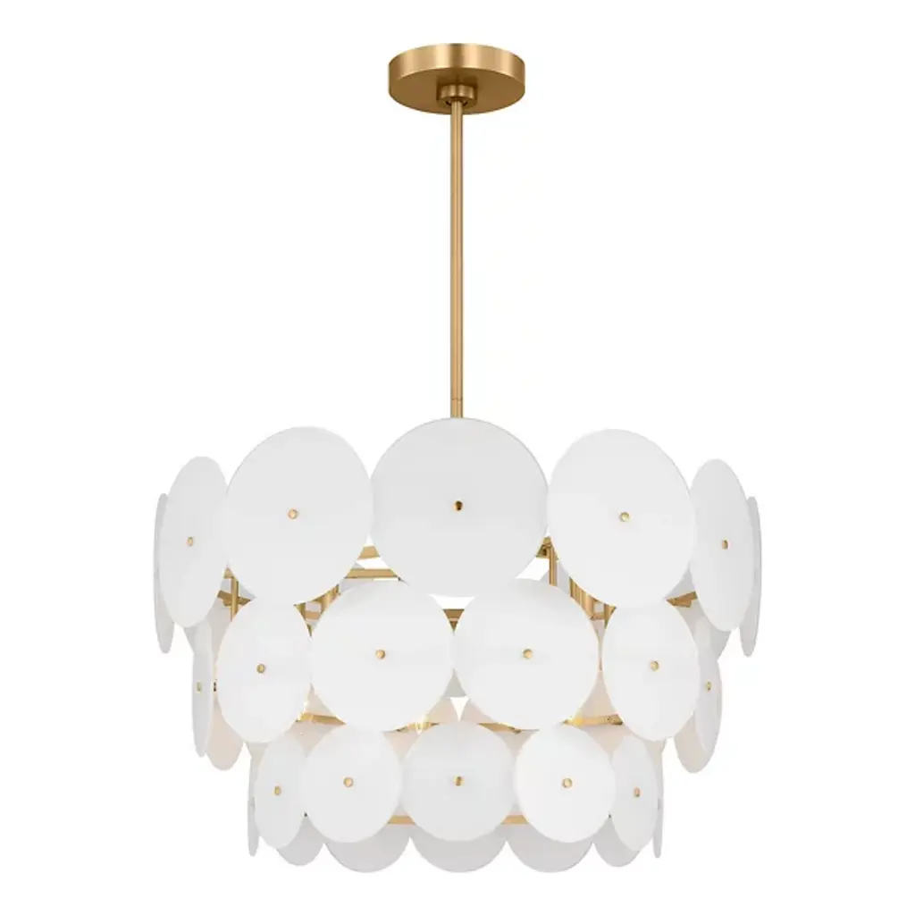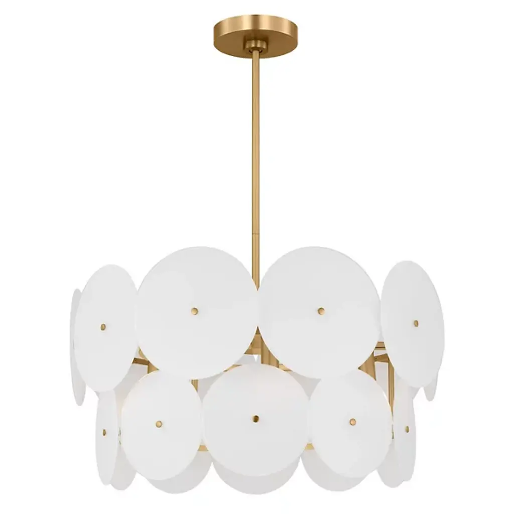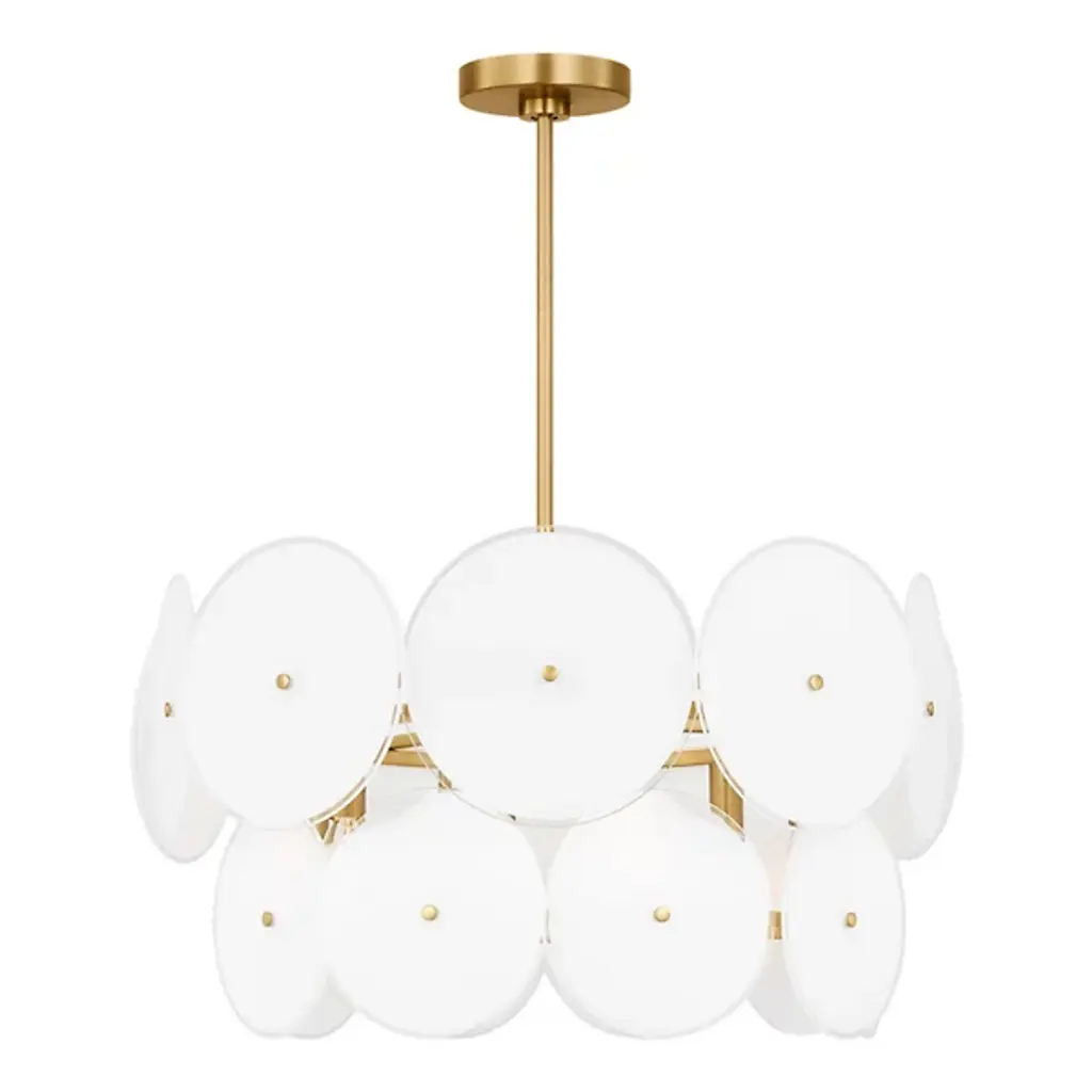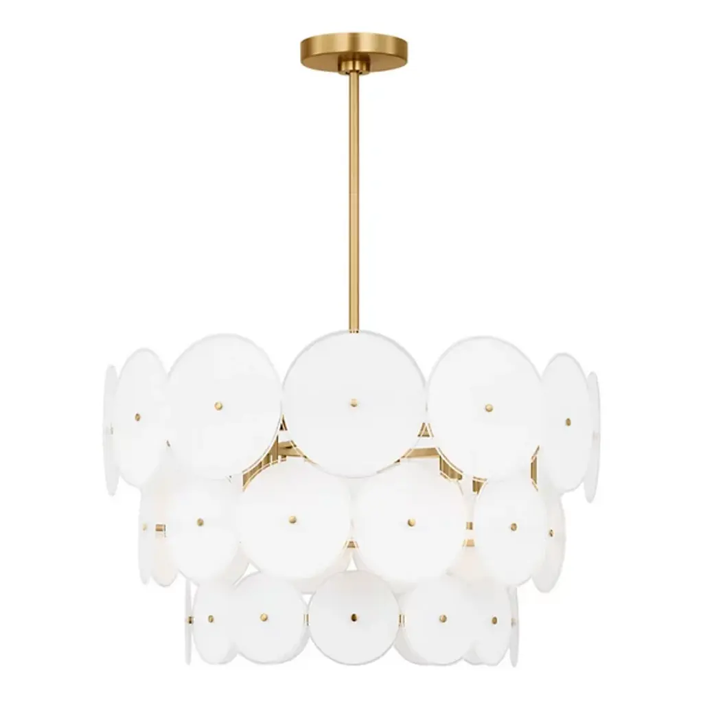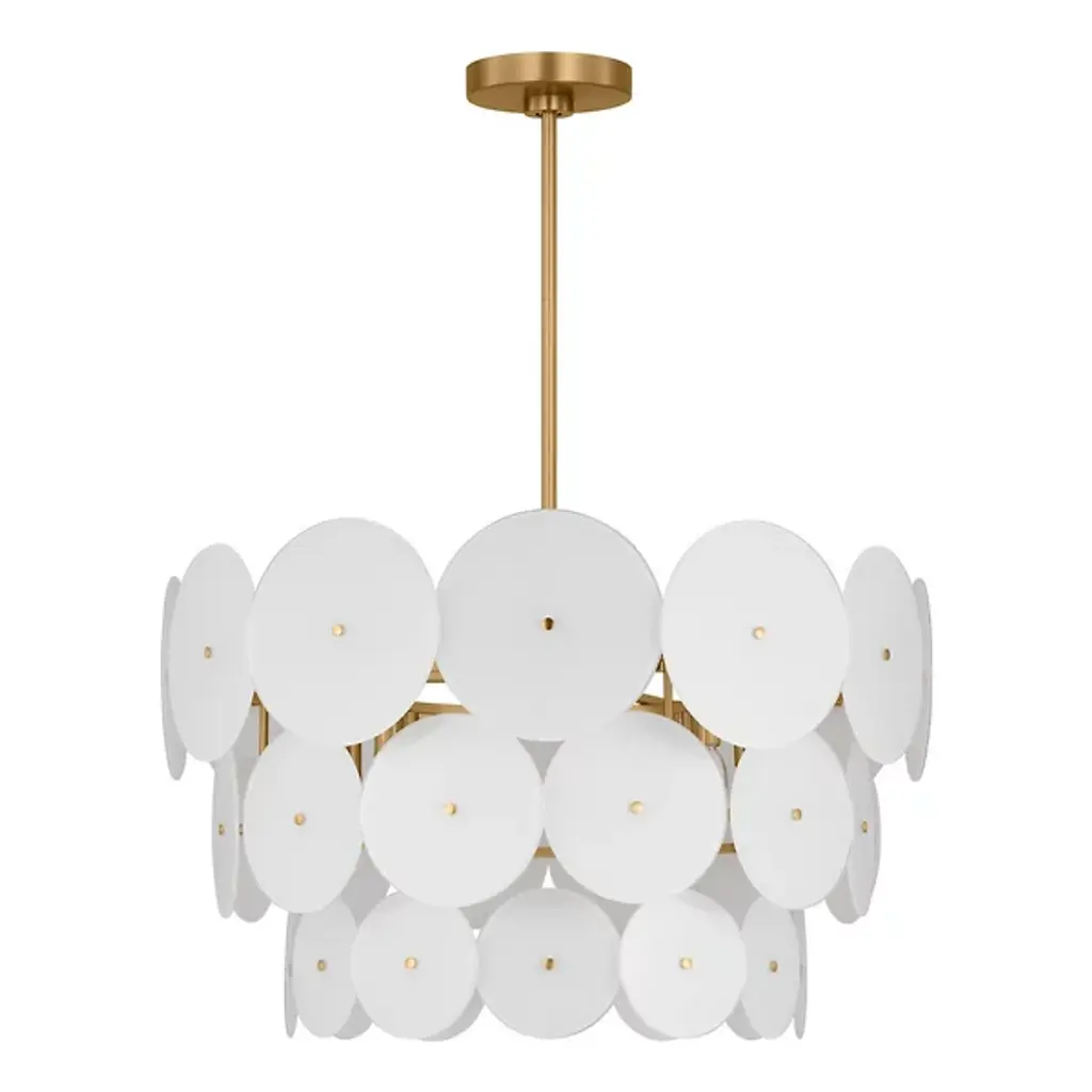 The Emery Large Chandelier from Visual Comfort Studio is a dazzling lighting centerpiece designed by Kate Spade New York. This chandelier brings a touch of mid-century modern flair to your space, combining style and functionality in a captivating way. The fixture is anchored by a downrod attached to a ceiling canopy, allowing a collection of disc-shaped shades of glass to suspend in the air and emanate LED light elegantly. Glamorously crafted, the steel framework provides strength and contributes to the chandelier’s refined aesthetic.