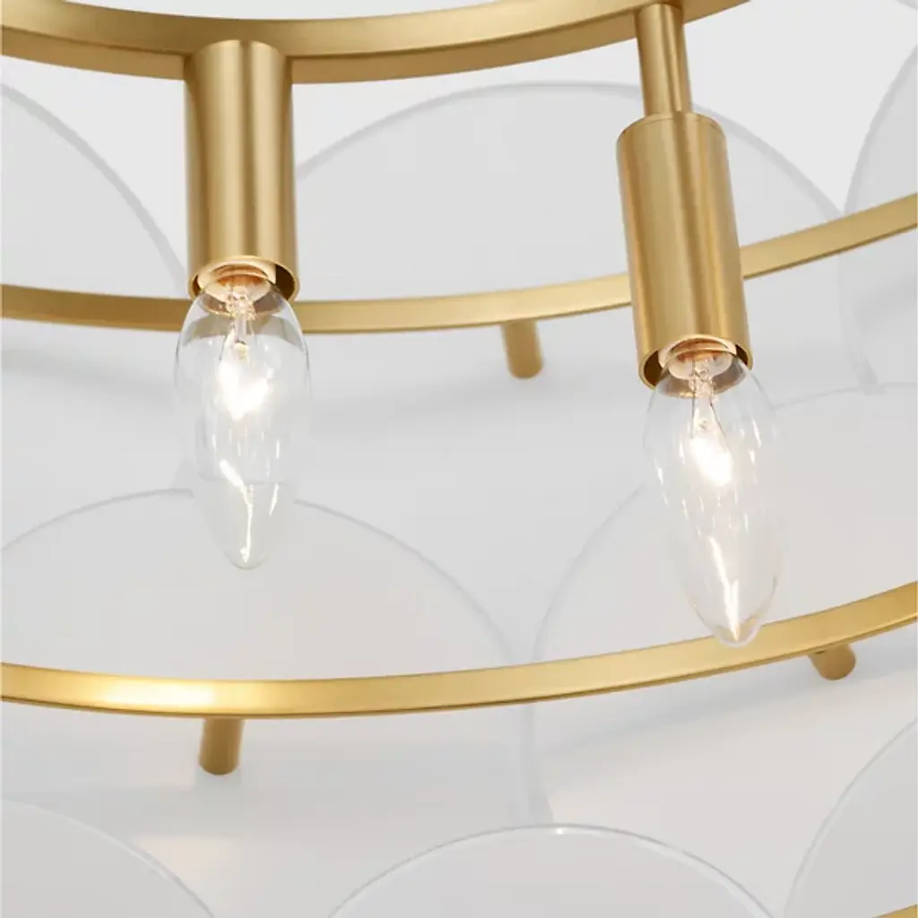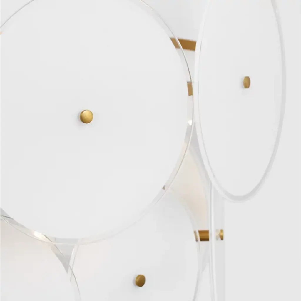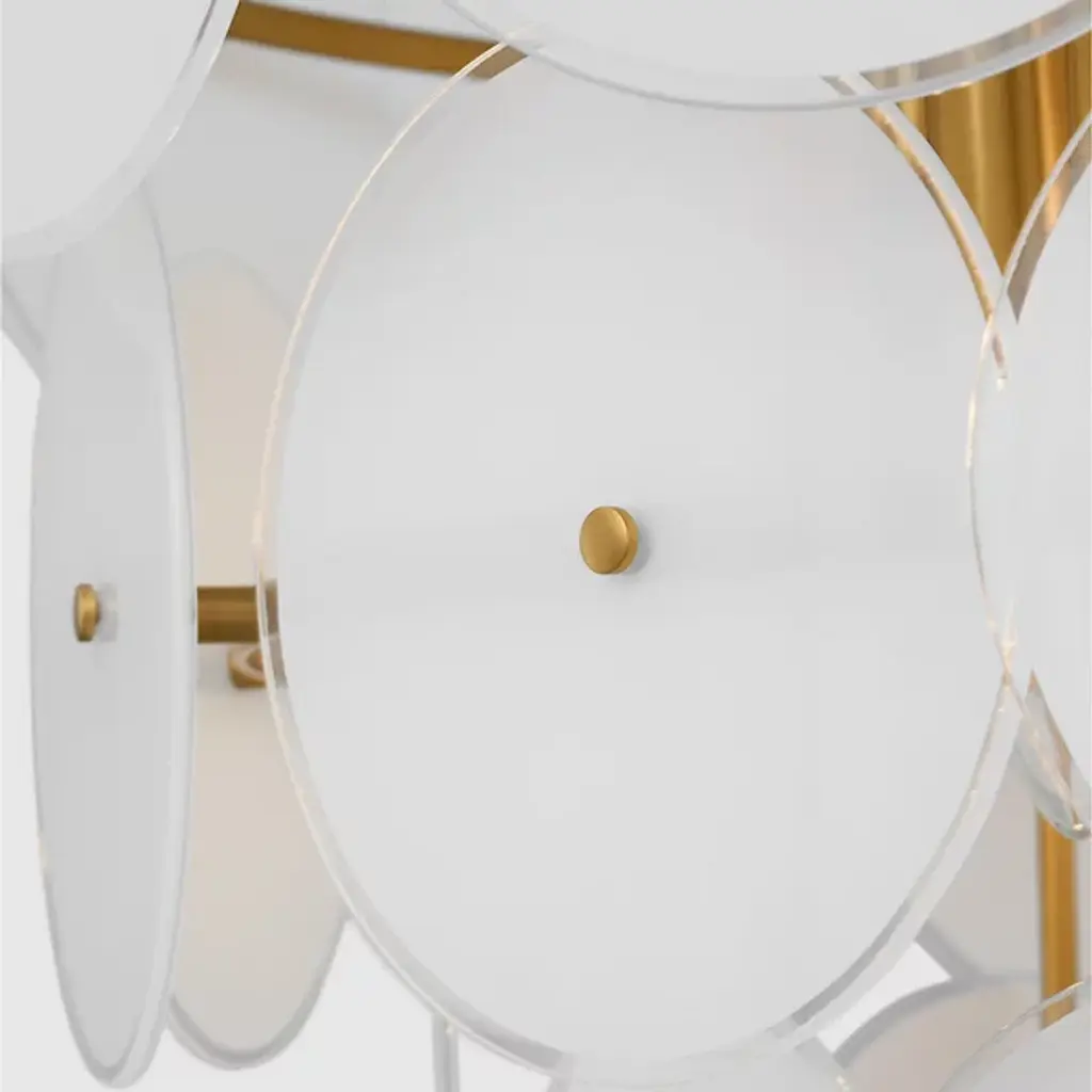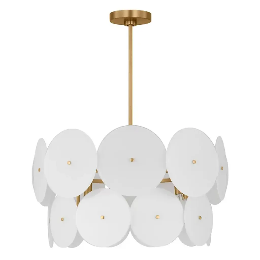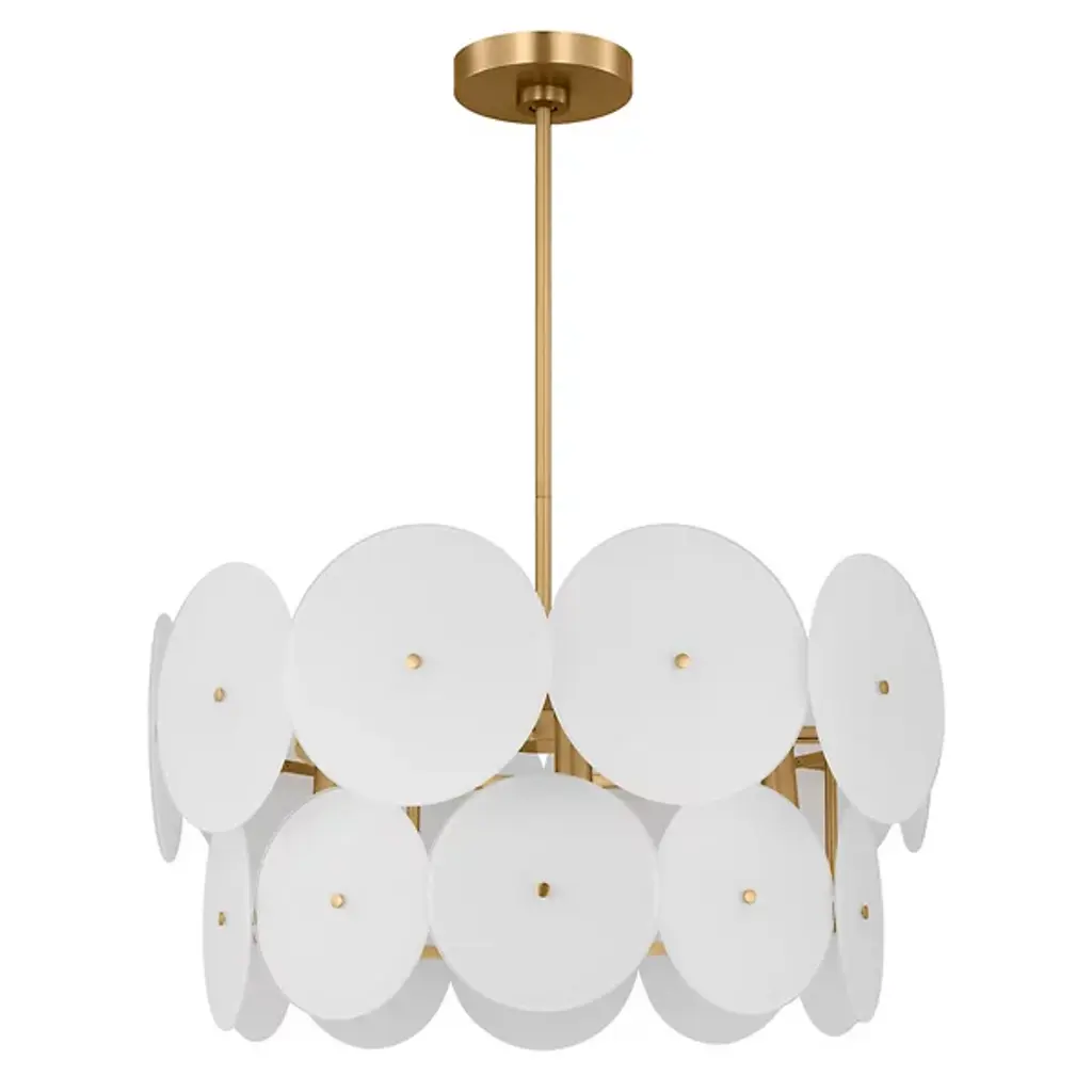 The Emery Large Chandelier from Visual Comfort Studio is a dazzling lighting centerpiece designed by Kate Spade New York. This chandelier brings a touch of mid-century modern flair to your space, combining style and functionality in a captivating way. The fixture is anchored by a downrod attached to a ceiling canopy, allowing a collection of disc-shaped shades of glass to suspend in the air and emanate LED light elegantly. Glamorously crafted, the steel framework provides strength and contributes to the chandelier’s refined aesthetic.