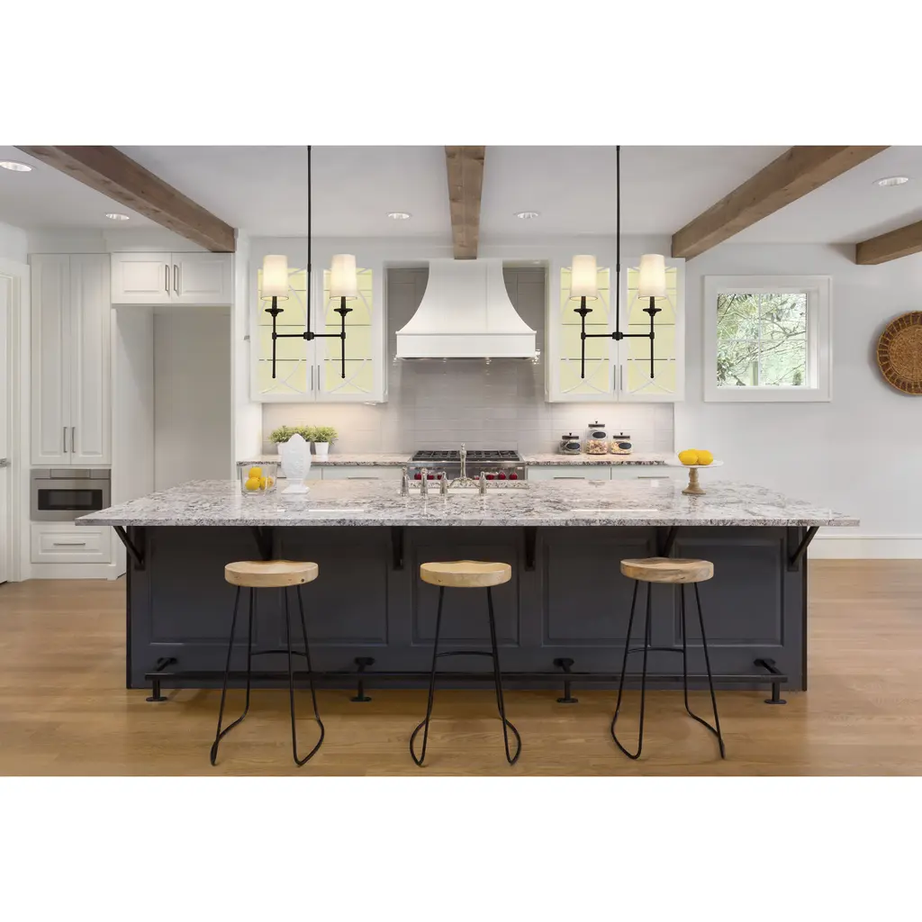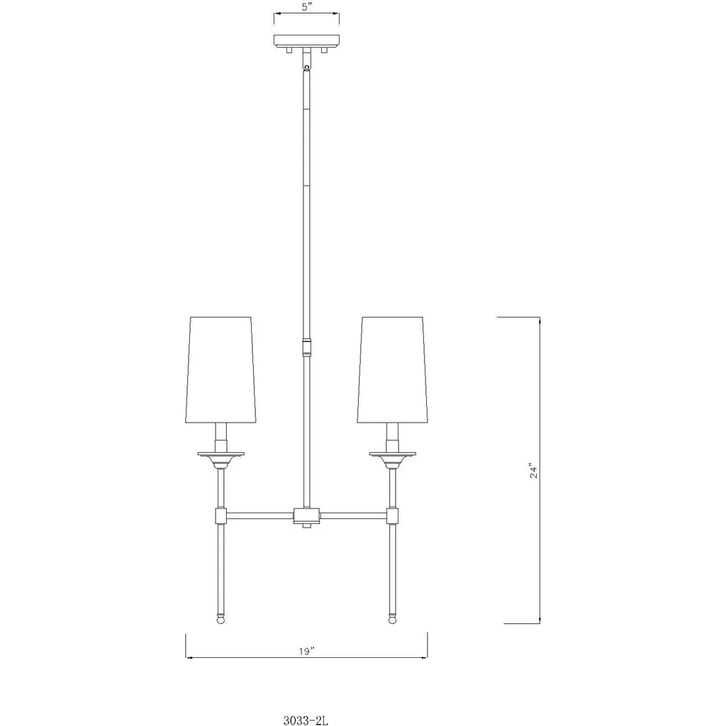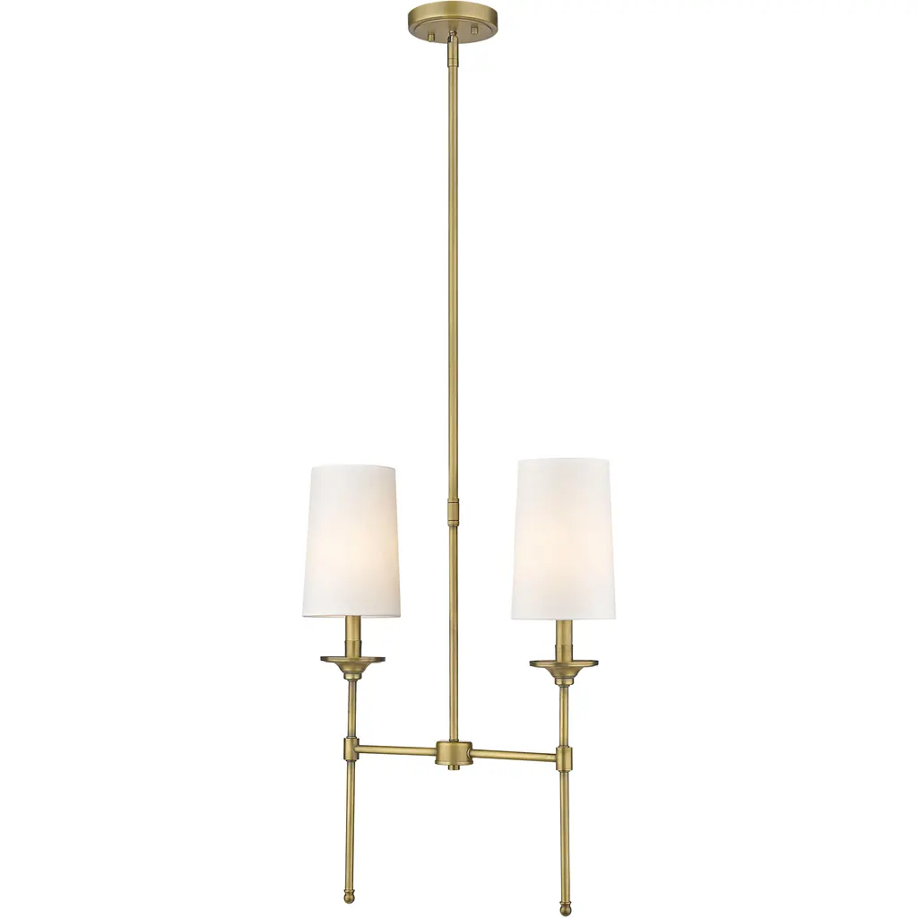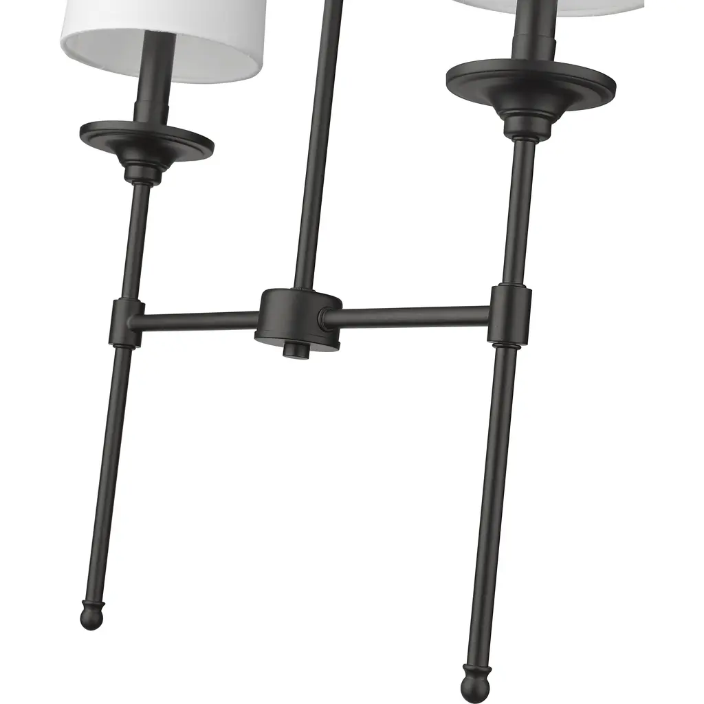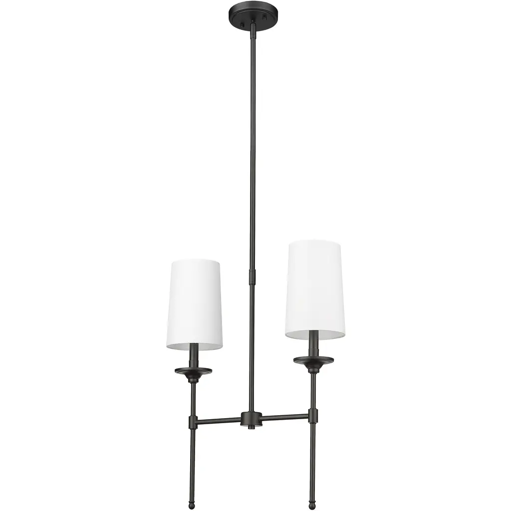 Blending long, slim lines of matte black finish metal with elegant, off-white shades, this two-light chandelier exudes tasteful and timeless style. This sleek fixture from the Emily collection enhances traditional dining décor with a classic character and a warm, inviting glow.