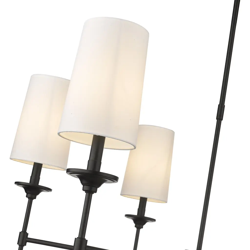 Contrasting palette elements bring a statement-making vibe that marks the Emily six-light chandelier as a prime option for infusing ambient illumination. Stemmed lamp-like lights with soft off-white shades complement a frame crafted of bold matte black finish metal, forming a sophisticated aesthetic suitable for the most custom dining rooms, living areas, and bedrooms.